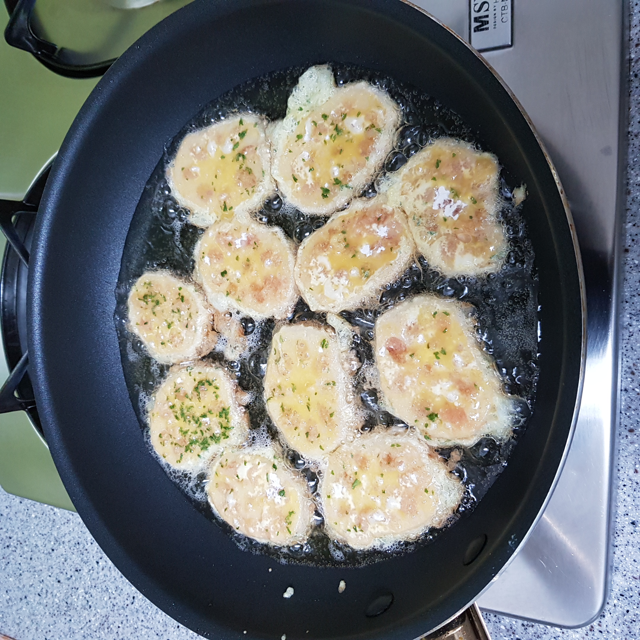 ▶프라이팬에 올리브유 두르고 약불에서 밀가루 옷 입힌 연근은 계란물에 적신 후 넣어주세요