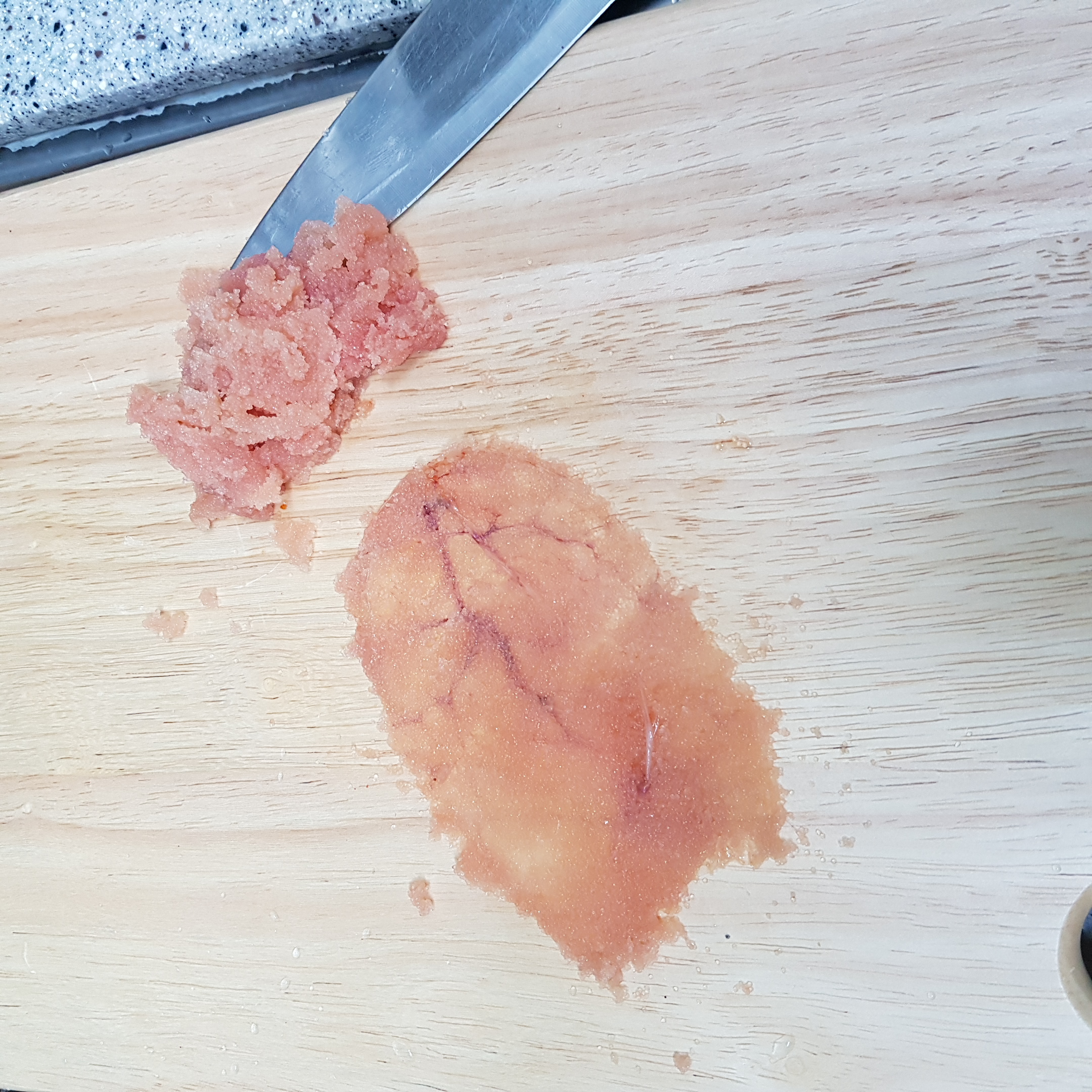 명란을 반으로 가른 후 칼 등으로 알과 껍질을 분리해주세요 껍질을 분리해 주면 따로 주물 필요는 없답니다