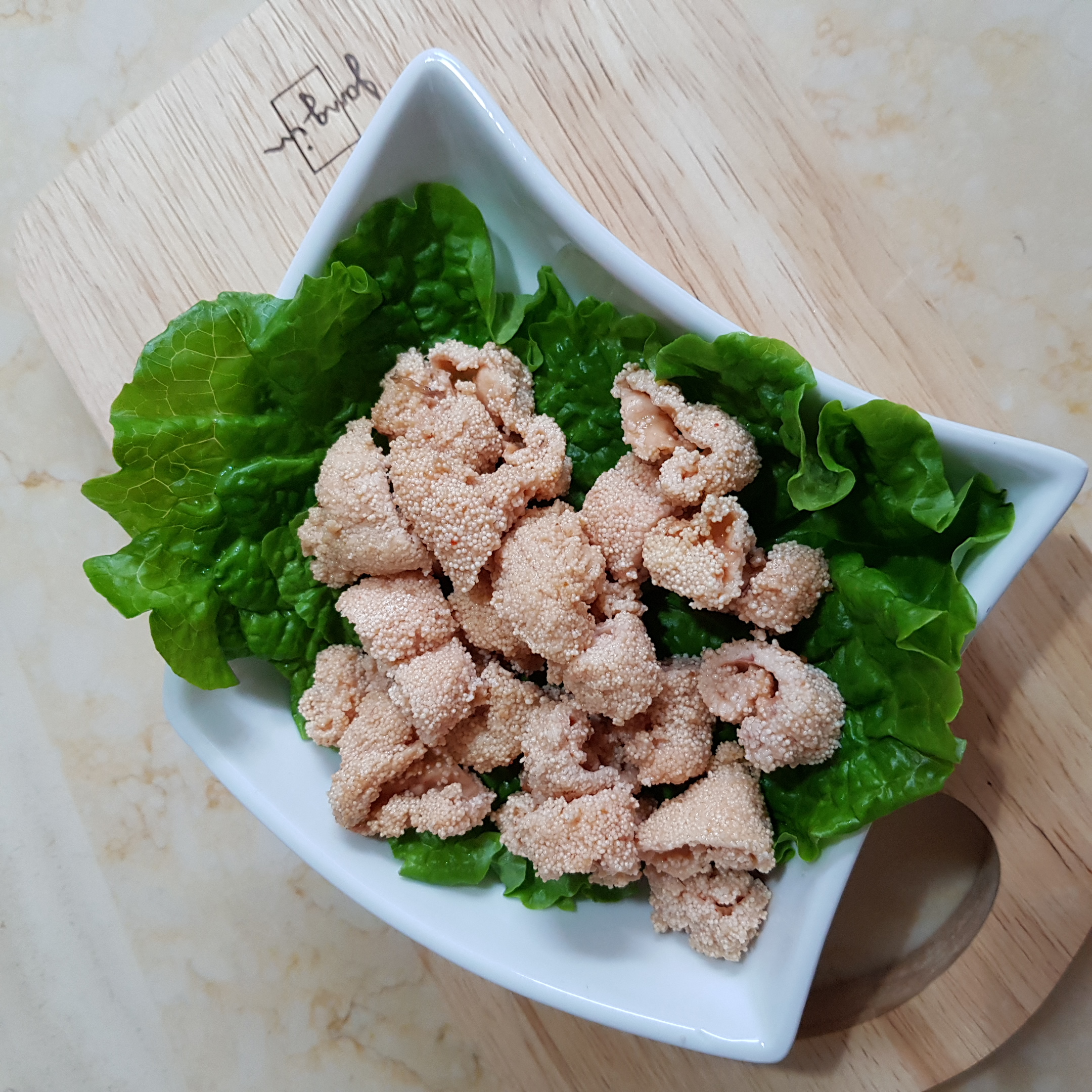 ▶ 튀겨낸 명란 껍질은 잘게 썰어주세요 저염 명란젓인데도 짠맛이 강해 약간의 밀가루를 묻혀 튀겨주는 것도 괜찮을 것 같아요 삼겹살을 구워 명란껍질튀김을 올려 먹으니 정말 맛있더라고요 명란껍질튀김만 따로 해서 삼겹살 먹을 때 같이 먹는 것을 강력히 추천합니다^^