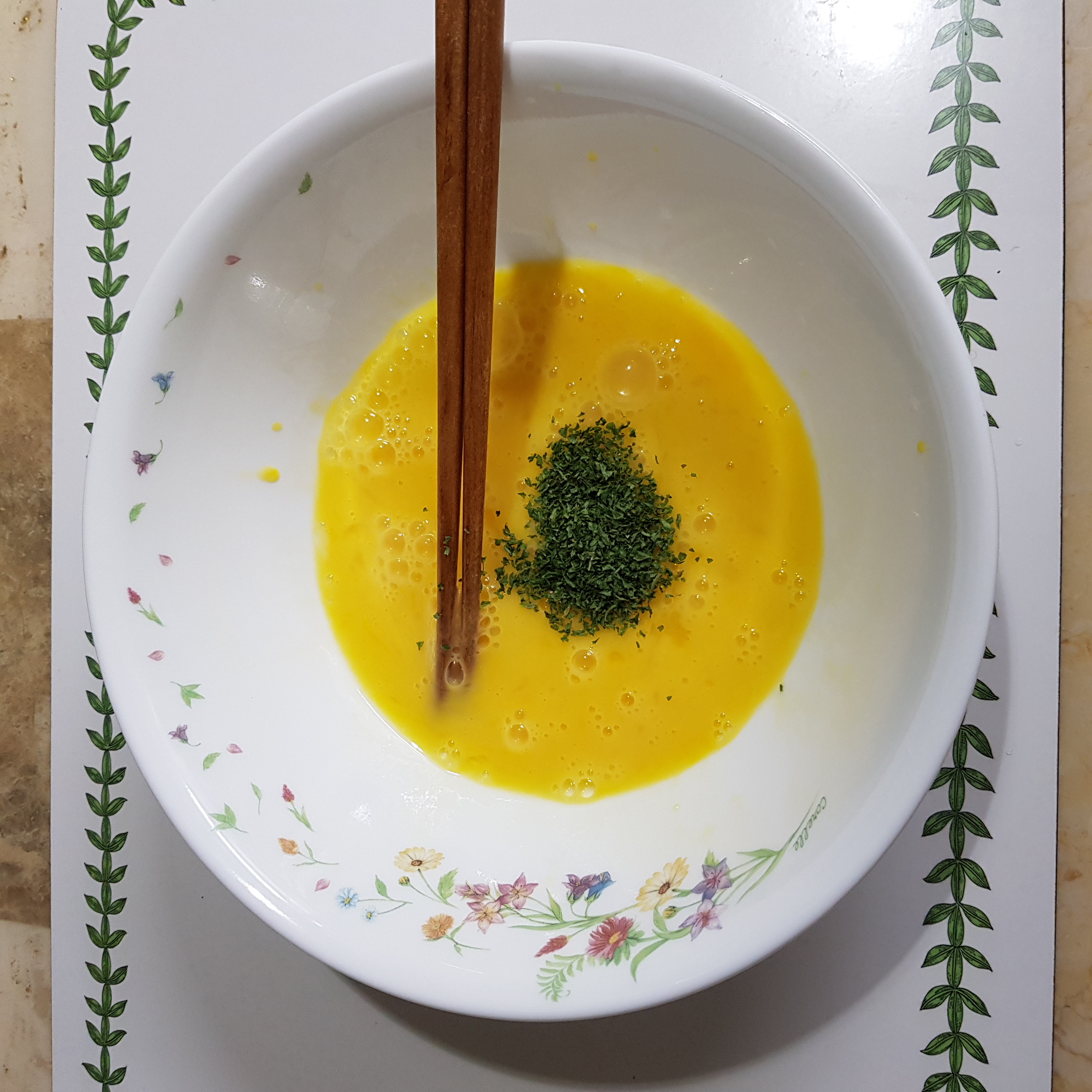 ▶ 데친 연근 물기를 제거하는 동안 계란 2개를 파슬리가루 1티스푼 넣고 잘 풀어주세요 파슬리가루는 생략하셔도 무방합니다
