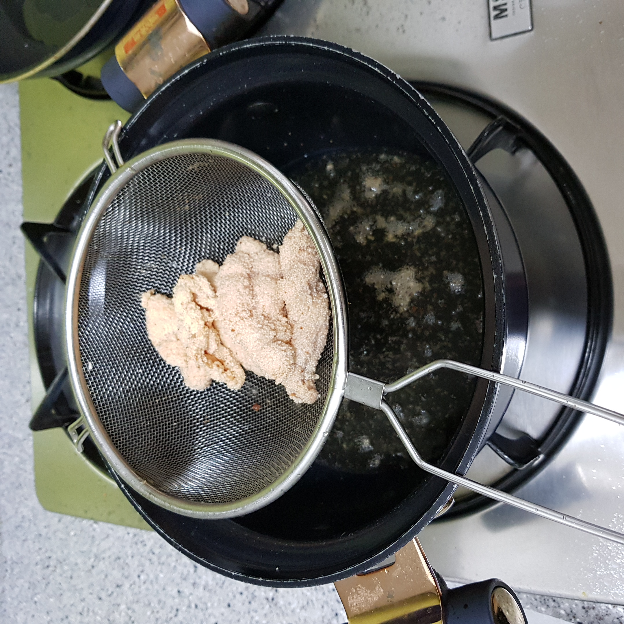 ▶ 살짝 튀긴 명란 껍질은 채반에 받쳐 기름을 빼주세요 기름 온도가 너무 높으면 빨리 타버려서 저는 낮은 온도에서 튀겨주었어요