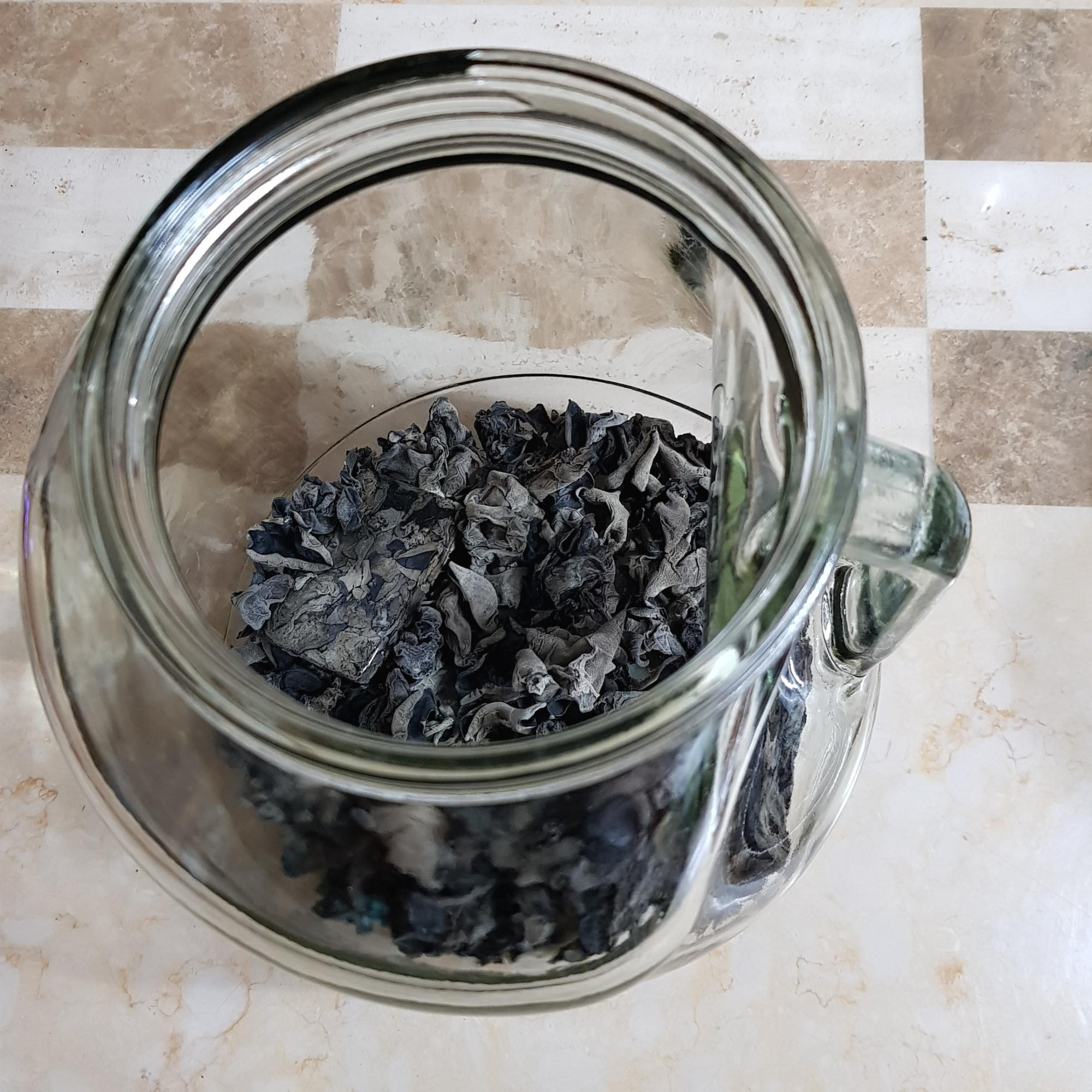 ▶ 소독한 유리병에 목이버섯을 넣어주세요 참고로 목이버섯을 먼저 넣었더니 목이버섯이 많이 불어나 다른 버섯에 담금주용 술이 잘 담기지 않네요 영지버섯, 표고버섯, 목이버섯 순서로 넣어주거나 잘 불어나는 목이버섯 양을 좀 줄이고 나머지 두 버섯의 양을 늘려 비율을 맞추면 더 좋을 것 같아요