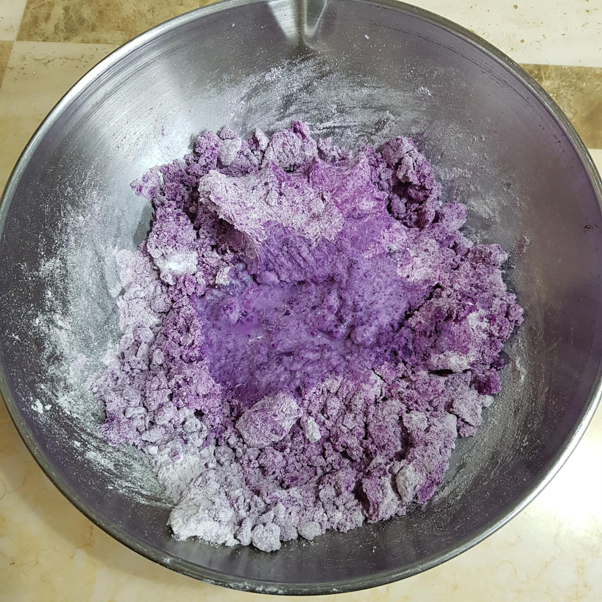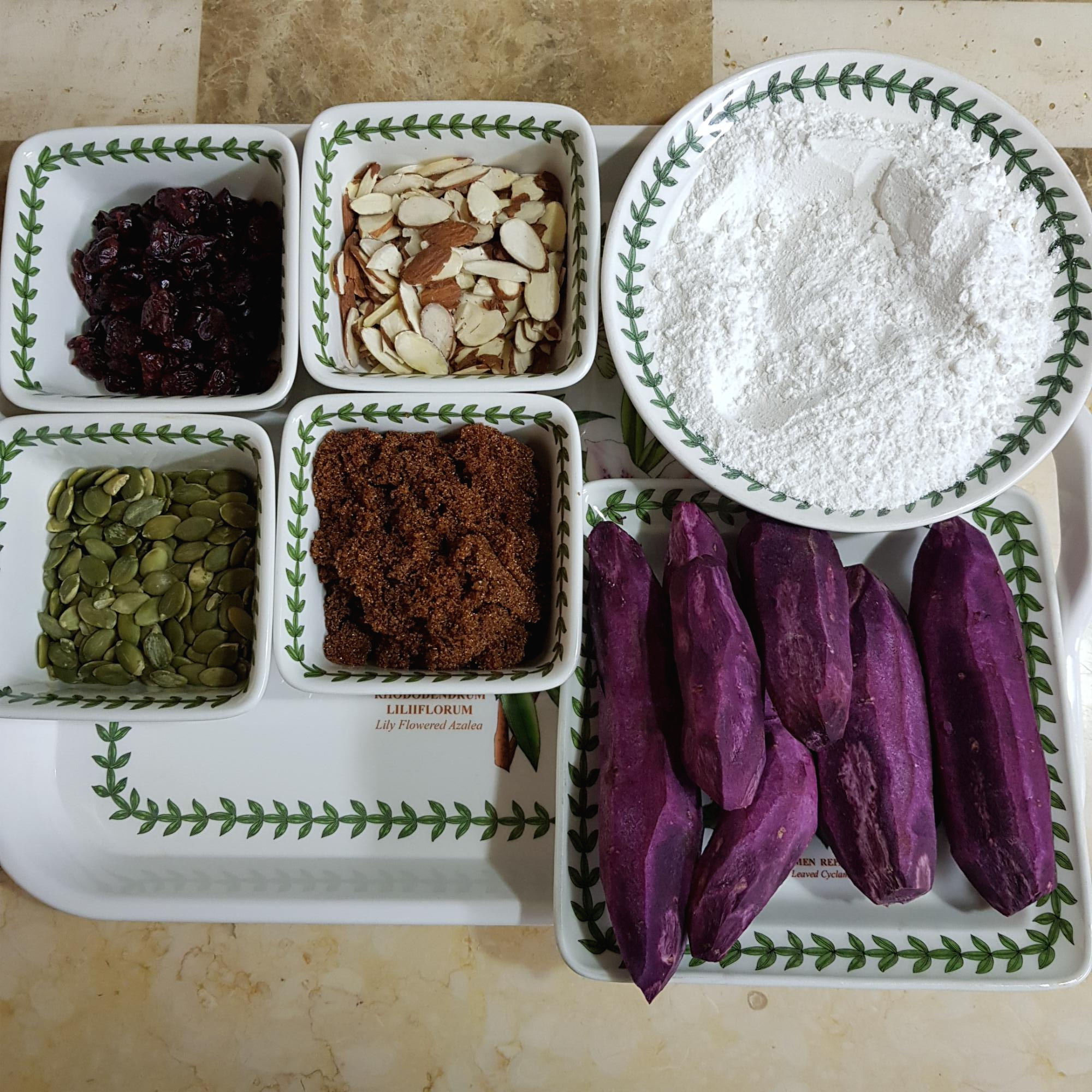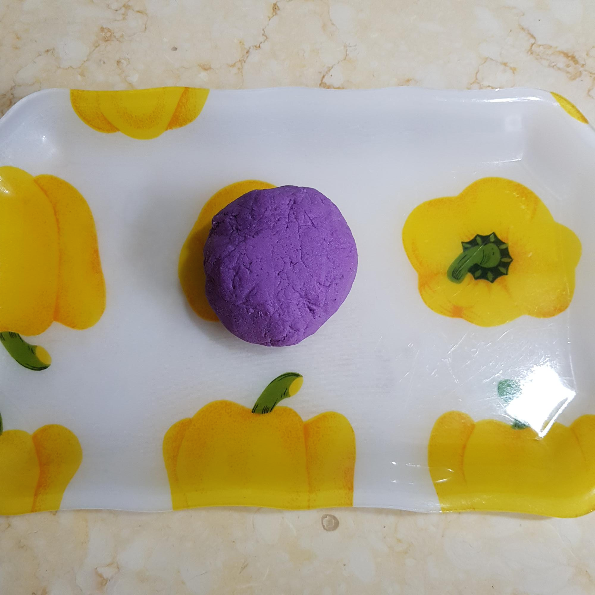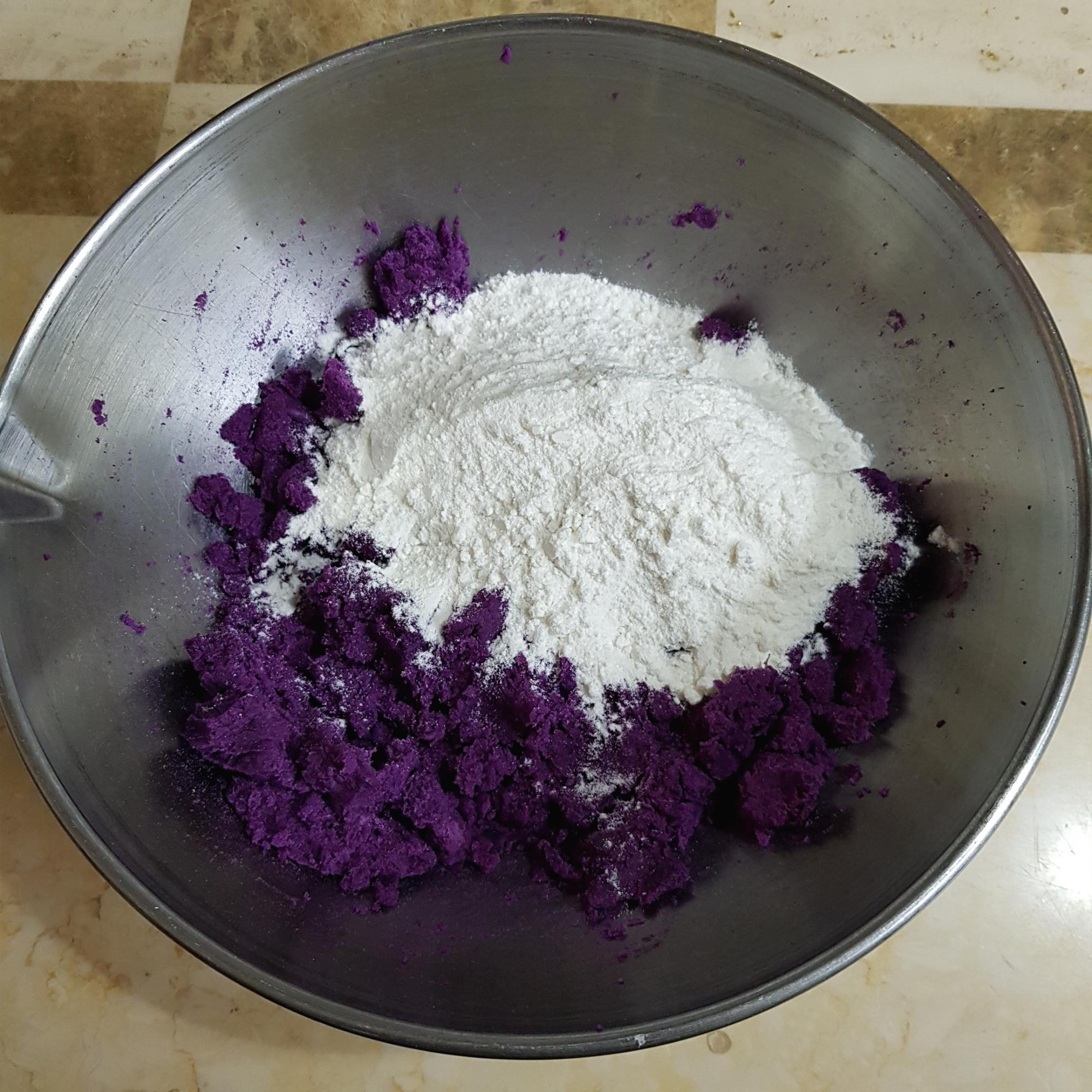 자색고구마 500g, 찹쌀가루 200g, 고운 소금 1 티스푼, 생수 1컵(고구마 수분상태에 따라 생수량 조절), 식용유 약간