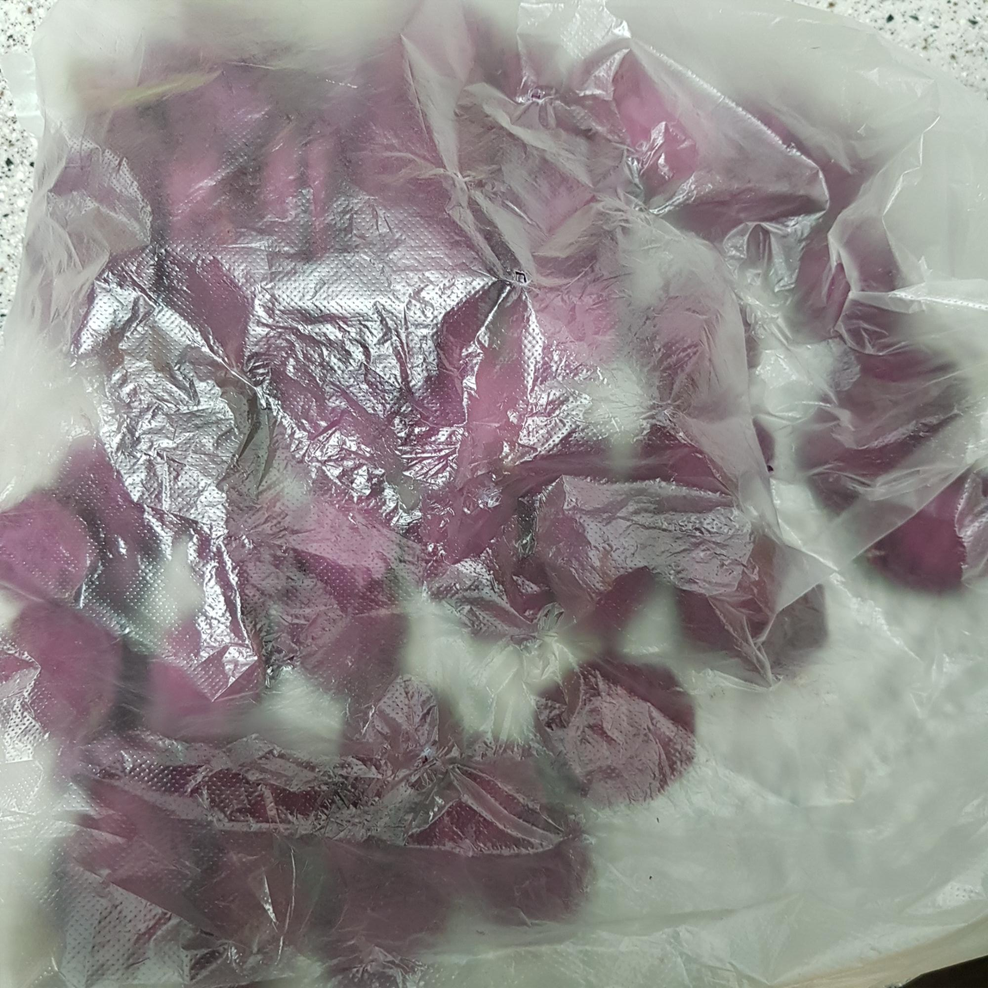 ▶ 잘게 썬 고구마는 일회용 비닐안에 넣고 입구 부분은 묶어주고 위로 보는 쪽의 비닐 한 면에다 구명을 5~6군데 뚫어주세요