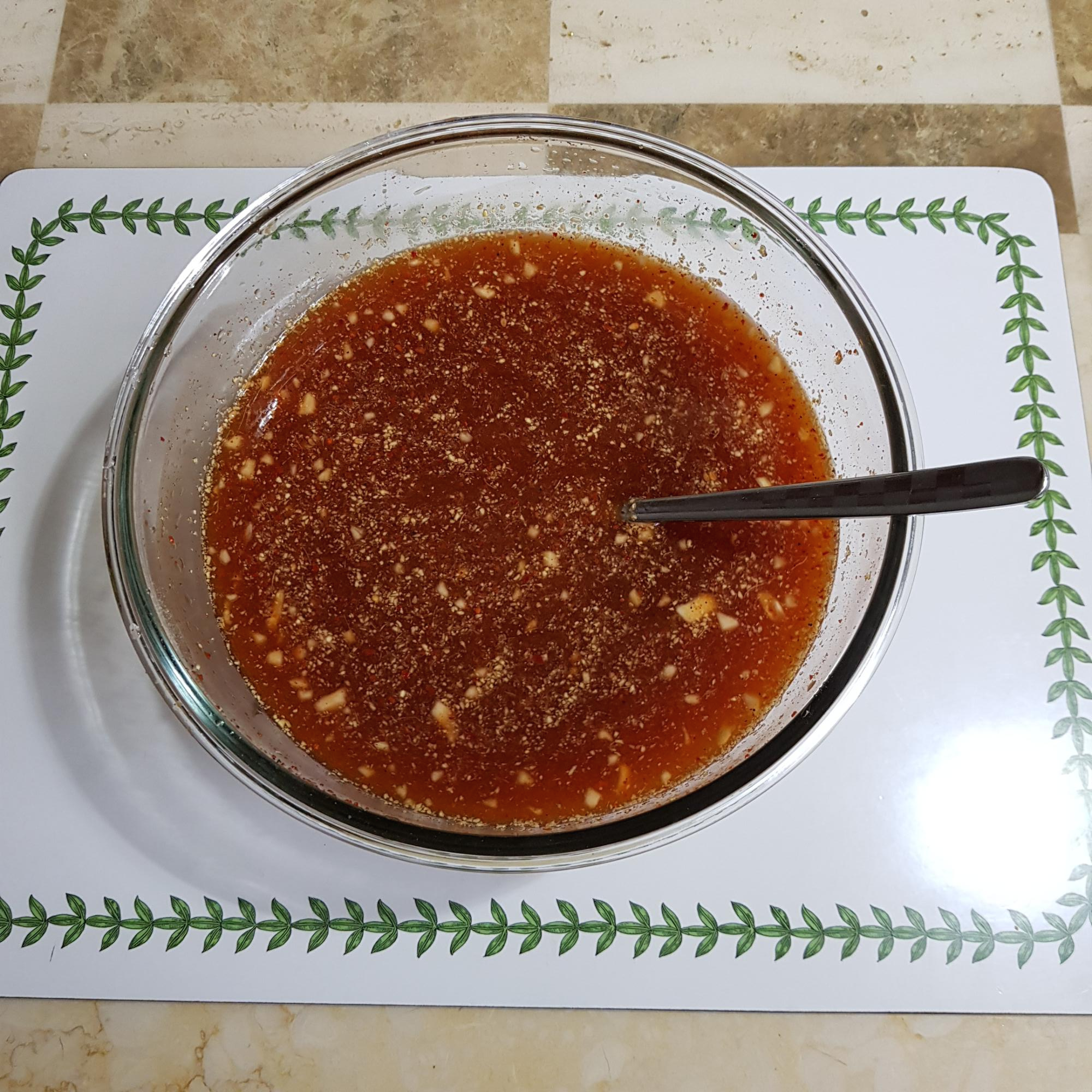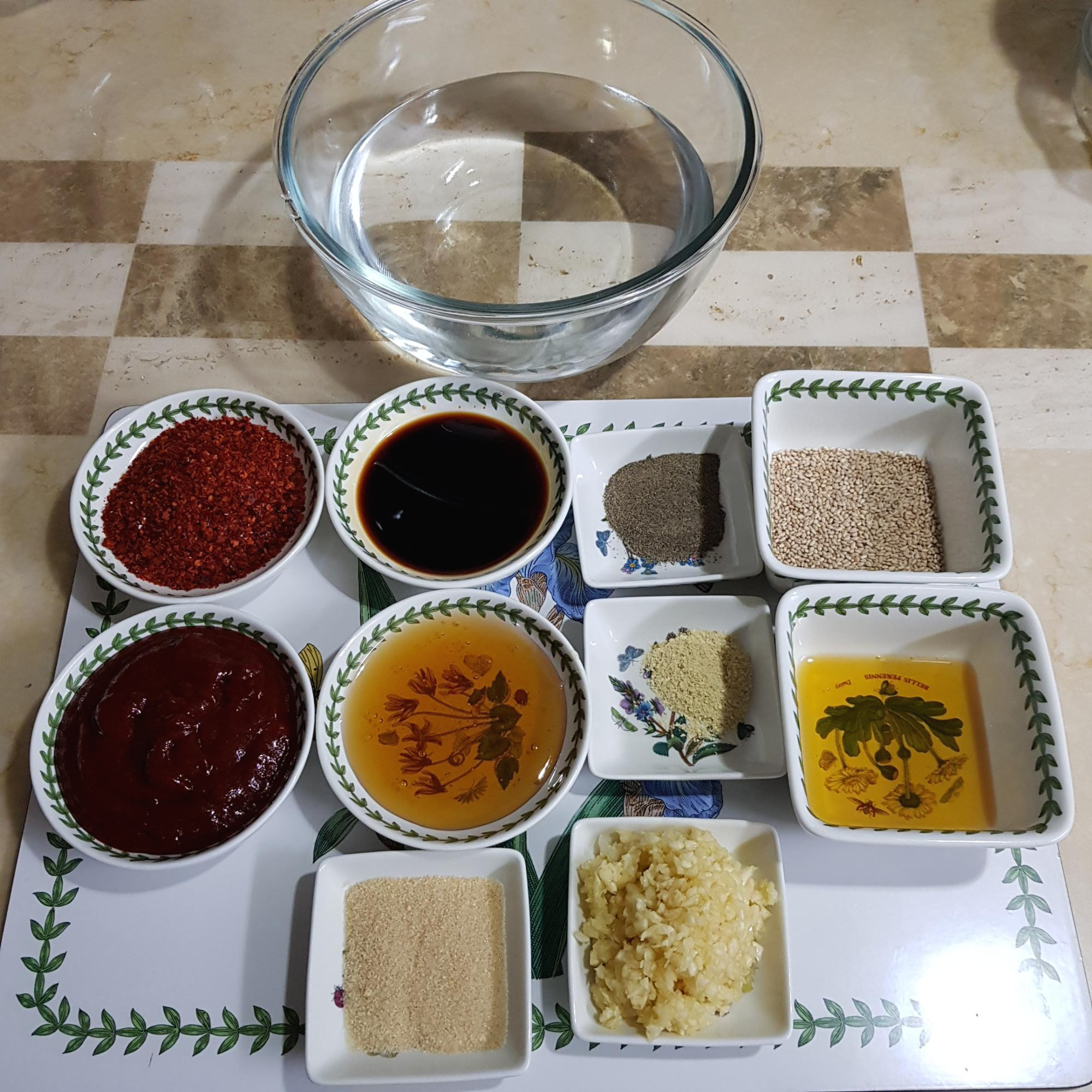 물 5컵(조금 넉넉하게 준비했음), 고춧가루 4큰술, 진간장 5큰술, 후추가루 1 티스푼, 통깨 2큰술, 고추장 반 컵(130g), 물엿 반 컵, 생강분말 1 티스푼, 참기름 4큰술(3큰술은 비린내 제거용), 설탕 1큰술, 다진 마늘 2큰술 반
