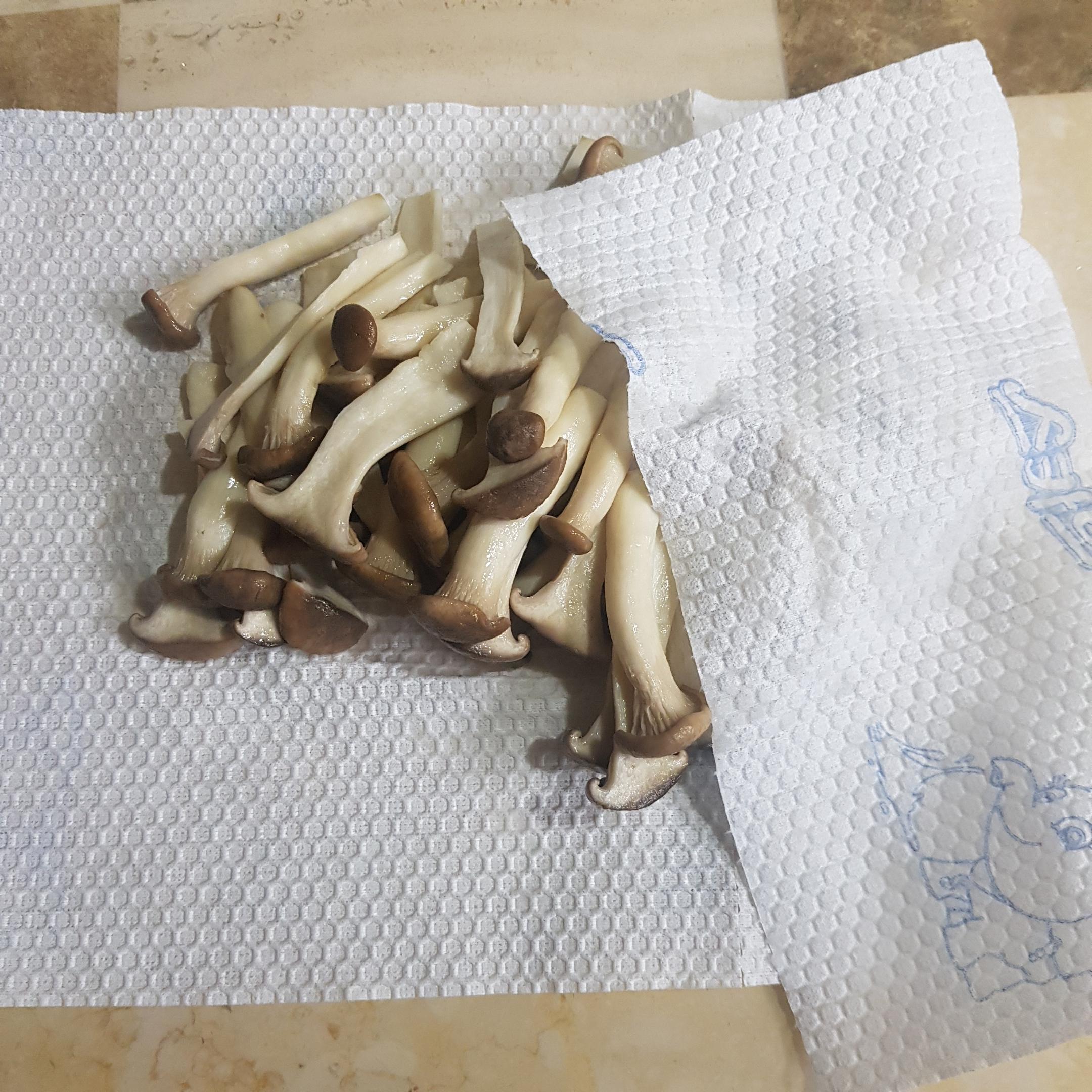 ▶ 채반에 받쳐 1차적으로 물기를 제거한 머쉬마루 버섯을 키친타월을 이용해 남은 물기도 제거해주세요