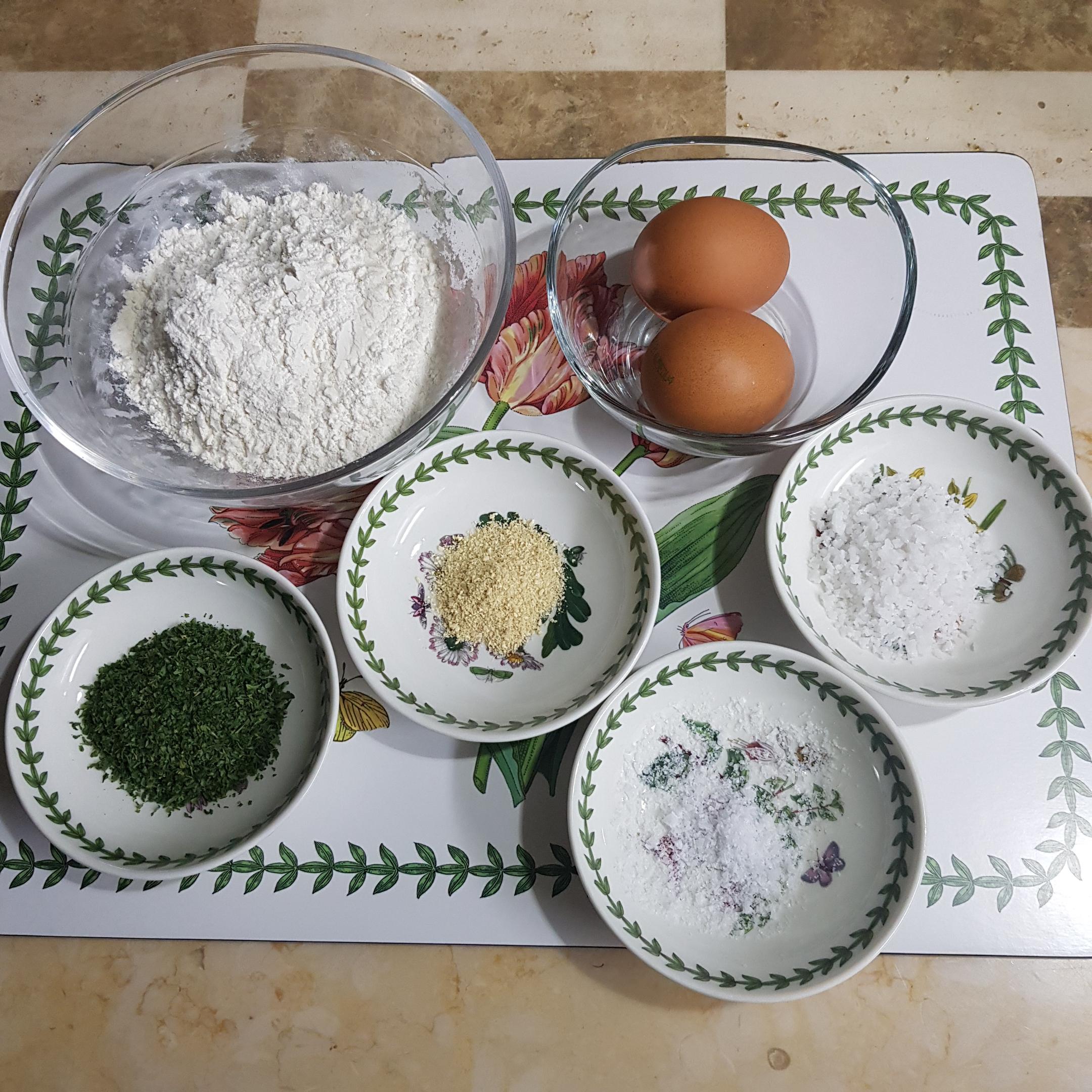머쉬마루 버섯 400g, 밀가루 1컵, 계란 3개, 파슬리가루 반 스푼(생략 가능), 생강분말 1티스푼, 고운 소금 1티스푼(계란에 넣어줄), 천일염 1큰술(데침용)