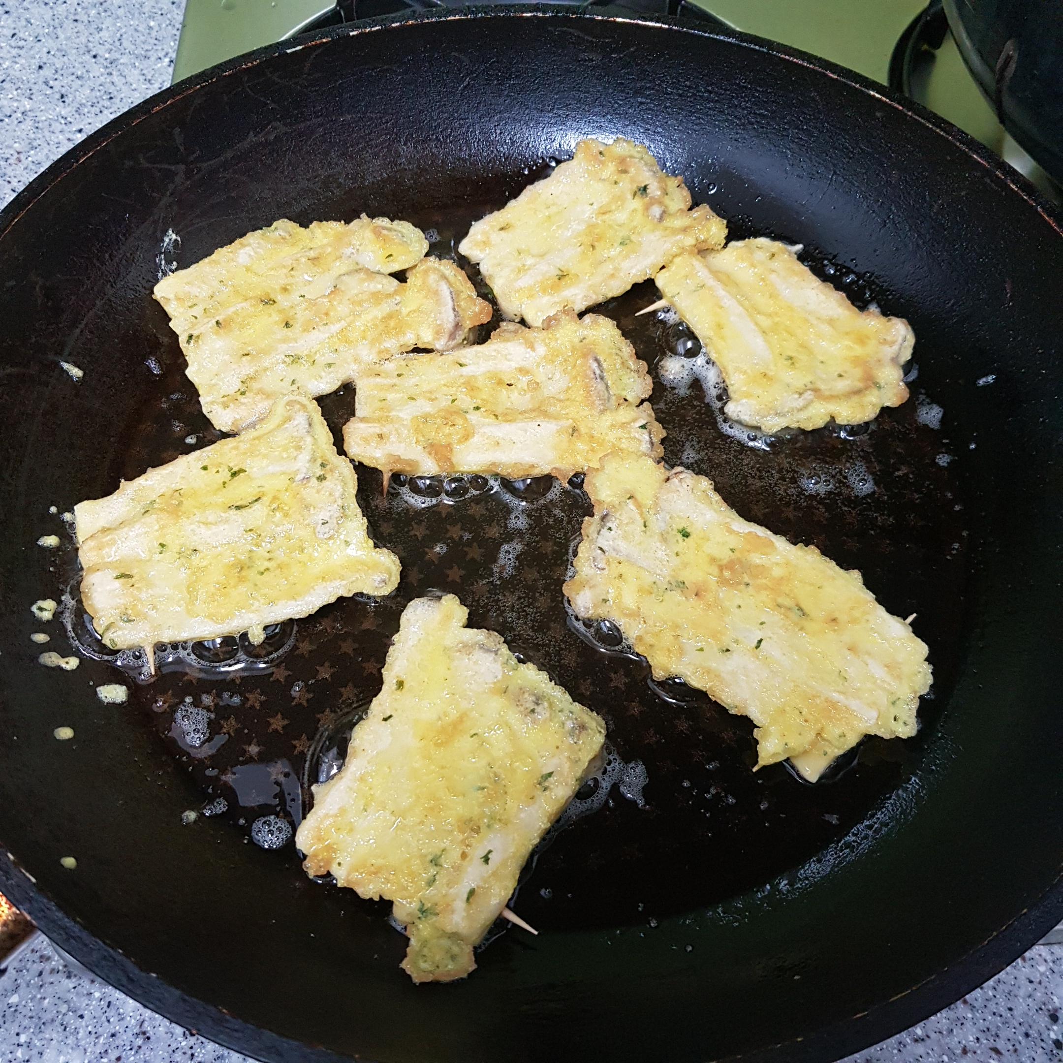 ▶ 예열된 팬에 기름을 두르고 꼬지를 끼워준 버섯을 계란물에 적신 후 올려주세요