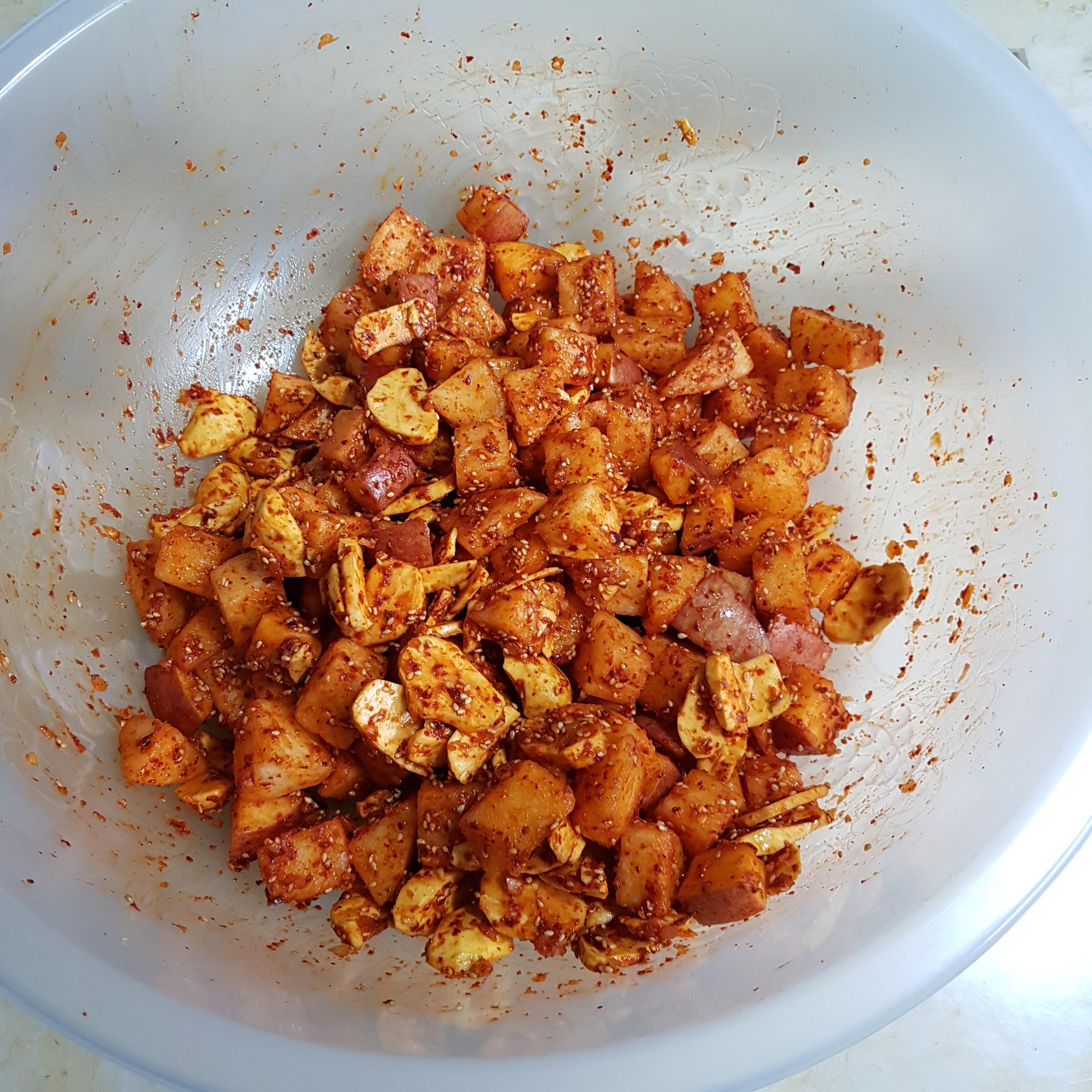 ▶ 넉넉한 볼에 썰어 준비한 재료를 넣고 고춧가루 5큰술 넣고 살살 버무려주세요