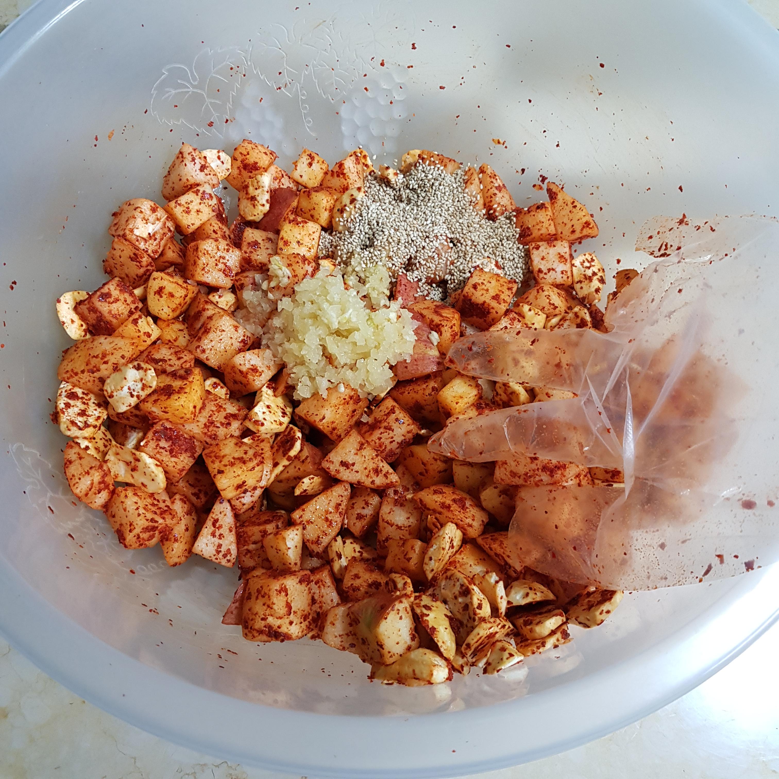 ▶ 다진마늘 2큰술, 멸치액젓 5큰술, 통깨 2큰술 넣고 버무려주세요