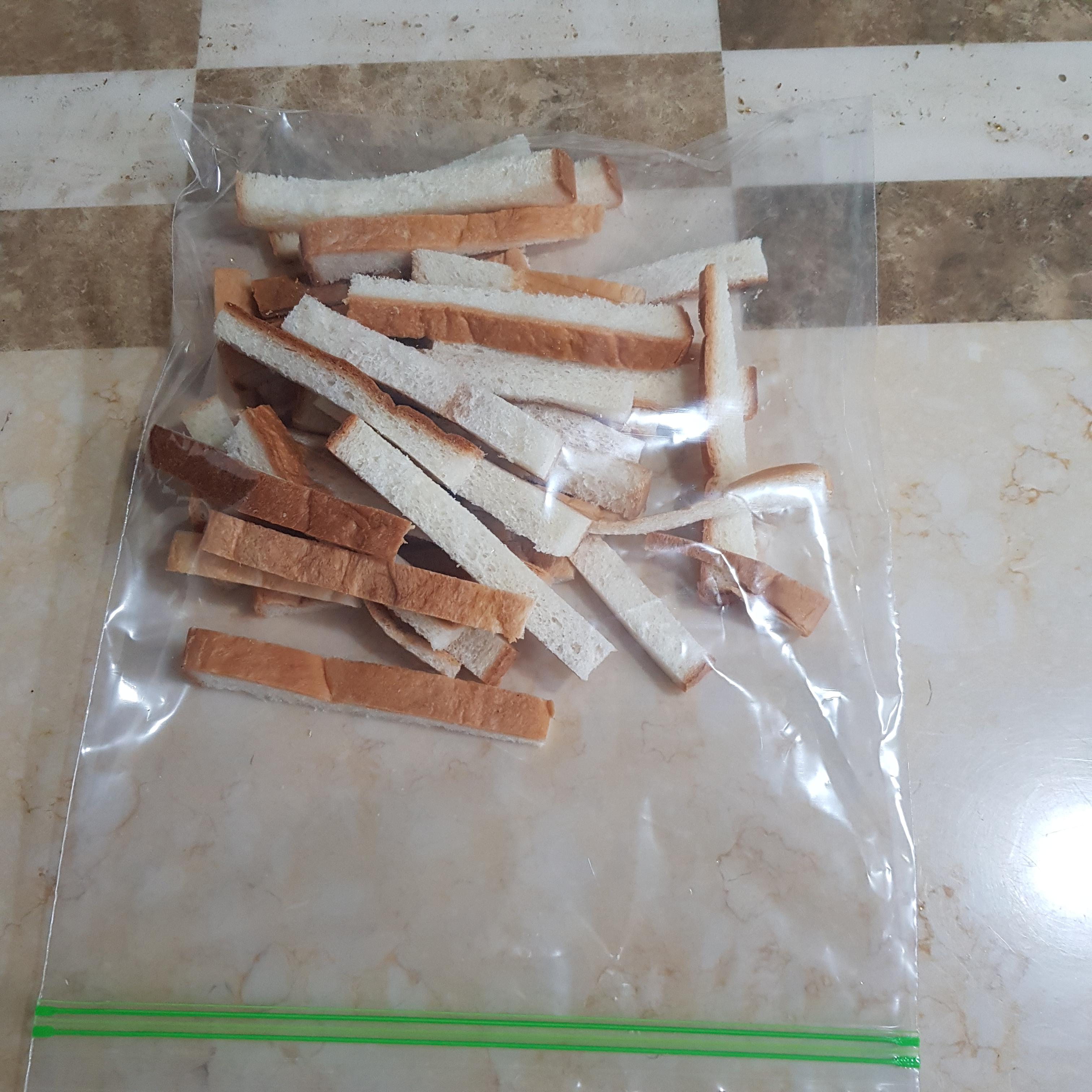 ▶ 식빵 10조각 모두 테두리를 잘라내고 사각형 모양으로 4등분 해주시면 됩니다 식빵 테두리 부분은 모아두었다가 다진 마늘, 설탕, 요리당 넣고 튀겨 드시면 마늘빵처럼 맛있답니다 아까우니 버리지마시고 보관해두었다가 활용하시는 것을 추천합니다^^