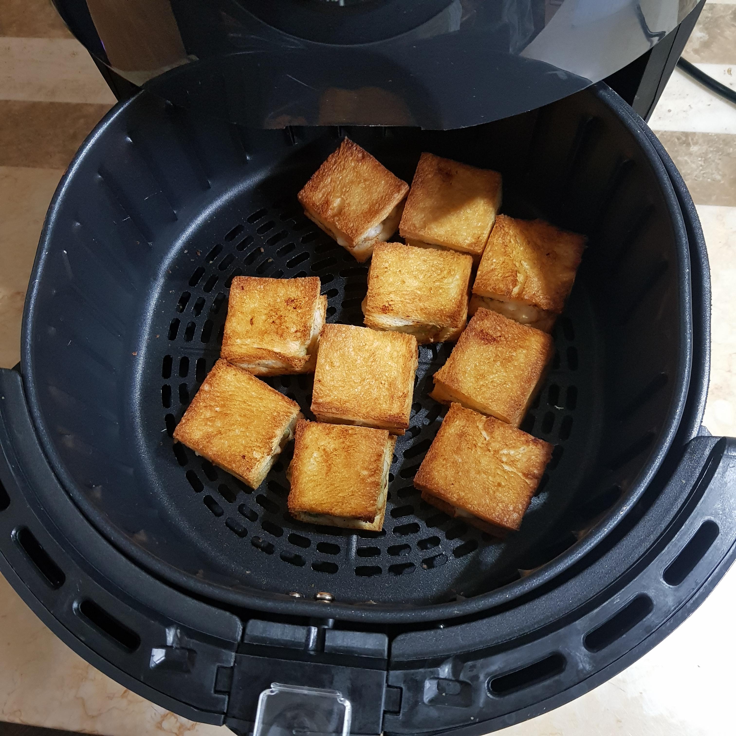▶ 뒤집어서 6분 정도 돌려주시면 이유리 멘보샤 완성입니다^^ 굽는 시간은 식빵 속재료(양념)양이나 에어프라이어 기기에 따라 다를 수 있으니 중간에 식빵 상태를 확인해가면서 구워주세요