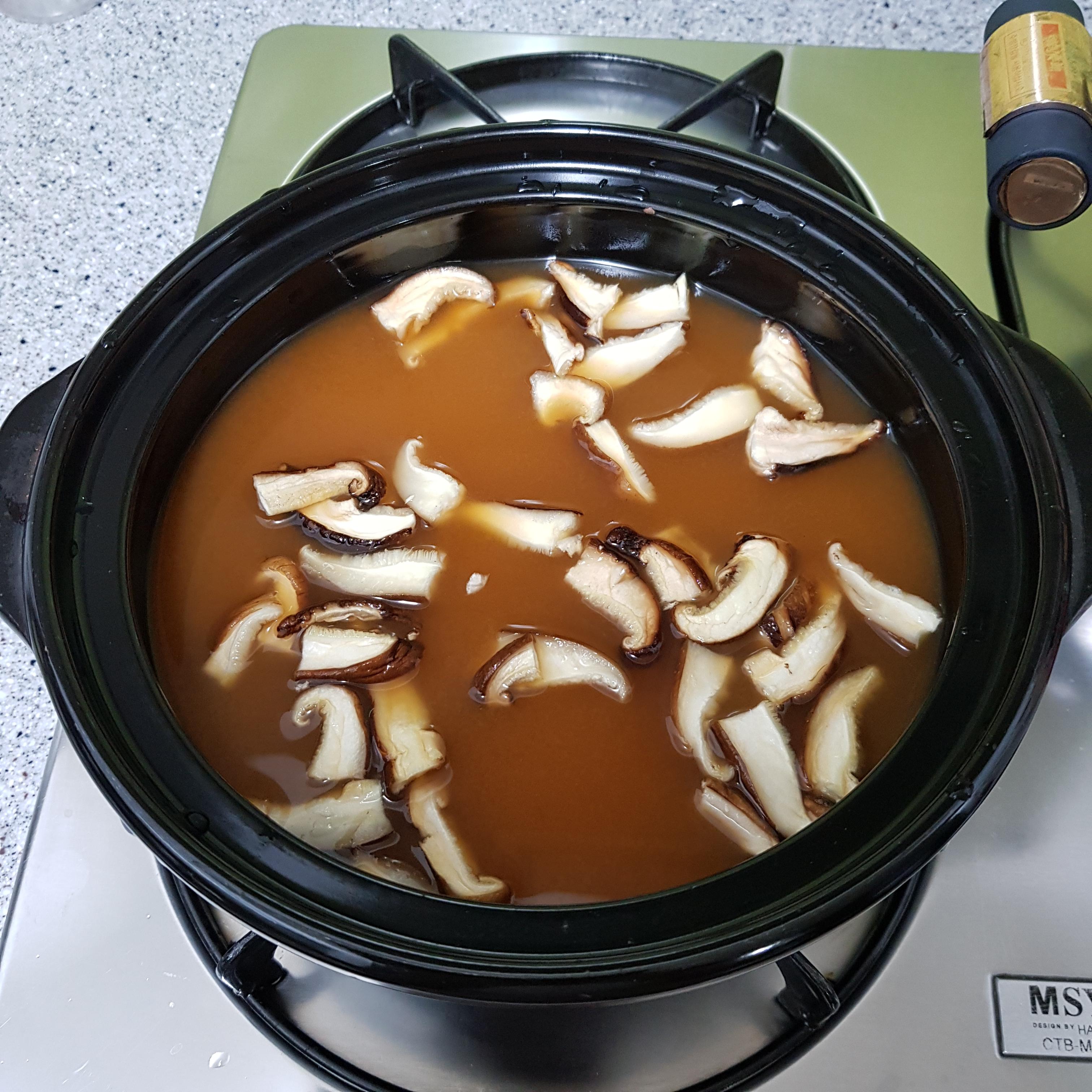 ▶ 물에 담가 불려 놓은 표고버섯을 넣어주고 센불에서 끓여주세요