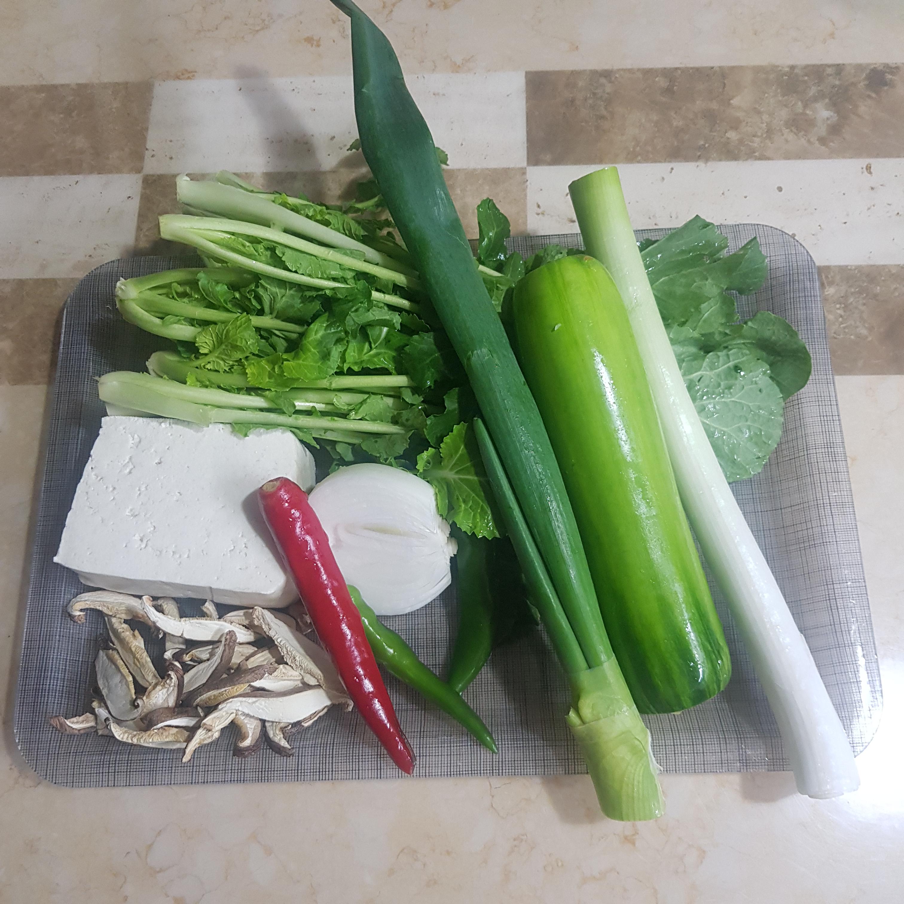 재래된장 3큰술, 유채(겨울초) 200g, 두부 반 모(200g), 양파 반 개(100g), 홍고추 1개, 청양고추 3개, 대파 1대, 표고버섯 10g, 애호박 1개