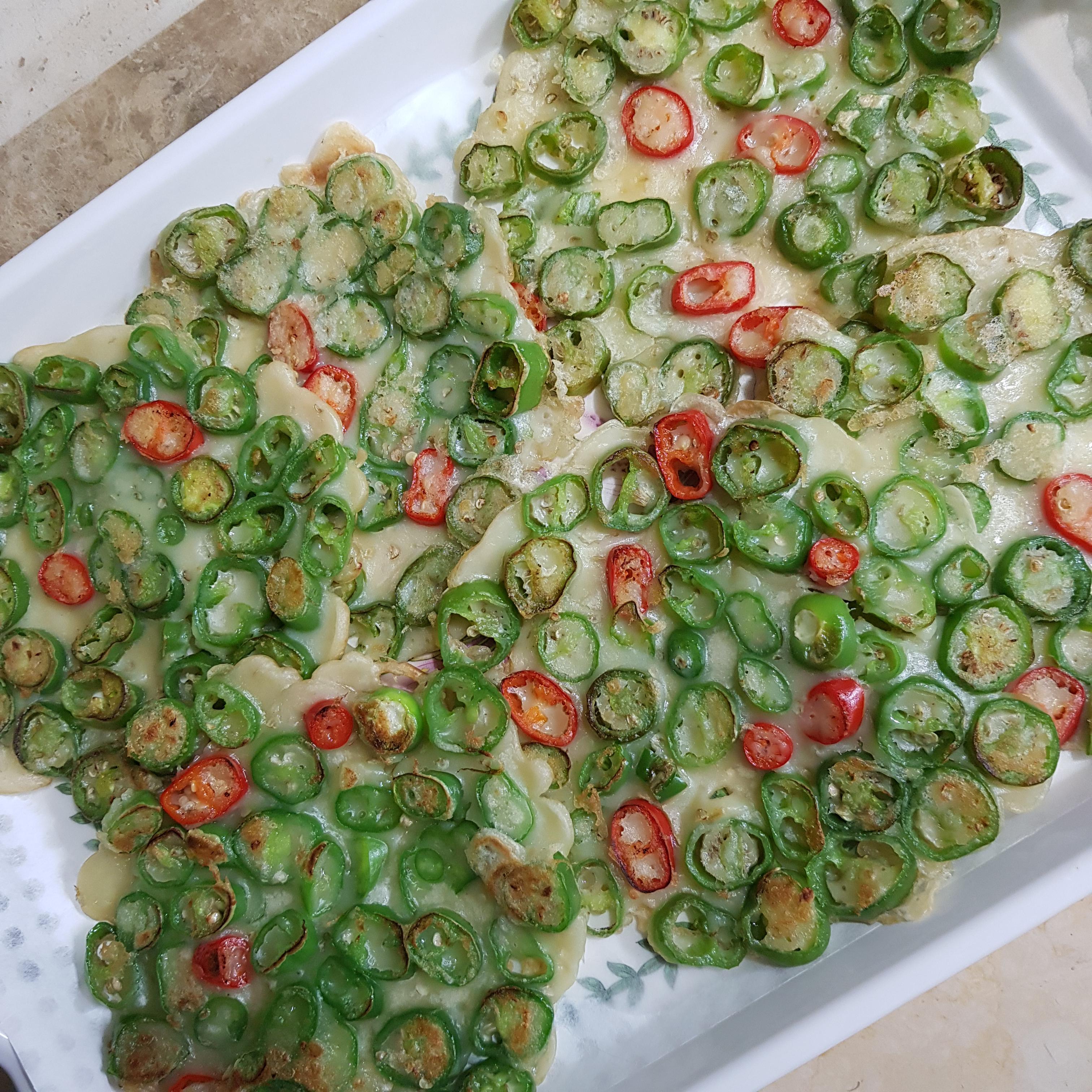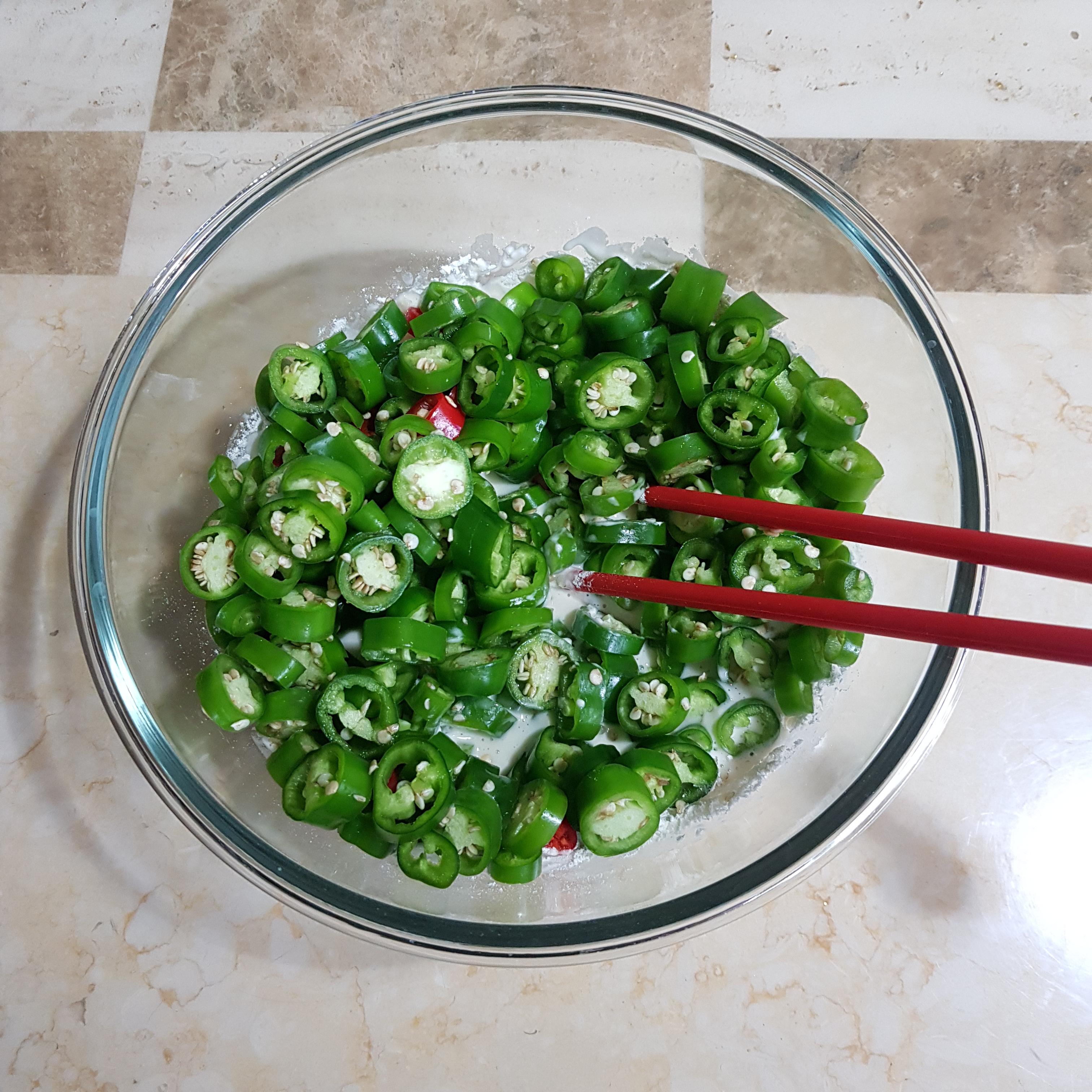 ▶ 반으로 잘라 씨를 제거한 고추를 반죽 물에 넣어주세요
