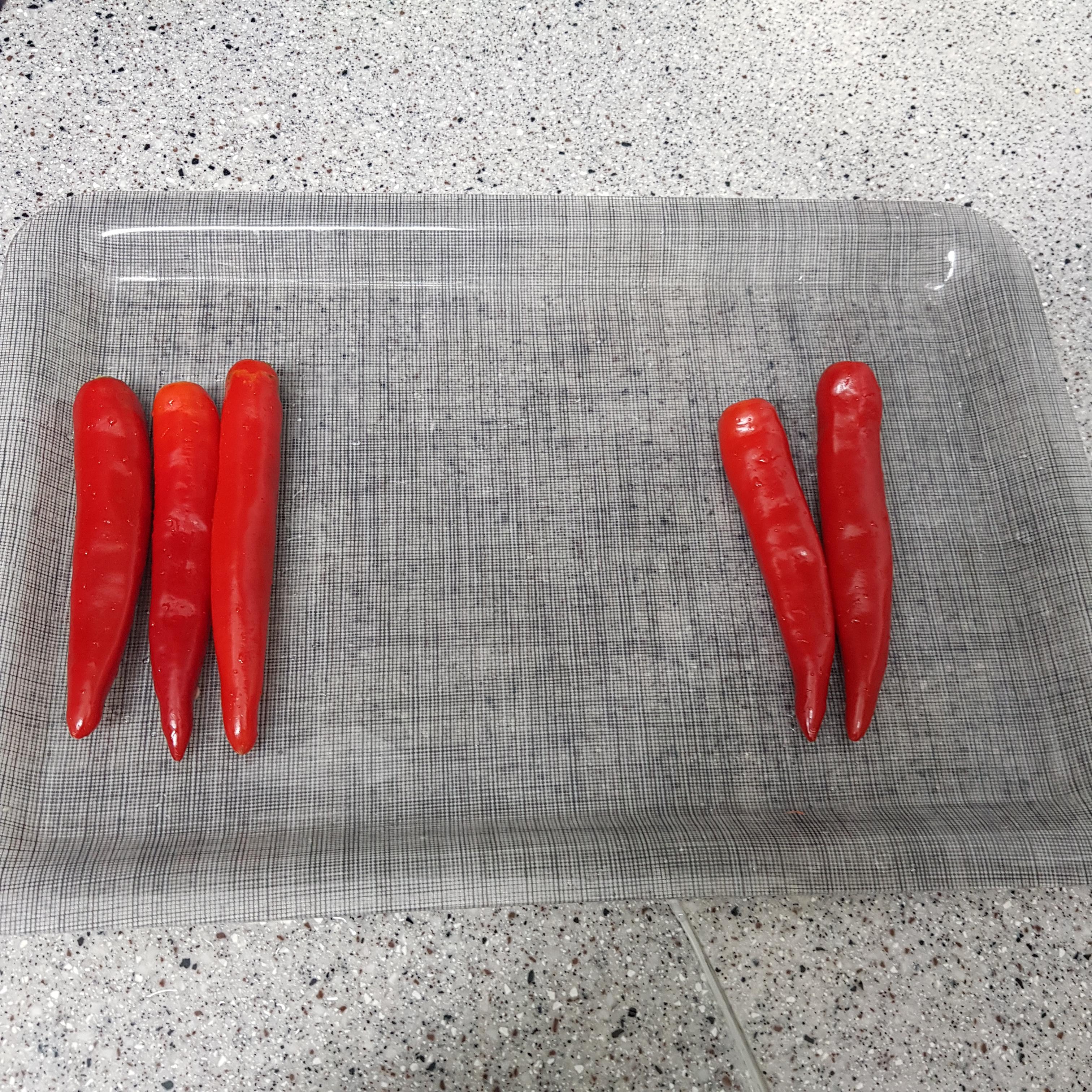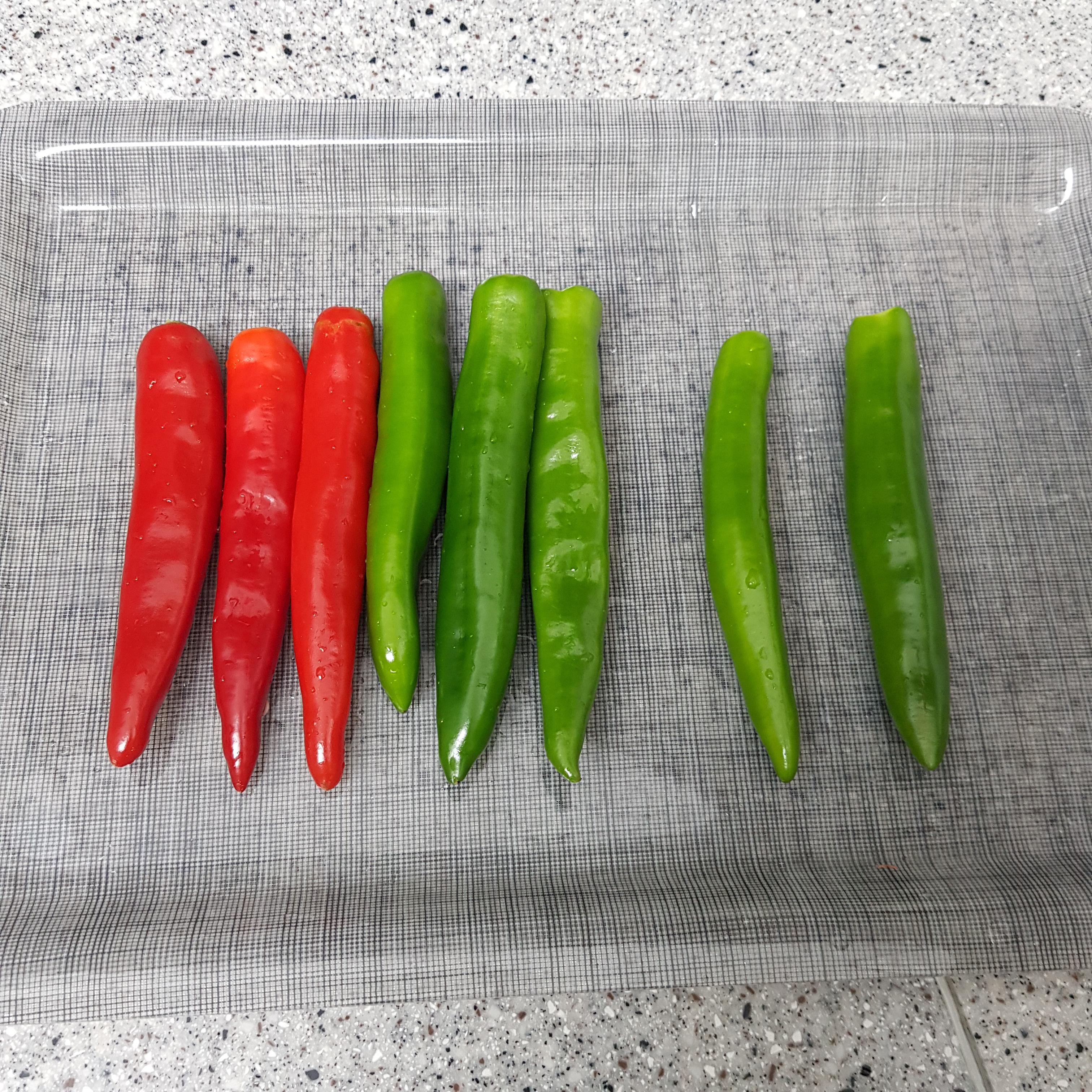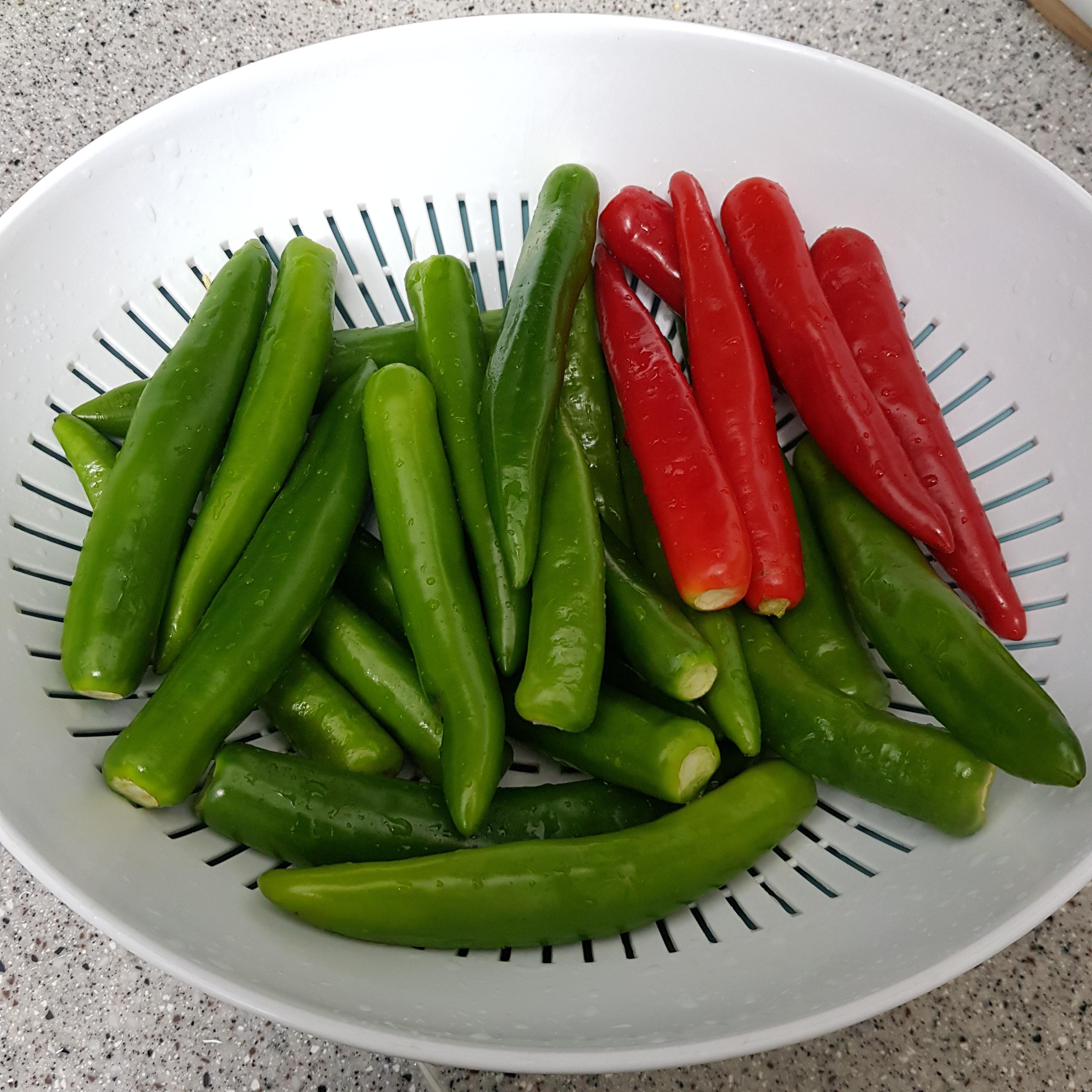 ▶ 사진과 같이 풋고추와 홍고추를 깨끗이 씻어 준비한 후 채반에 받쳐 물기를 제거해주고 분리해주세요 앞서 말씀드린 것과 같이 두 가지 방법으로 하였는데 첫 번째 방법으로는 풋고추 17개+홍고추 2개 사용, 두 번째 방법으로는 풋고추 5개+홍고추 3개 사용하였답니다 참고해주세요