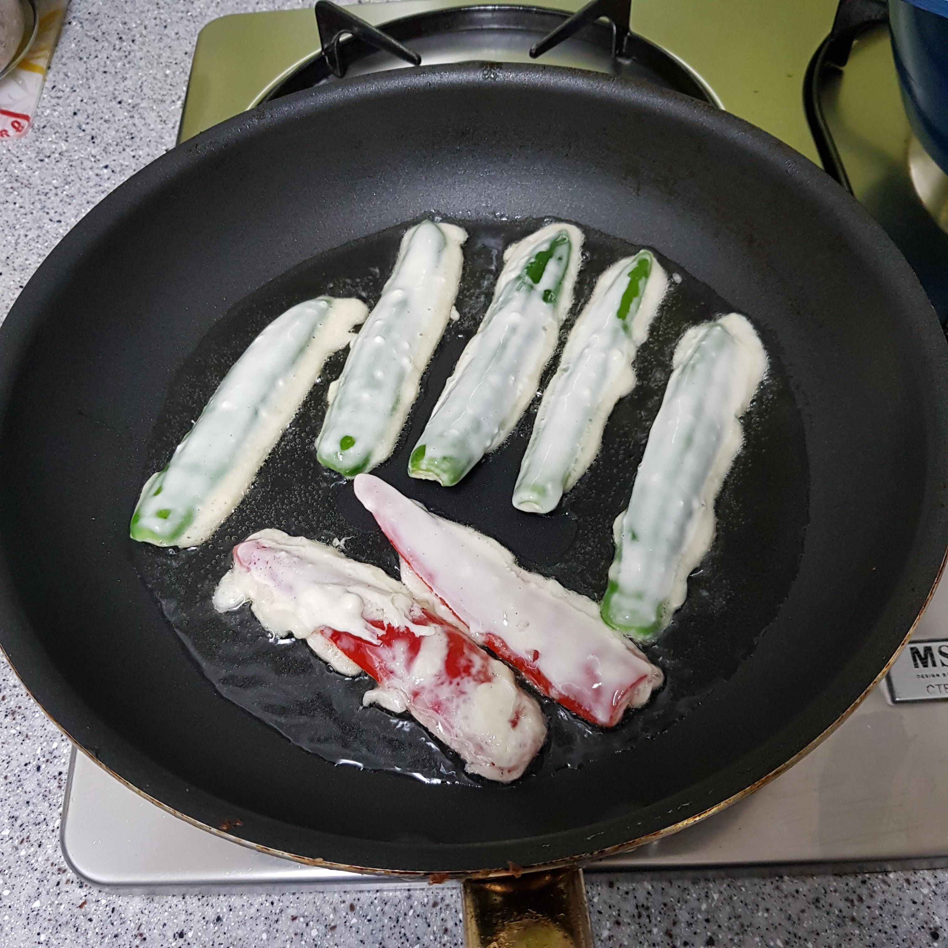 ▶ 예열된 팬에 기름 넉넉히 두르고 반죽물에 적신 고추를 중불에서 구워주세요