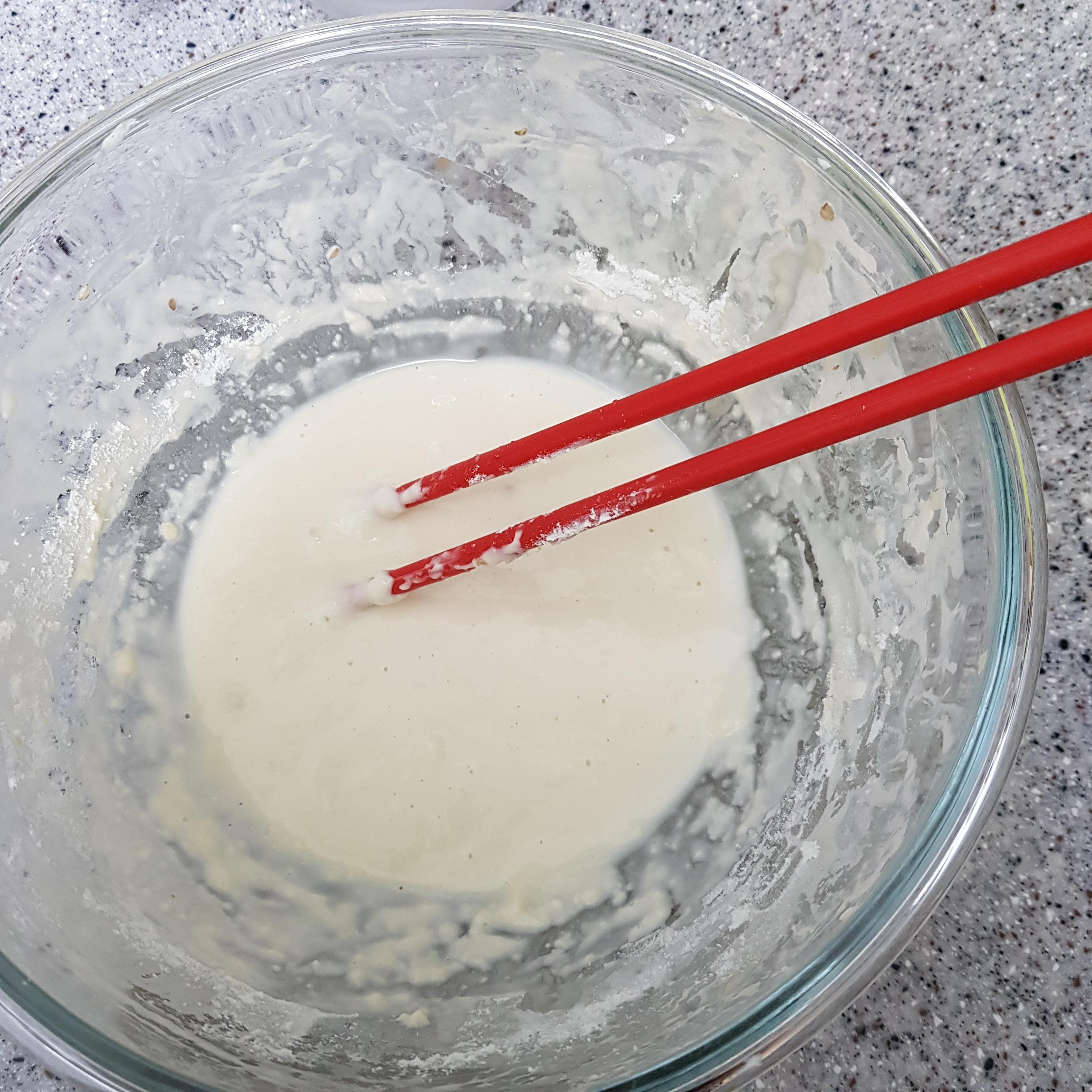 ▶ 부침가루 1컵, 냉수 3/4컵, 고운 소금 한 꼬집 넣고 섞어주세요 첫 번째 방법의 반죽과 달리 이번에는 반죽 물을 약간 되직하게 준비해주세요