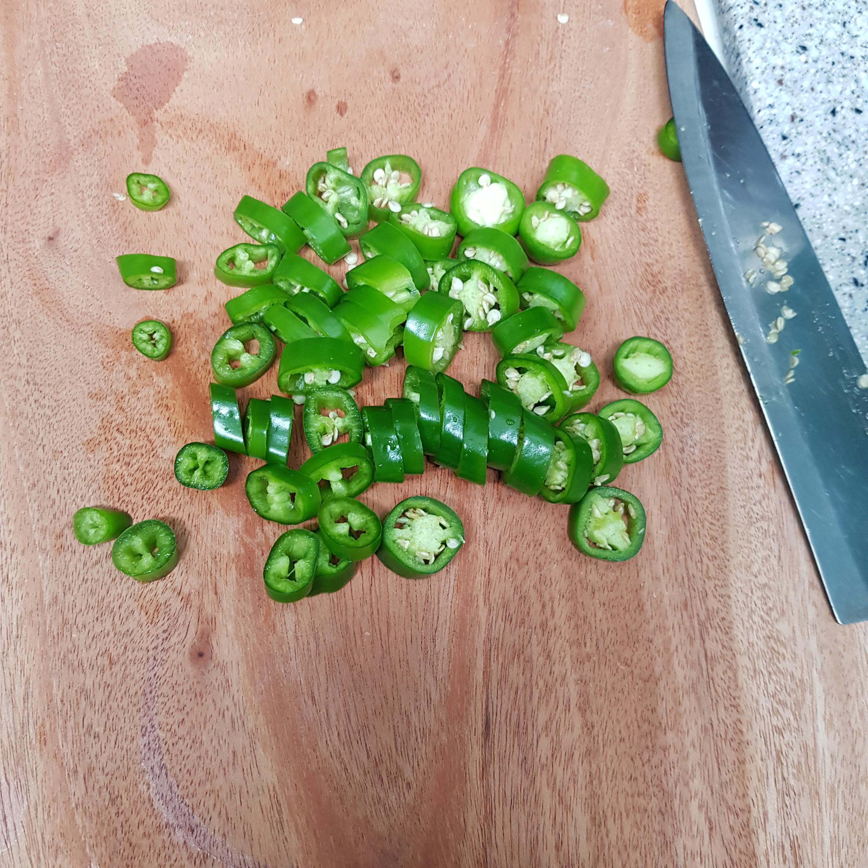 ▶ 풋고추 5개, 홍고추 3개를 준비한 후 반으로 잘라주세요