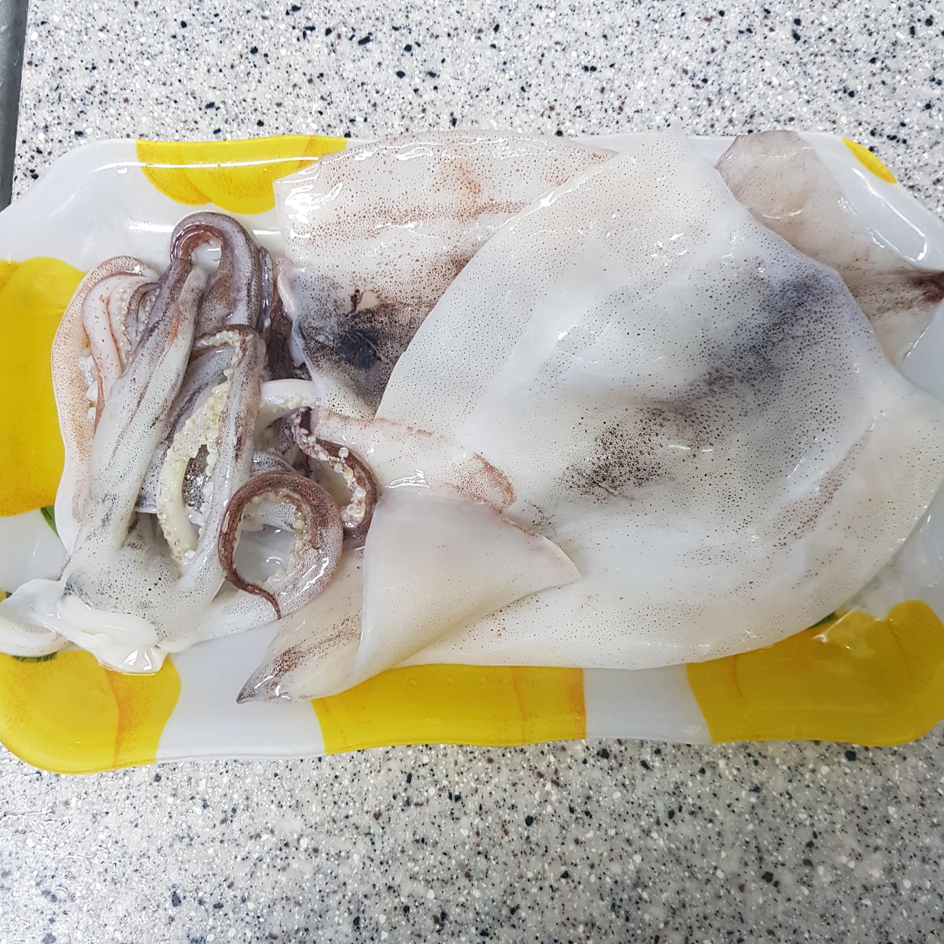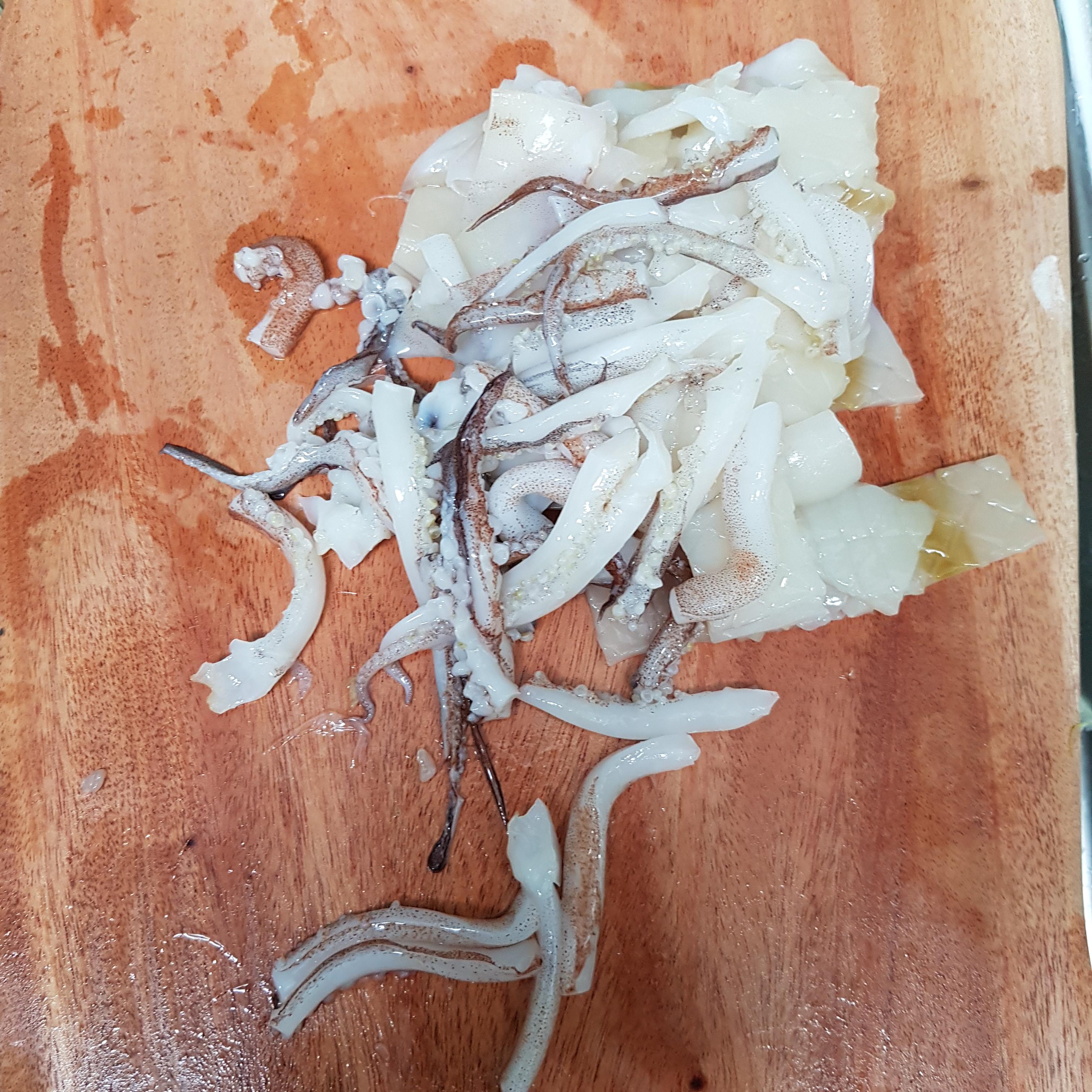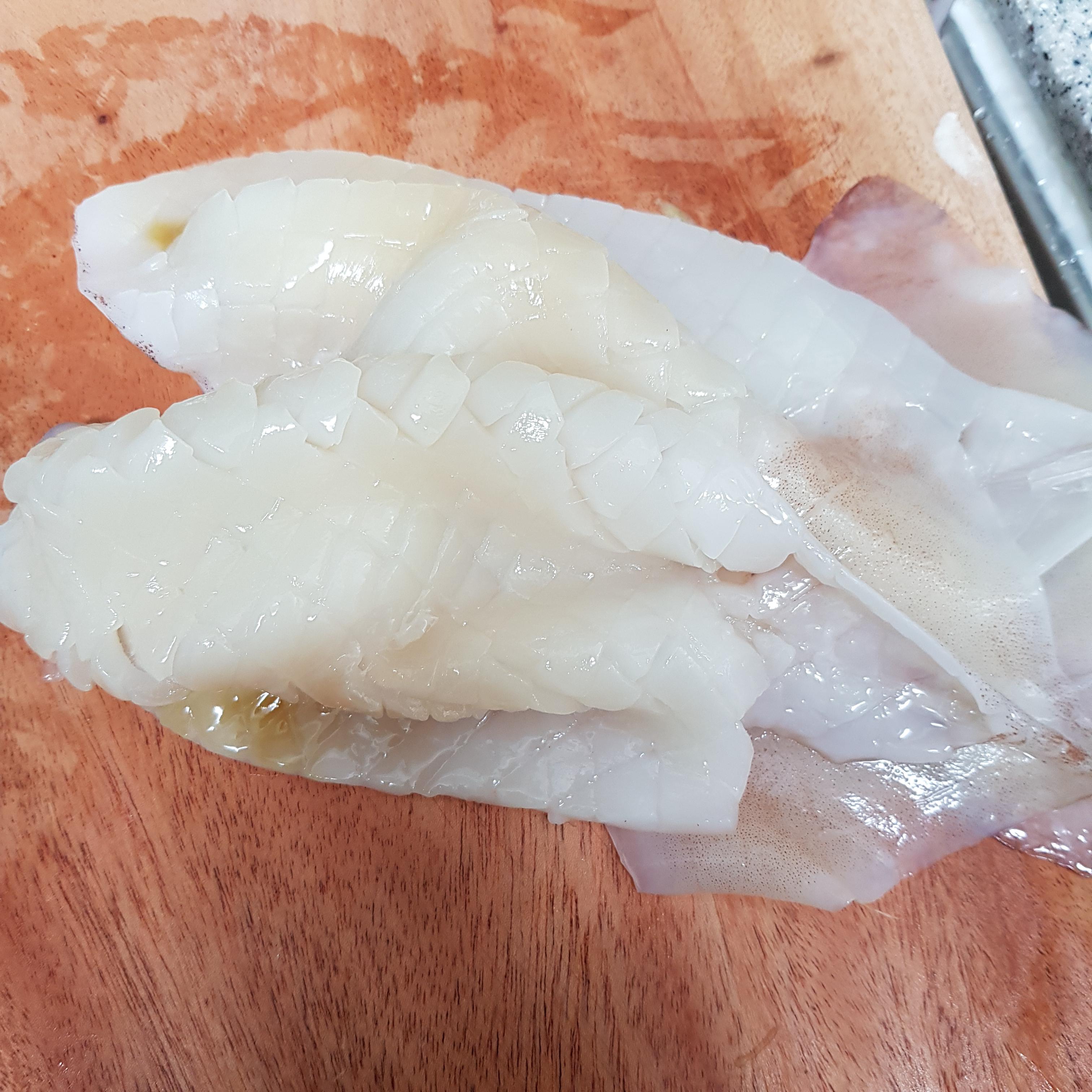▶ 칼집 내준 몸통은 3cm정도로 잘라 준비해주세요 오징어 다리 부분의 빨판은 손으로 훑어주고 소금으로 치대 준 후 미끈거리는 부분은 씻어주세요 씻은 후 4cm 정도 먹기 좋은 크기로 잘라주세요 오징어 다리 부분 빨판은 깨끗이 손질해야 비린내와 잡내가 나지 않는답니다 참고해주세요
