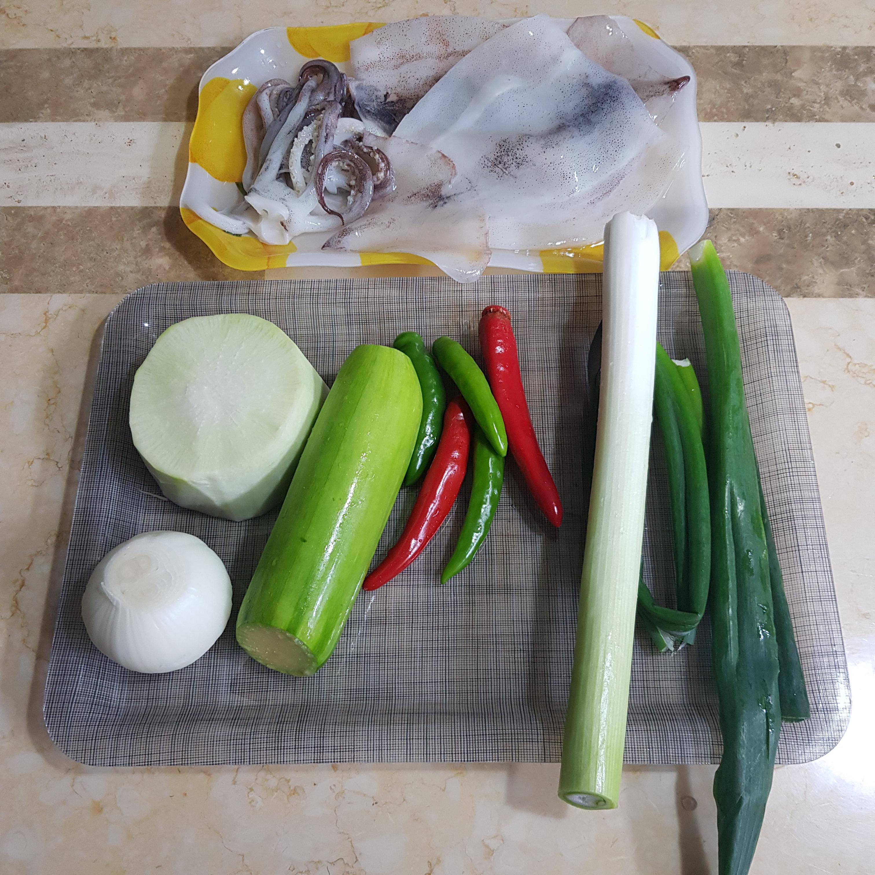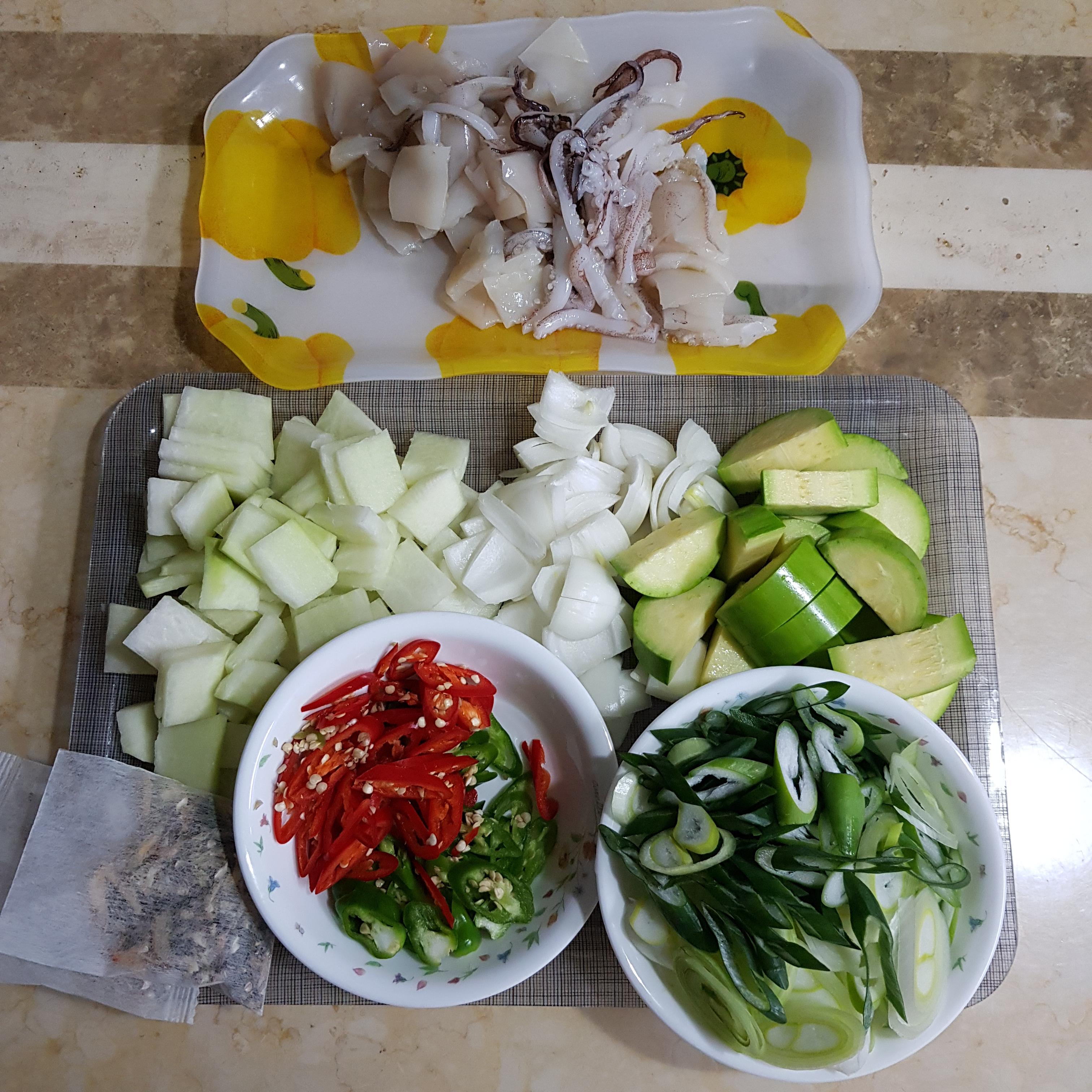 오징어 2마리, 무 250g, 양파 100g, 애호박 1개(260g), 홍고추 2개, 청양고추 3개, 대파 1대