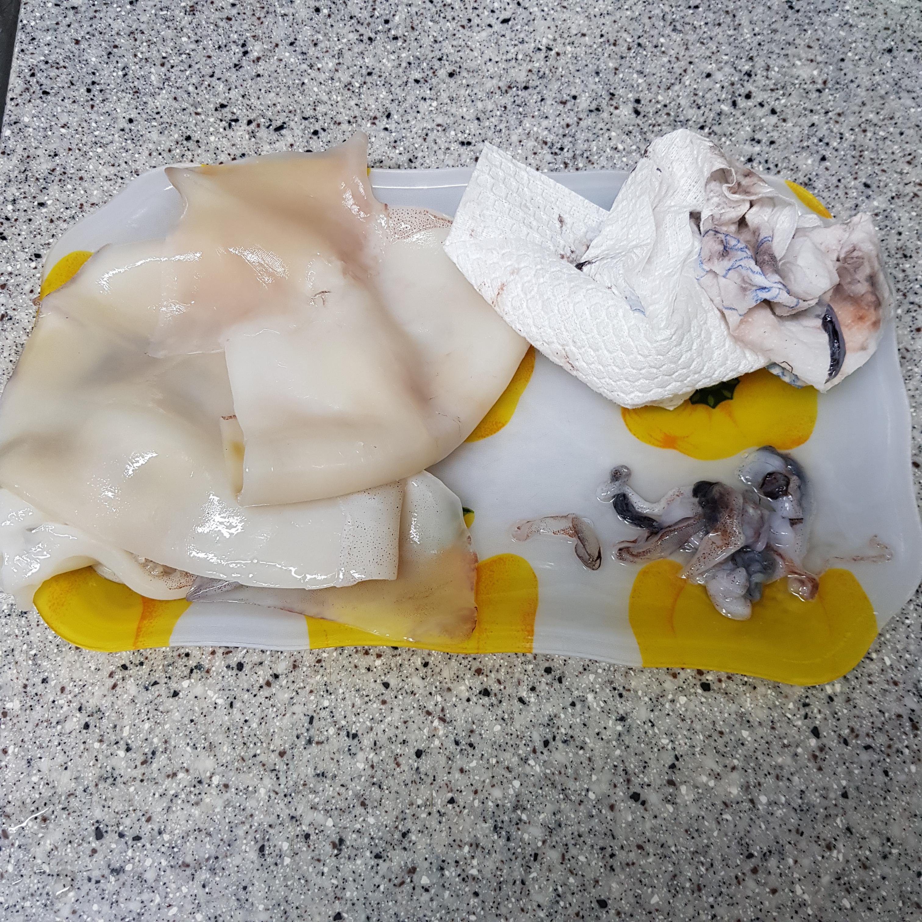 ▶ 키친타월을 이용하여 오징어 껍질을 잡고 벗겨주세요 오징어가 싱싱하면 껍질이 더 쉽게 벗겨진답니다