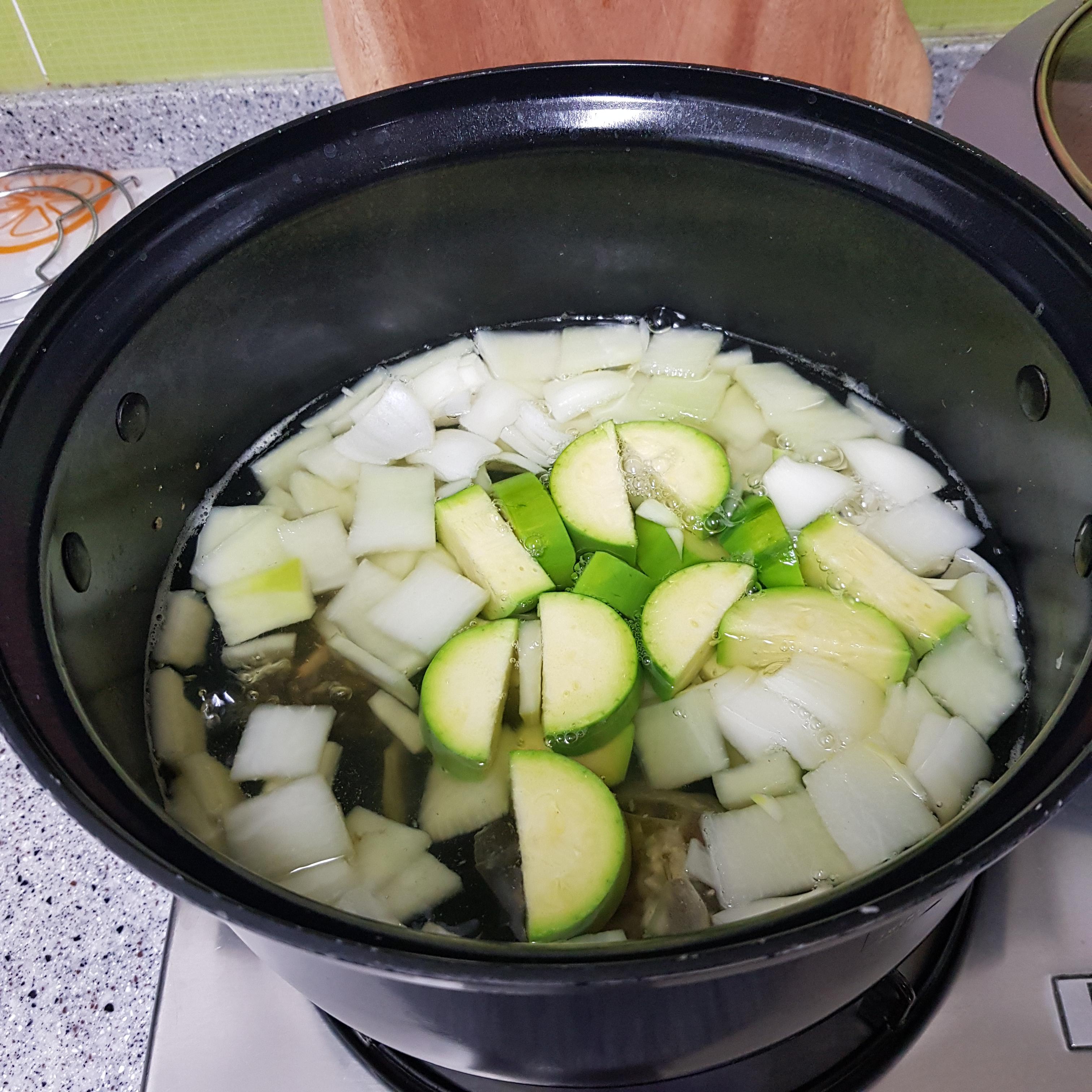 ▶ 센 불에서 끓기 시작한 후 10분 정도 끓여준 후 육수 팩은 건져내고 애호박, 양파, 멸치액젓 2큰술, 홍고추, 청양고추를 넣고 5분 정도 더 끓여주세요