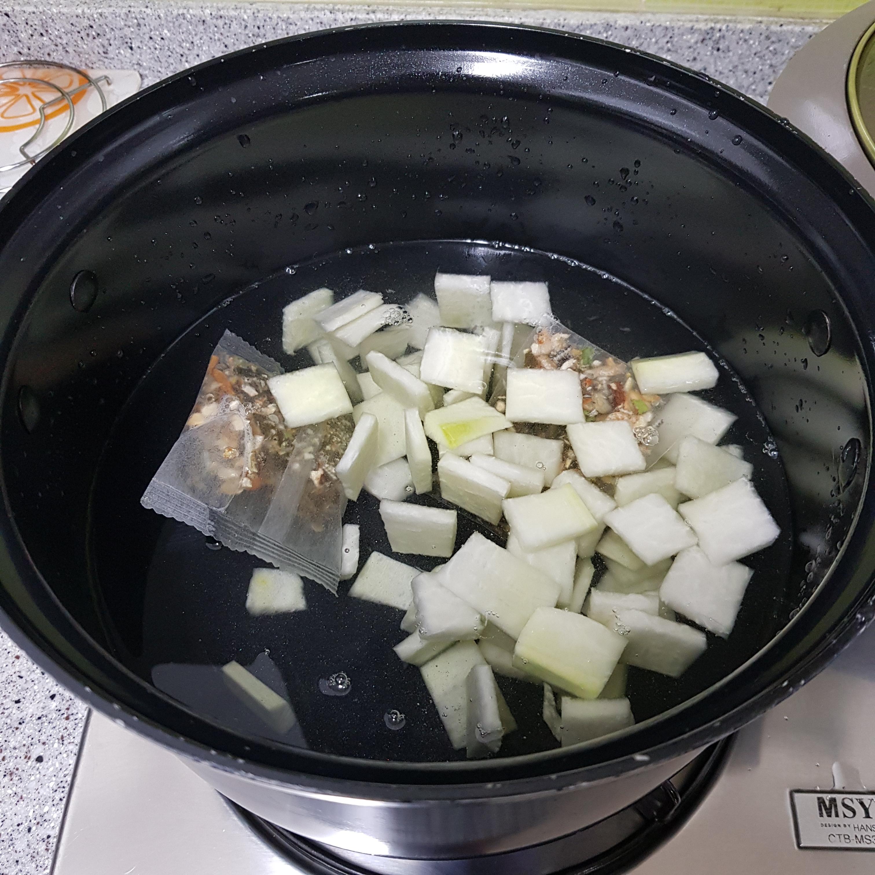 ▶ 적당한 크기의 냄비에 물 2L를 붓고 육수 2팩, 무를 넣고 센 불에서 끓여주세요