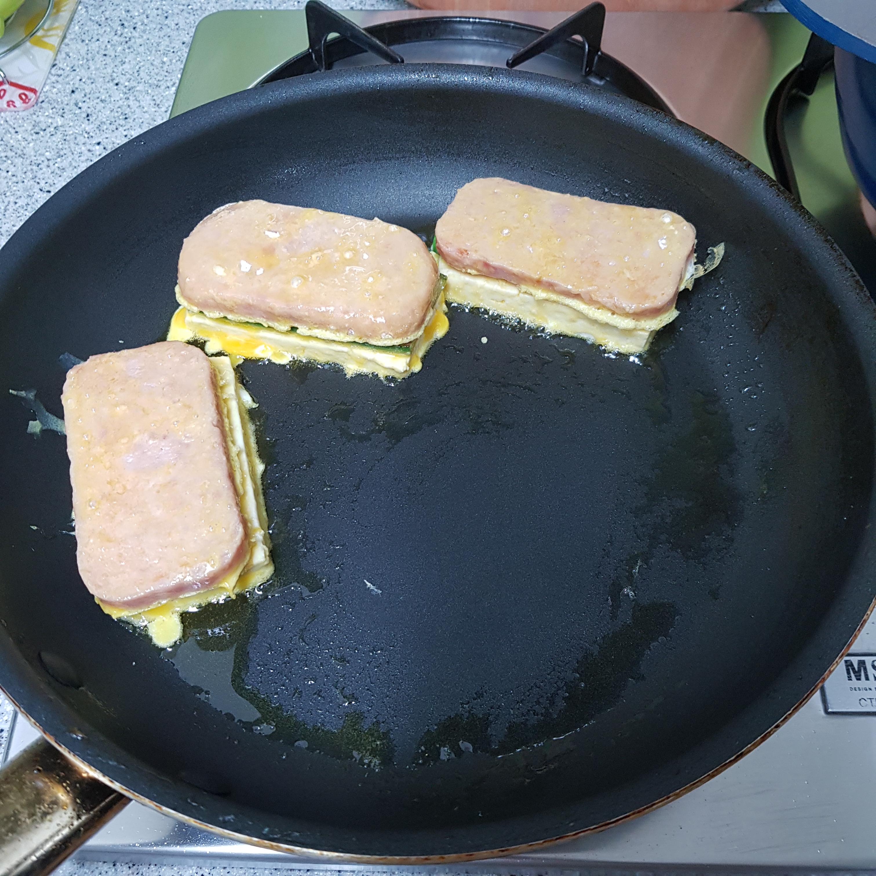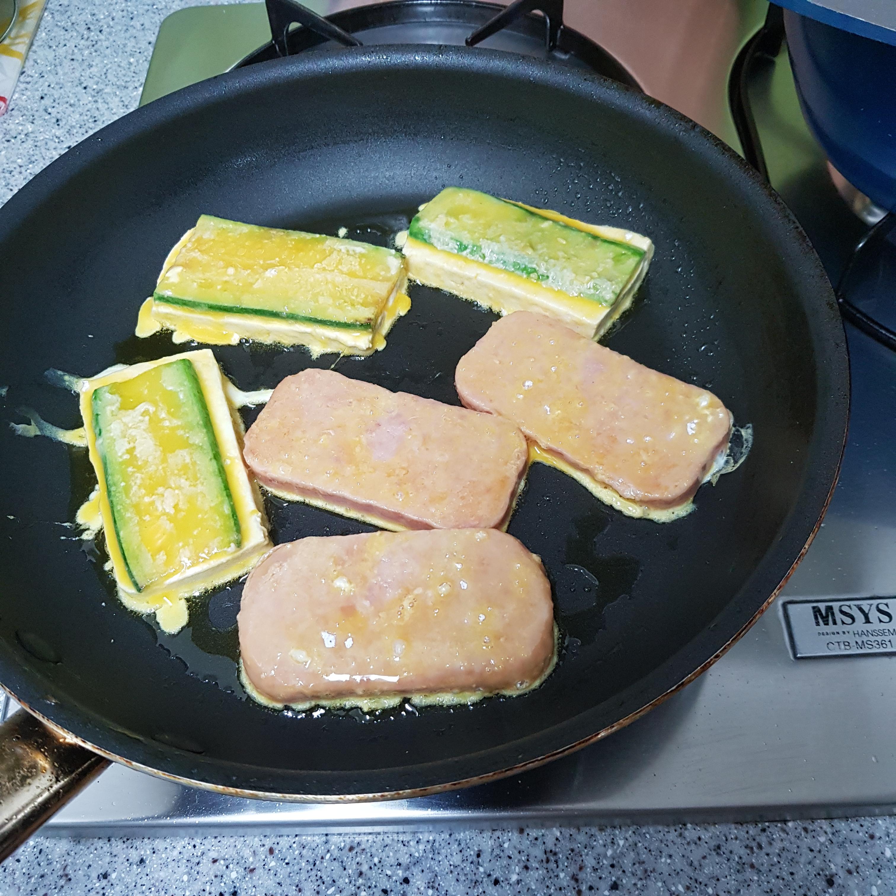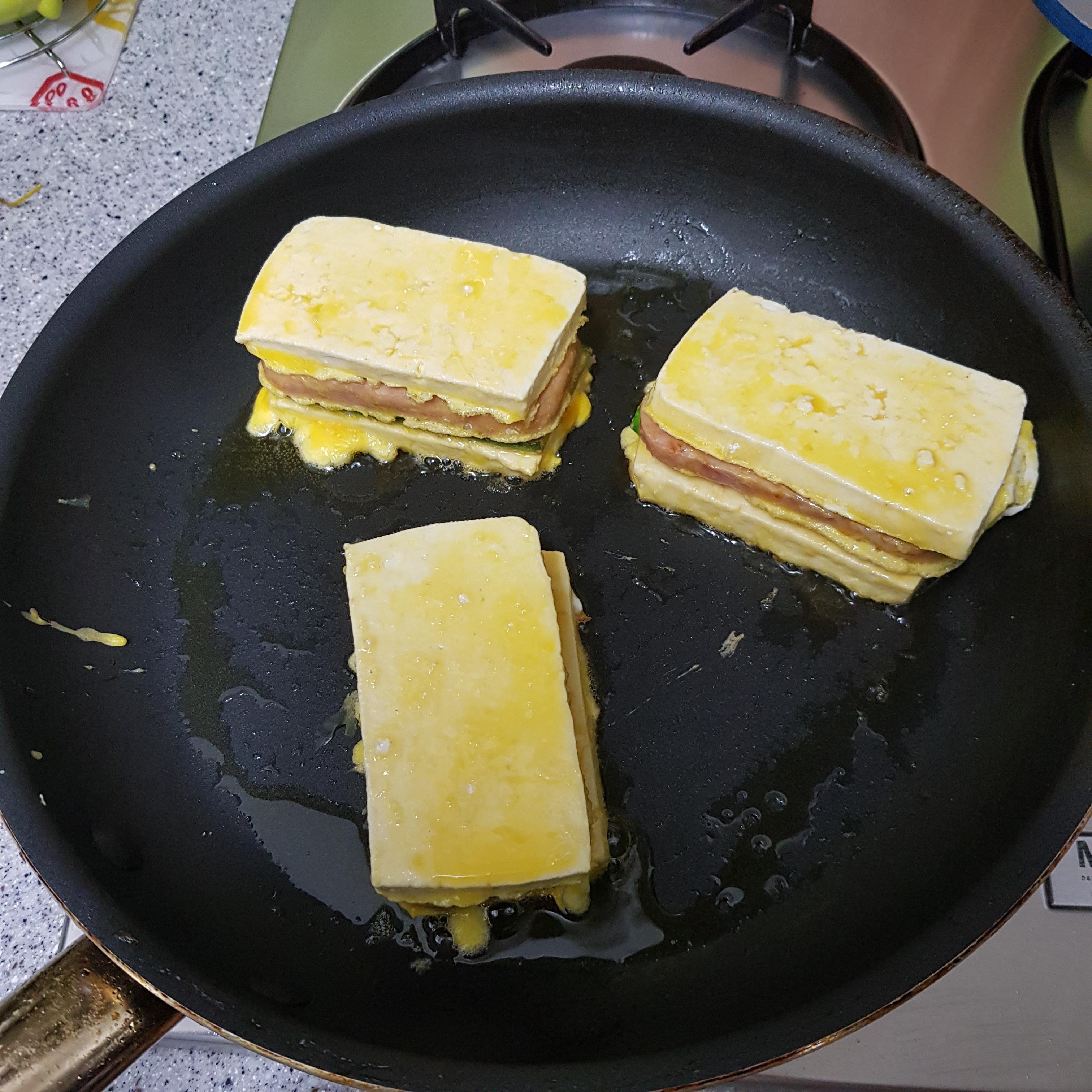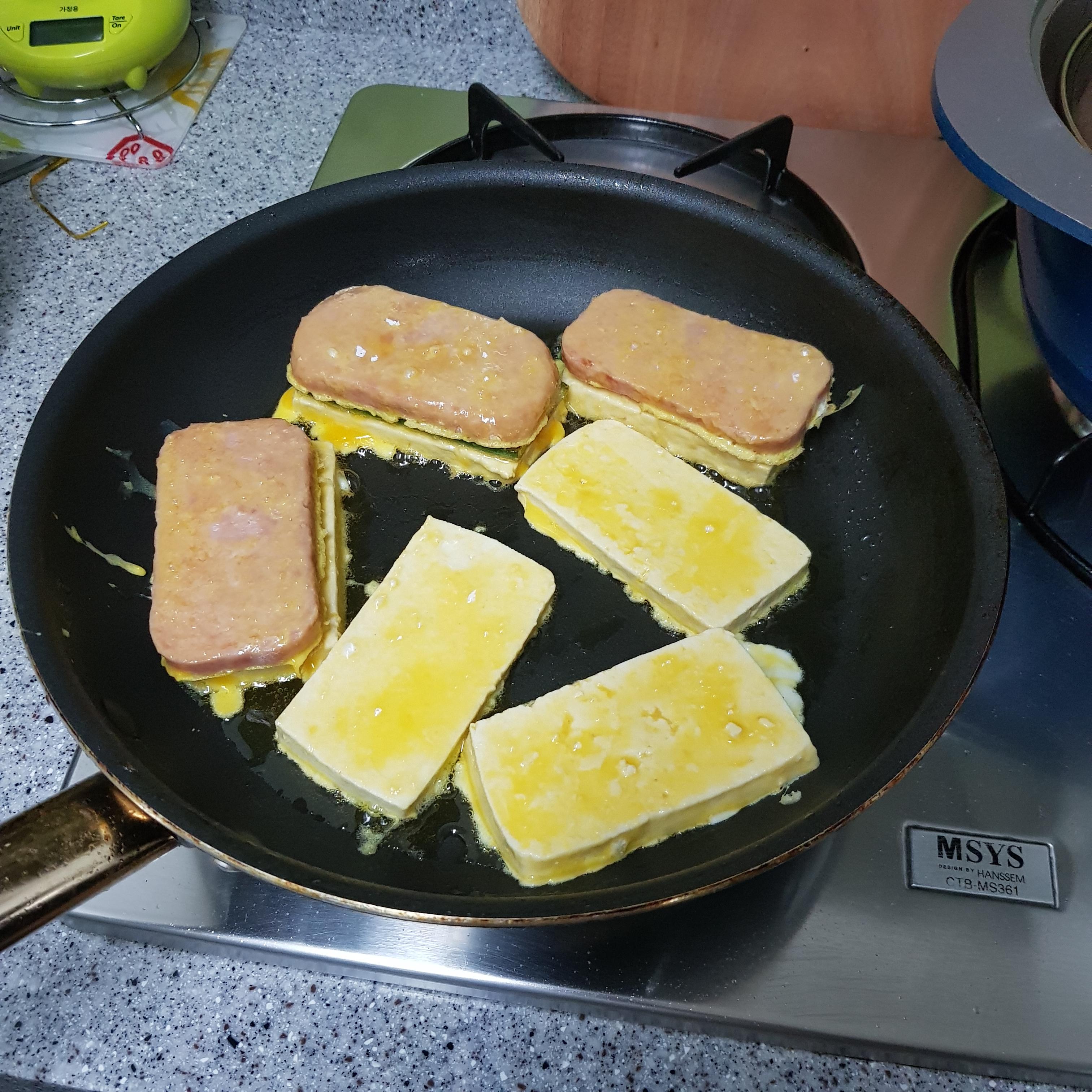 ▶ 예열된 팬에 올리브유 두르고 부침가루 묻힌 스팸, 두부를 달걀물에 적신 후 구워주세요