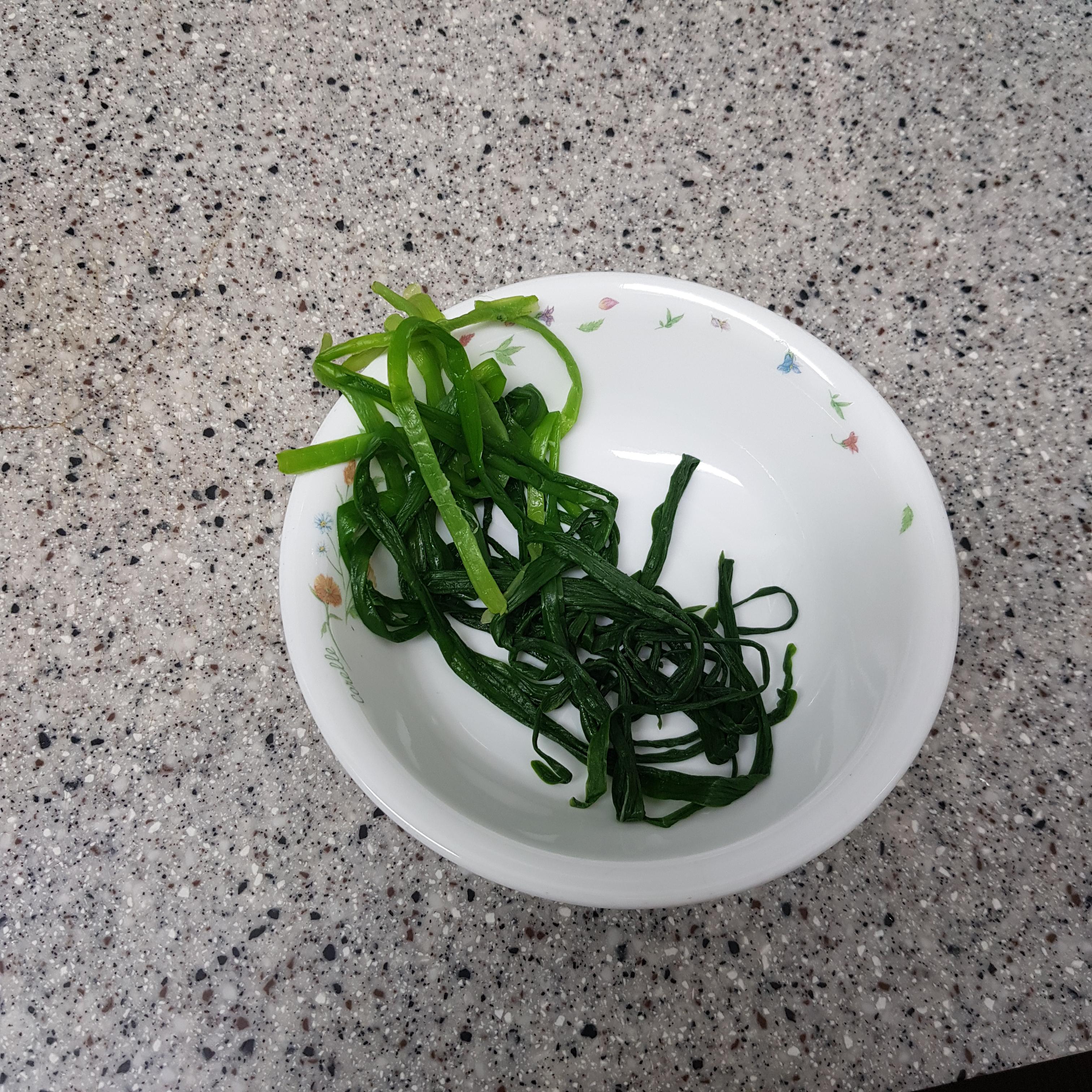 ▶ 부추 20g은 끓는 물에 소금 약간 넣고 1분만 데쳐준 후 찬물에 헹군 뒤 물기를 짜주세요 부추는 데코용이니 생략하셔도 됩니다