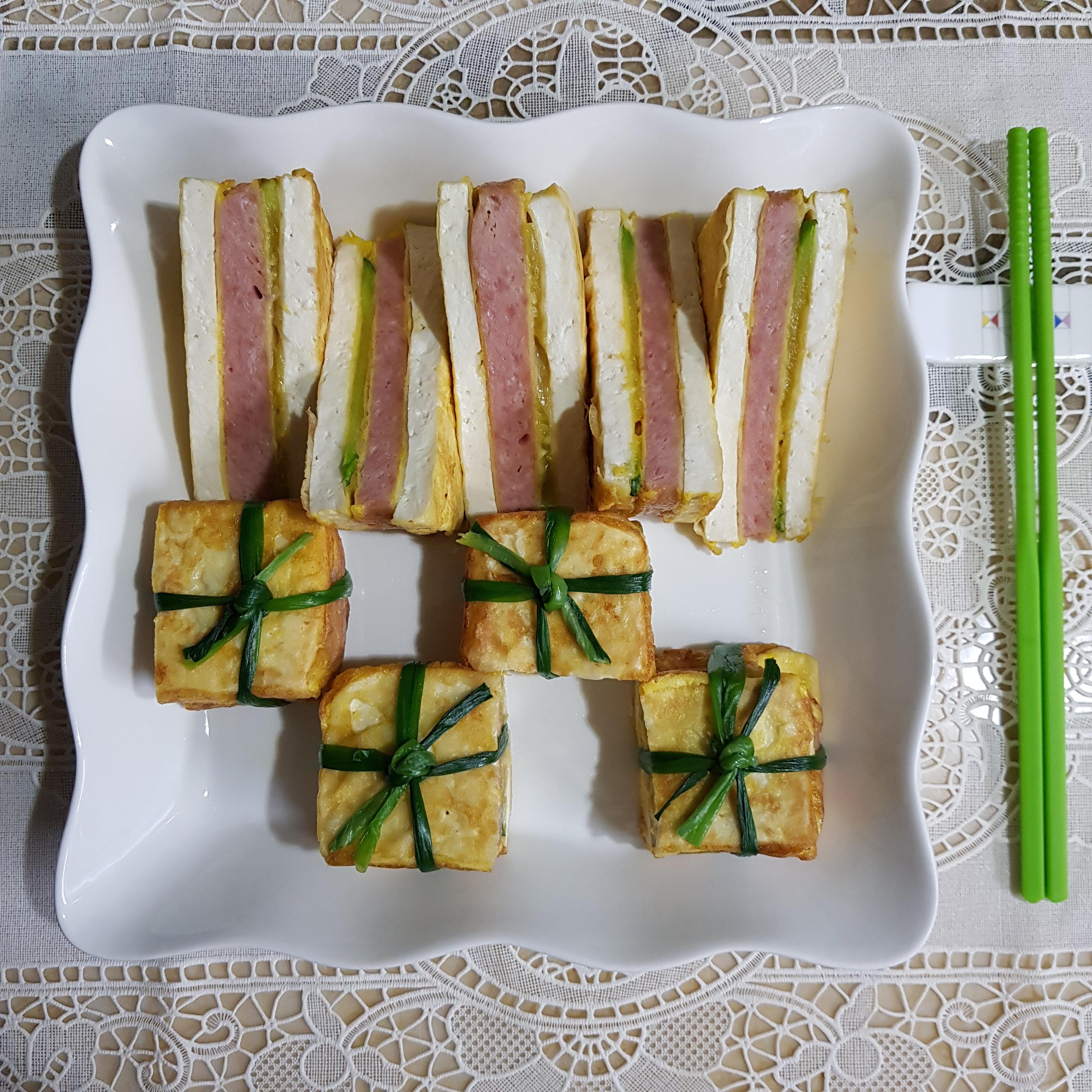 부추로 간단하게 데코해주었는데 예쁘게 포장된 선물 같죠? 준비재료도 간단하고 요리과정도 어렵지 않은데 완성된 샌드위치 비쥬얼이 너무 예쁘지 않나요? 아이들 입맛을 사로 잡을 간식으로도 좋고 손님 상차림 요리로도 손색없는 애호박 스팸 품은 두부 샌드위치 한번 만들어보세요^^