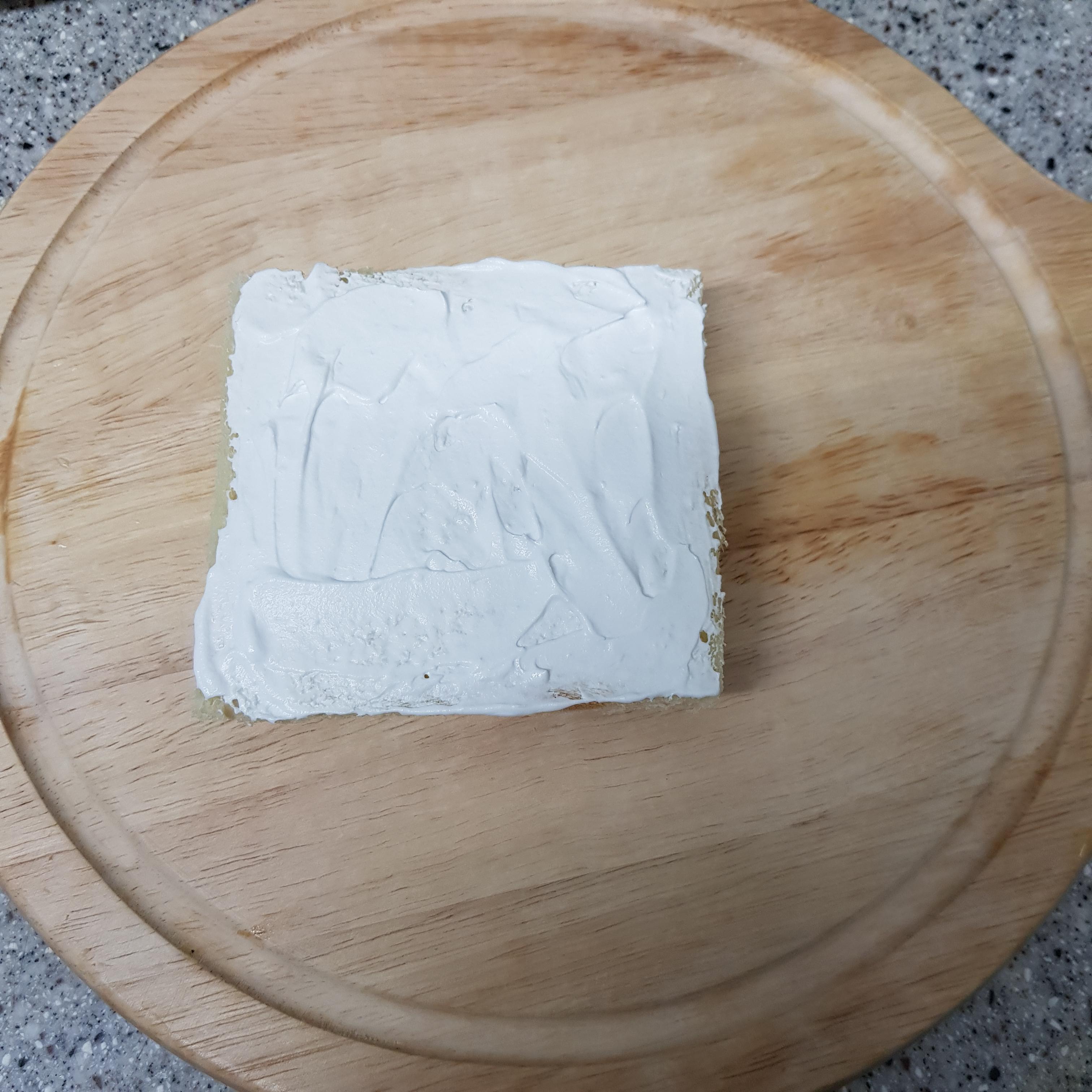 ▶ 식빵 위에 사과조림 바른 후 다른 식빵을 올려 덮어주고 그 위에 생크림을 발라주세요 개인적으로 생크림이 더 맛있긴 하지만 꿀을 얇게 펴 사용하시면 과일이 더 잘 붙어 모양이 더 예쁘답니다 취향 껏 선택해주시면 됩니다