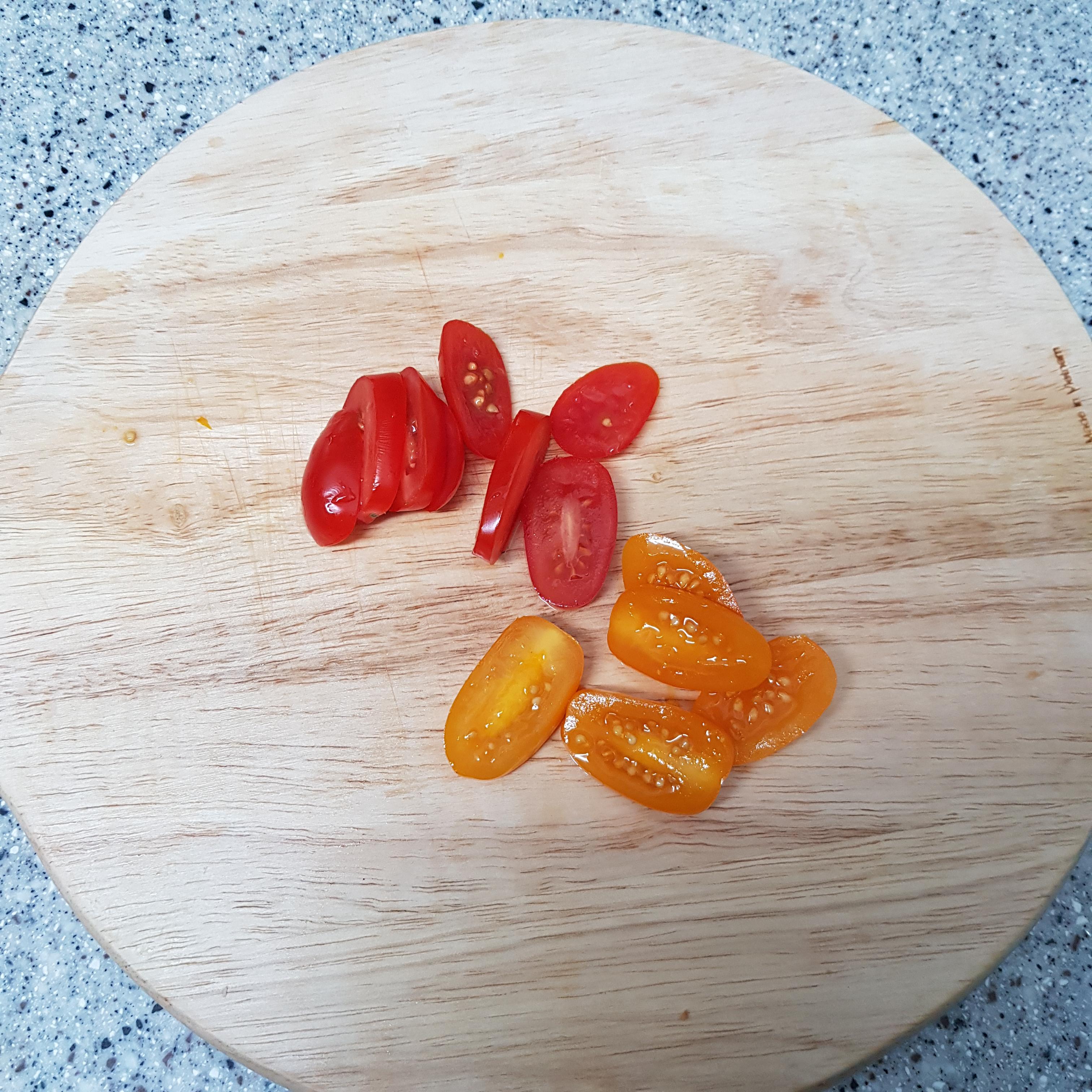 ▶ 방울토마토는 크기에 따라 3등분 또는 2등분하여 썰어주세요