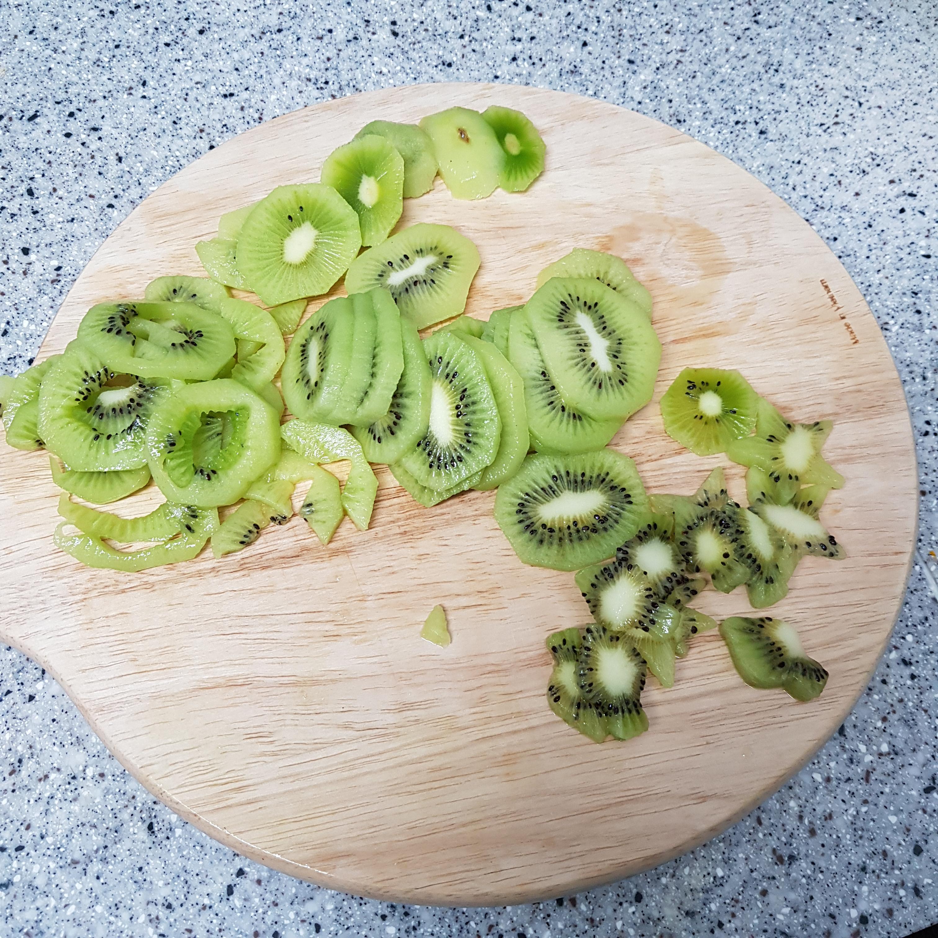 ▶ 키위는 껍질을 벗기고 최대한 얇게 썰어 준비해주세요 모양 틀을 이용하실 거면 0.5cm 정도 두께가 적당합니다