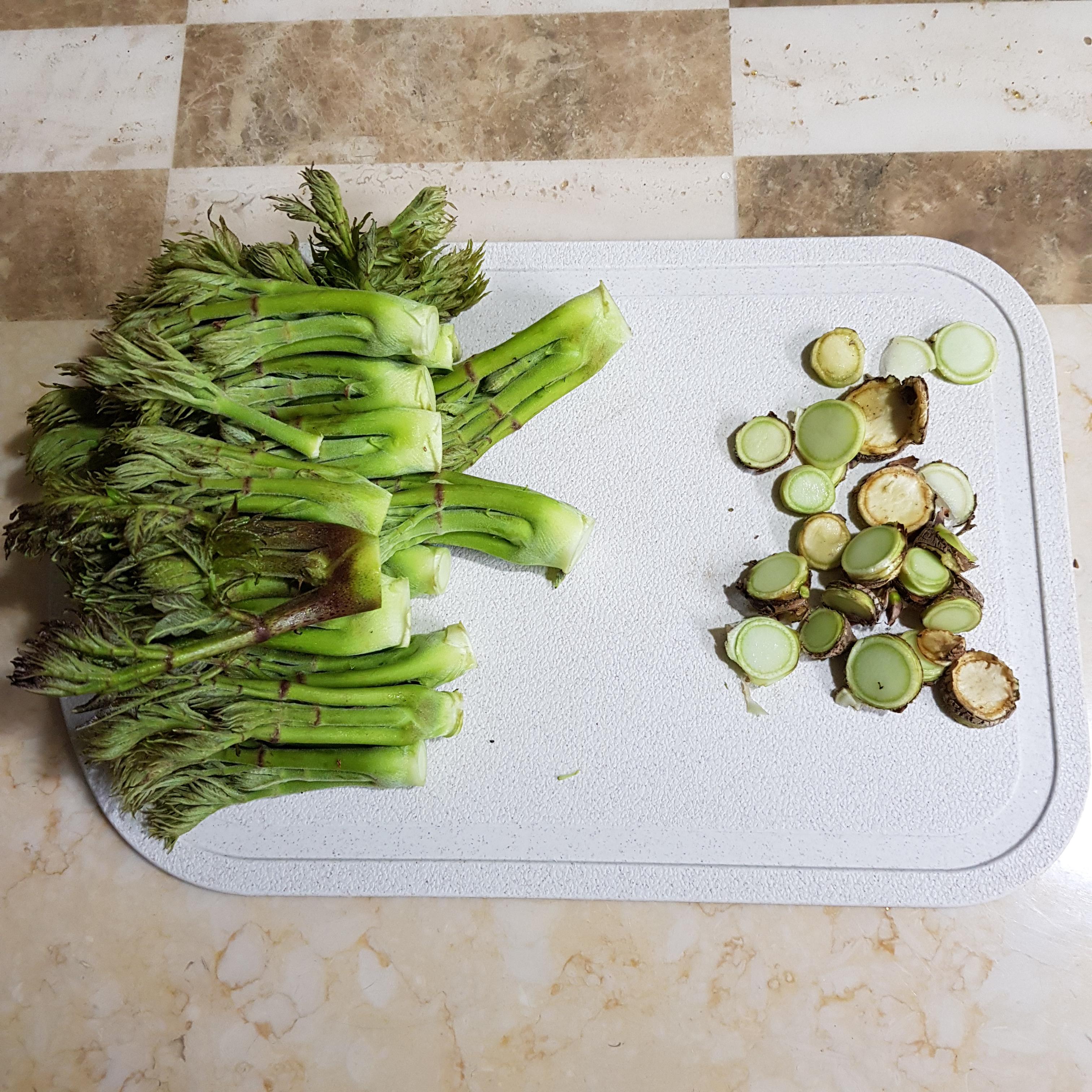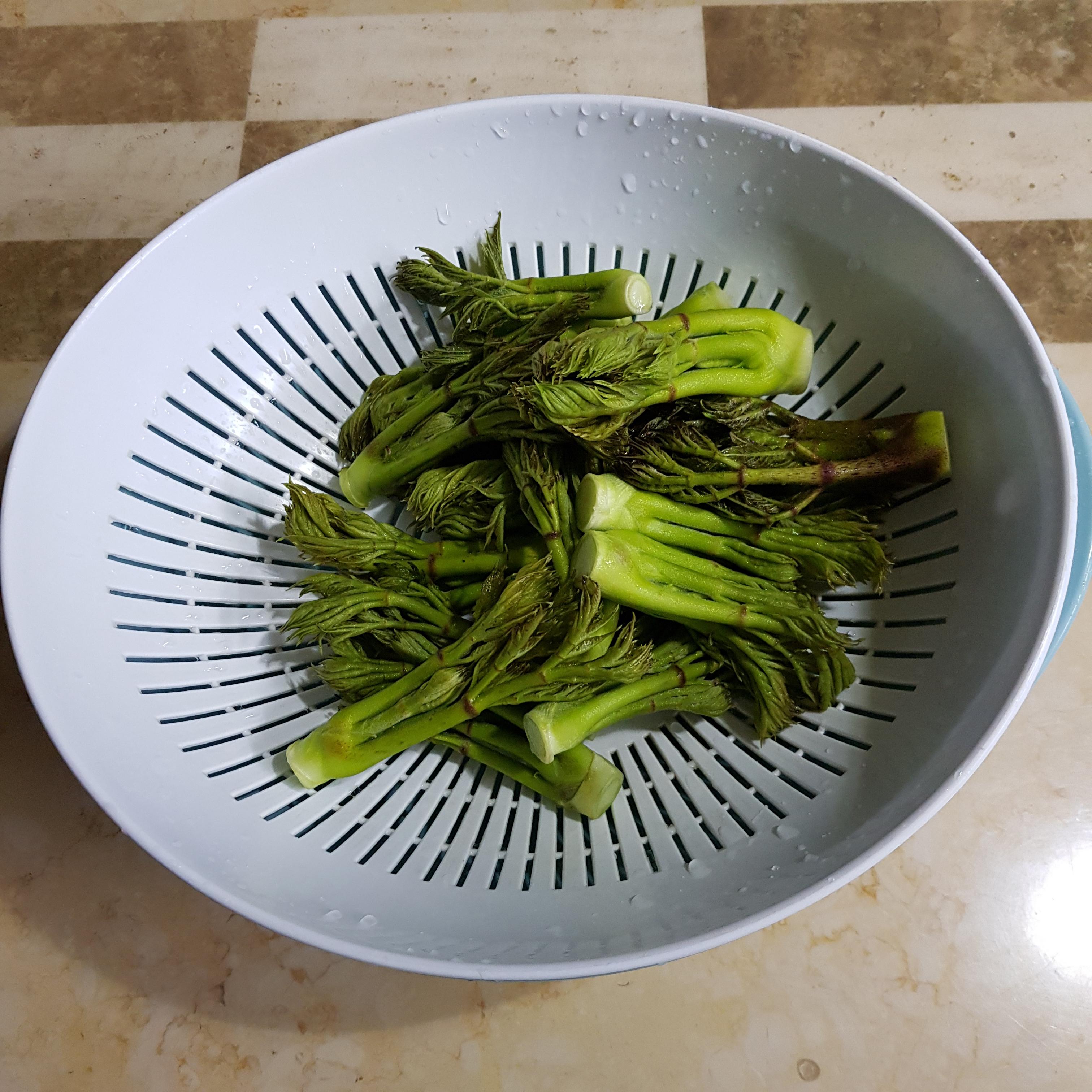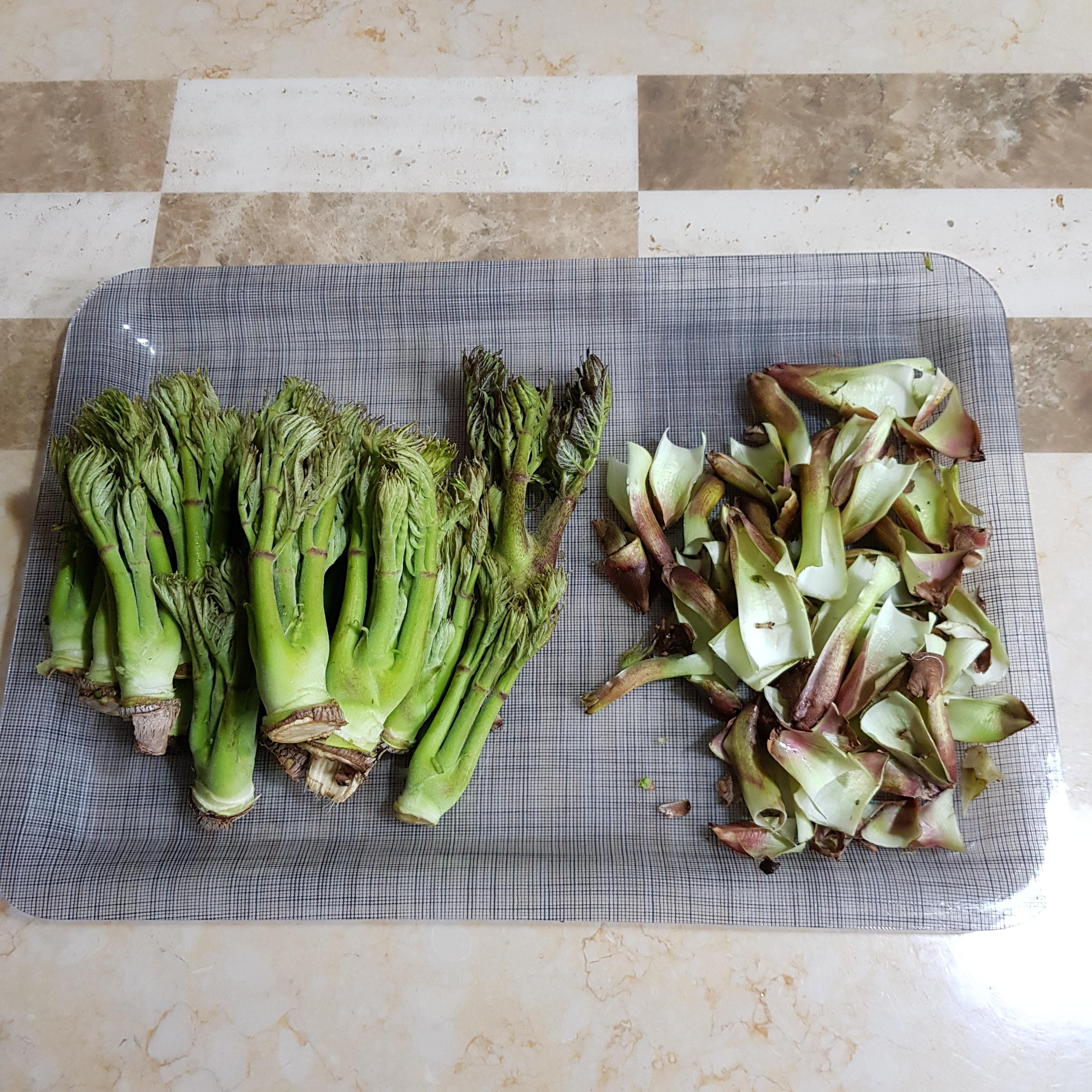 ▶ 두릅 밑동을 감싸고 있는 껍질을 벗겨주세요 참고로 두릅은 두릅나무 끝에 나는 새순으로 사포니 성분이 있어 약간의 씁쓸한 맛이 나며 비타민 C가 풍부하여 항암효과, 면역력 향상, 혈당 조절에 효과적이라고 하네요