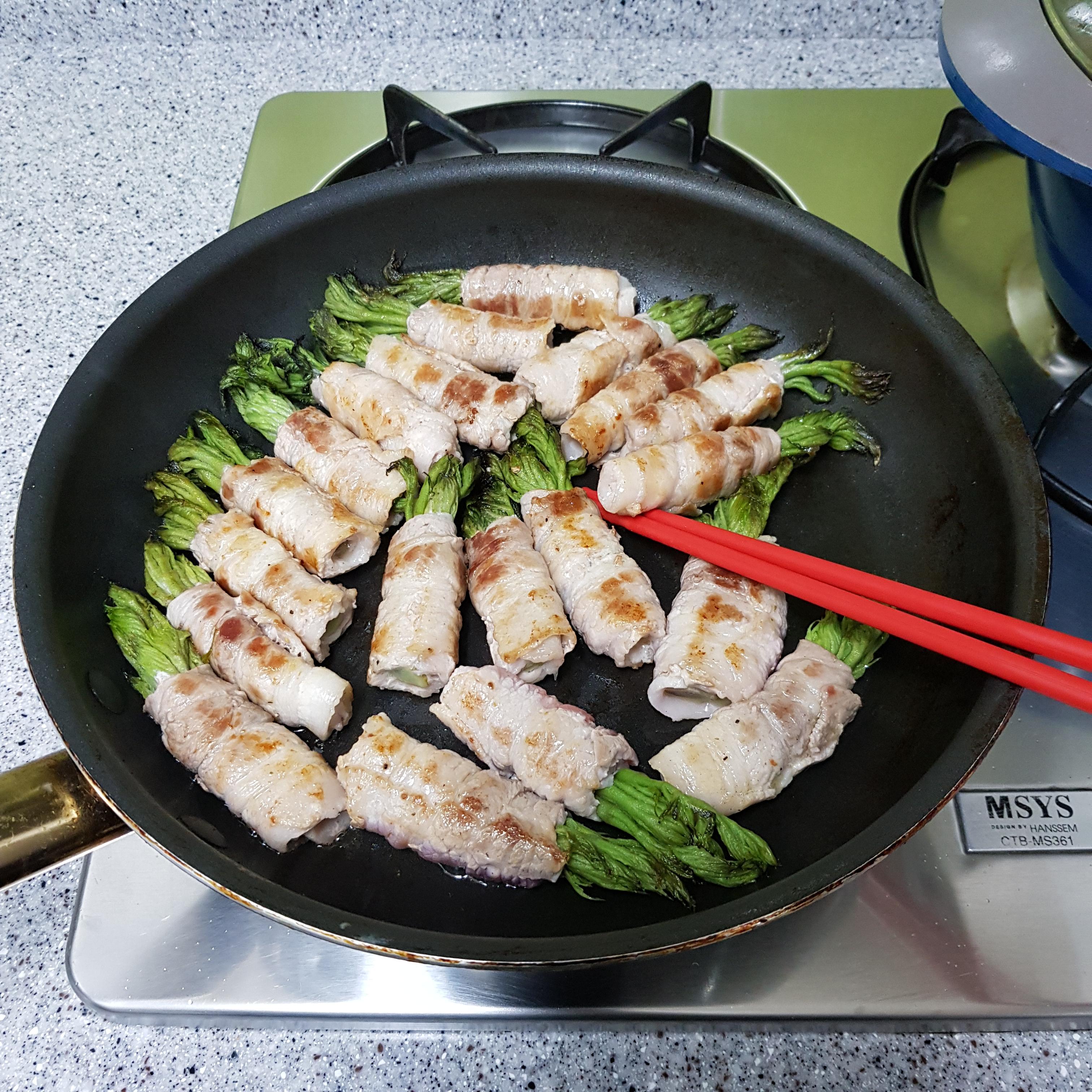 ▶ 예열된 팬에 올리브유 조금 두르고 삼겹살 끝부분(이음 부분)이 팬에 닿게 올려주세요 이음 부분을 먼저 익혀주어야 두릅과 고기가 고정되어 잘 안 풀린답니다