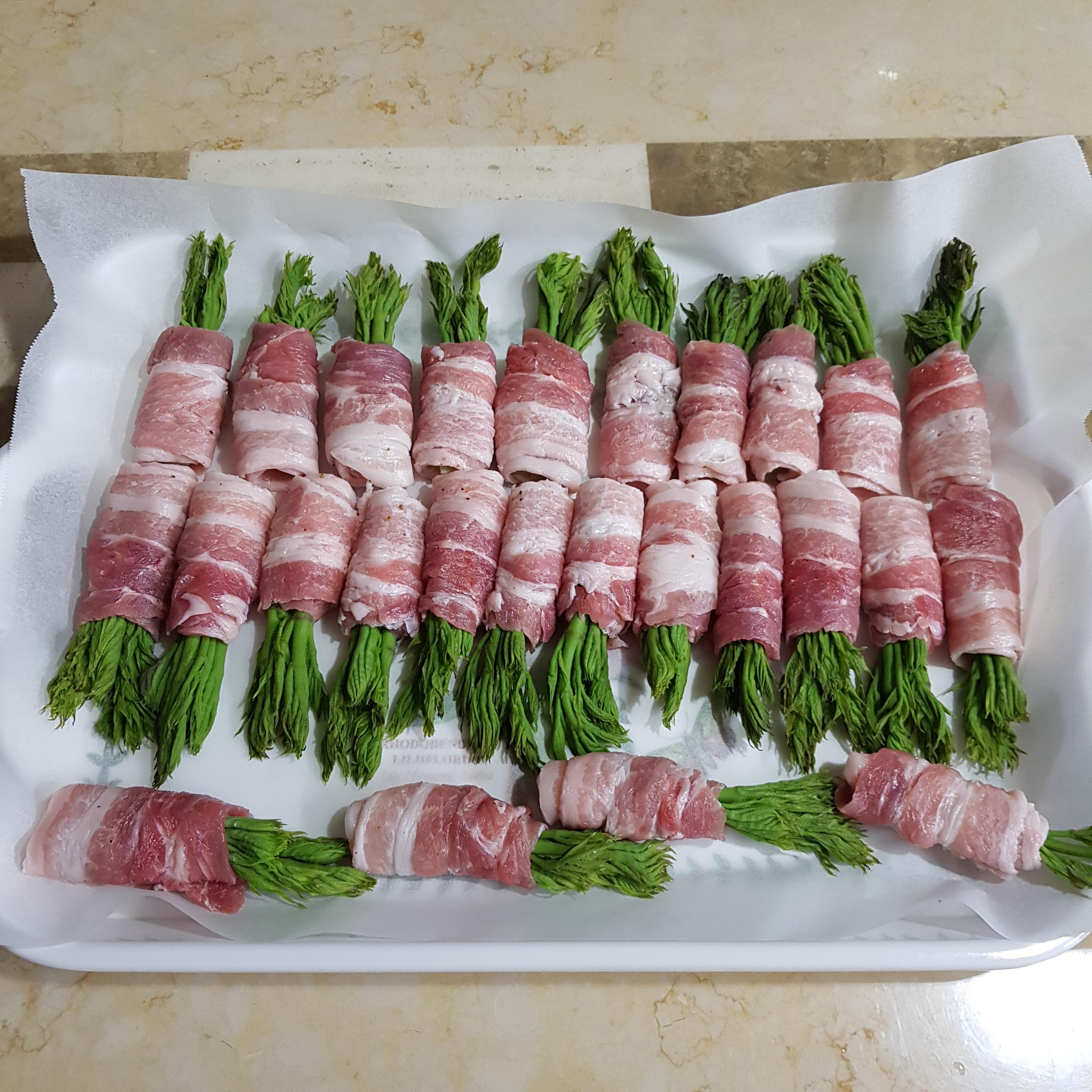 ▶ 긴 삼겹살은 반으로 자른 뒤 데친 두릅을 돌돌 말아주세요 얇게 말아야 고기와 두릅이 골고루 잘 익는답니다