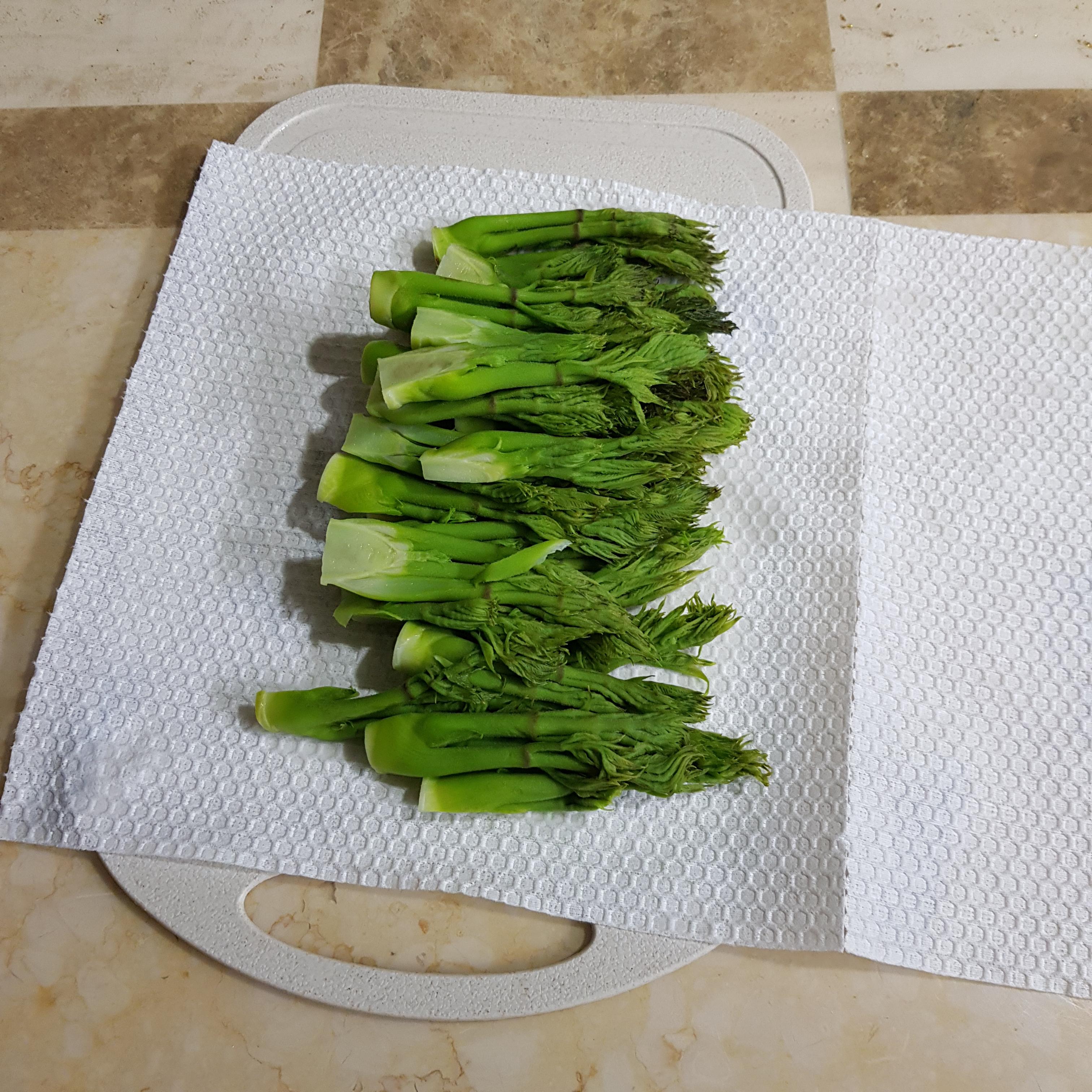 ▶ 데친 두릅은 냉수에 헹군 후 잎 부분의 물기를 짜주고 밑동을 잡고 탈탈 털어준 후 키친타월로 남은 물기도 제거해주세요