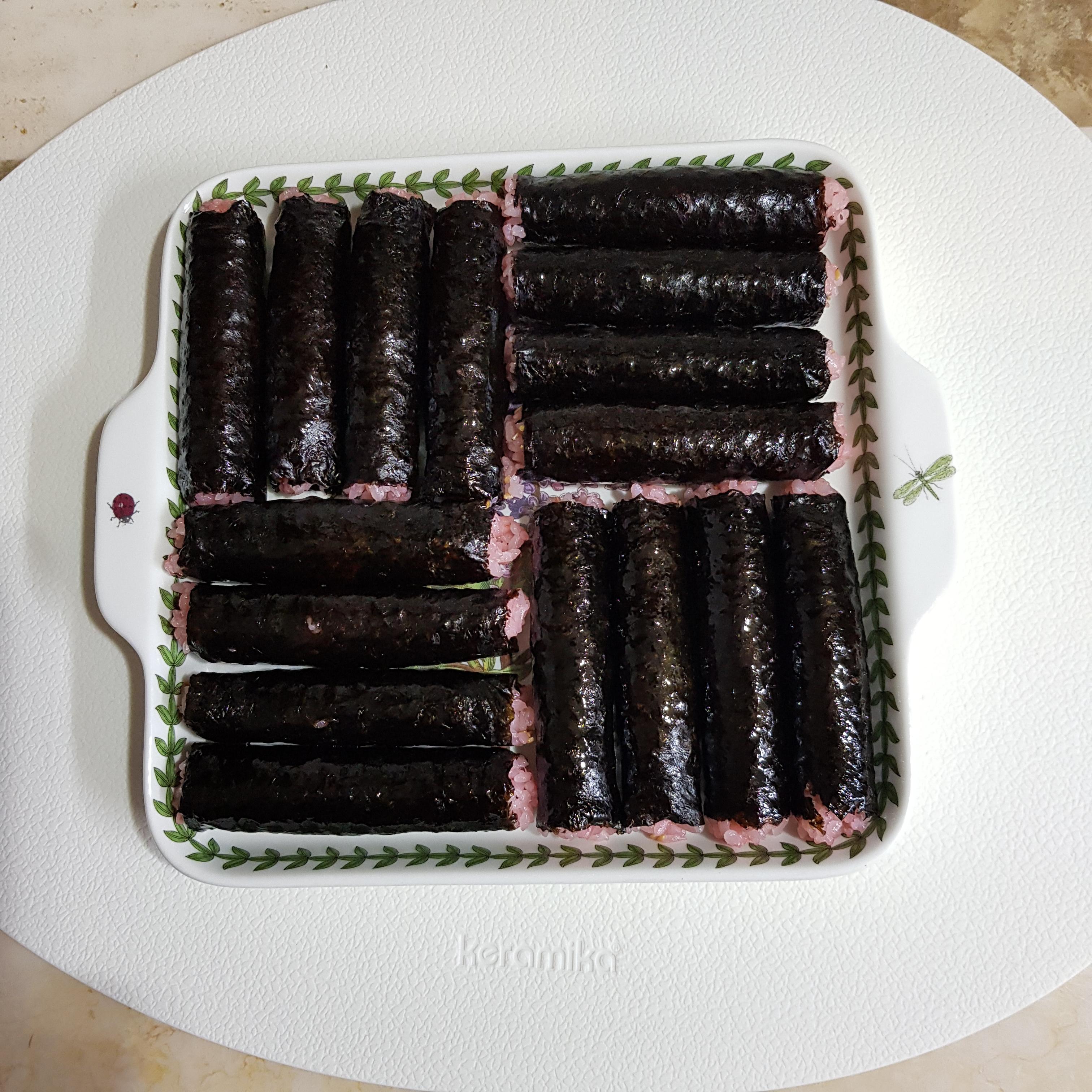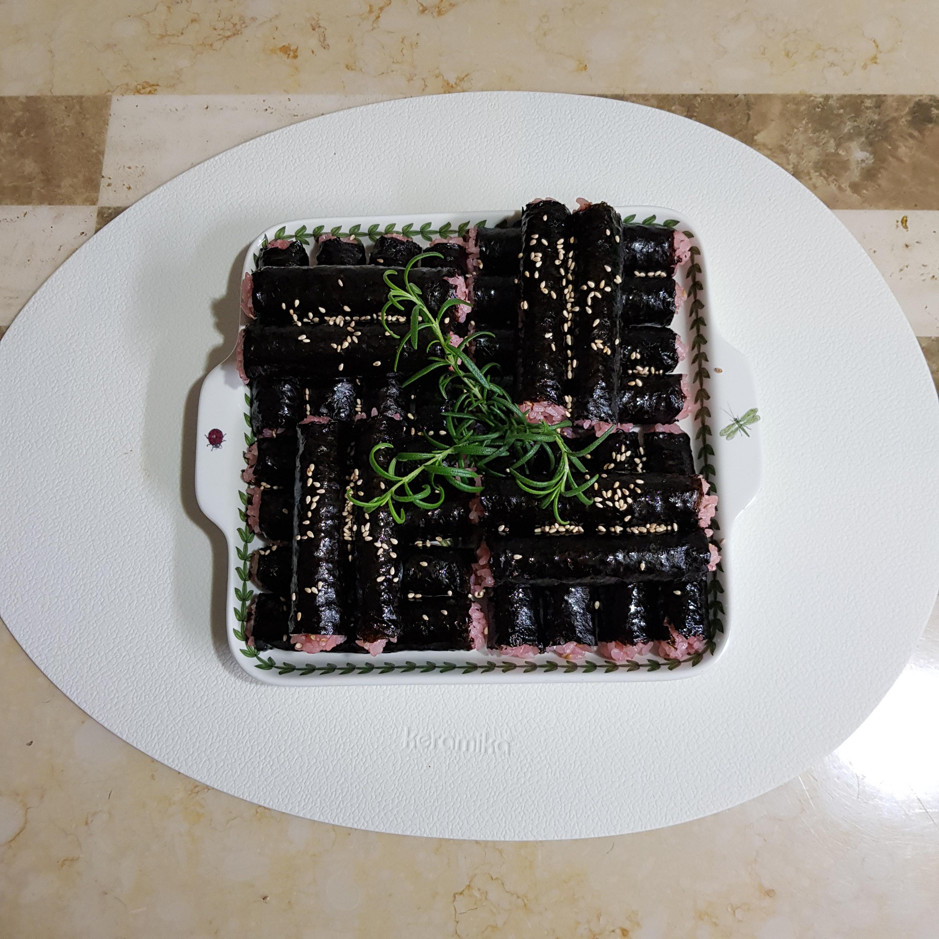▶ 저는 다 말은 김밥 위에 참기름 살짝 발라 고소한 맛과 윤기를 더해주고 접시에 예쁘게 담아봤습니다