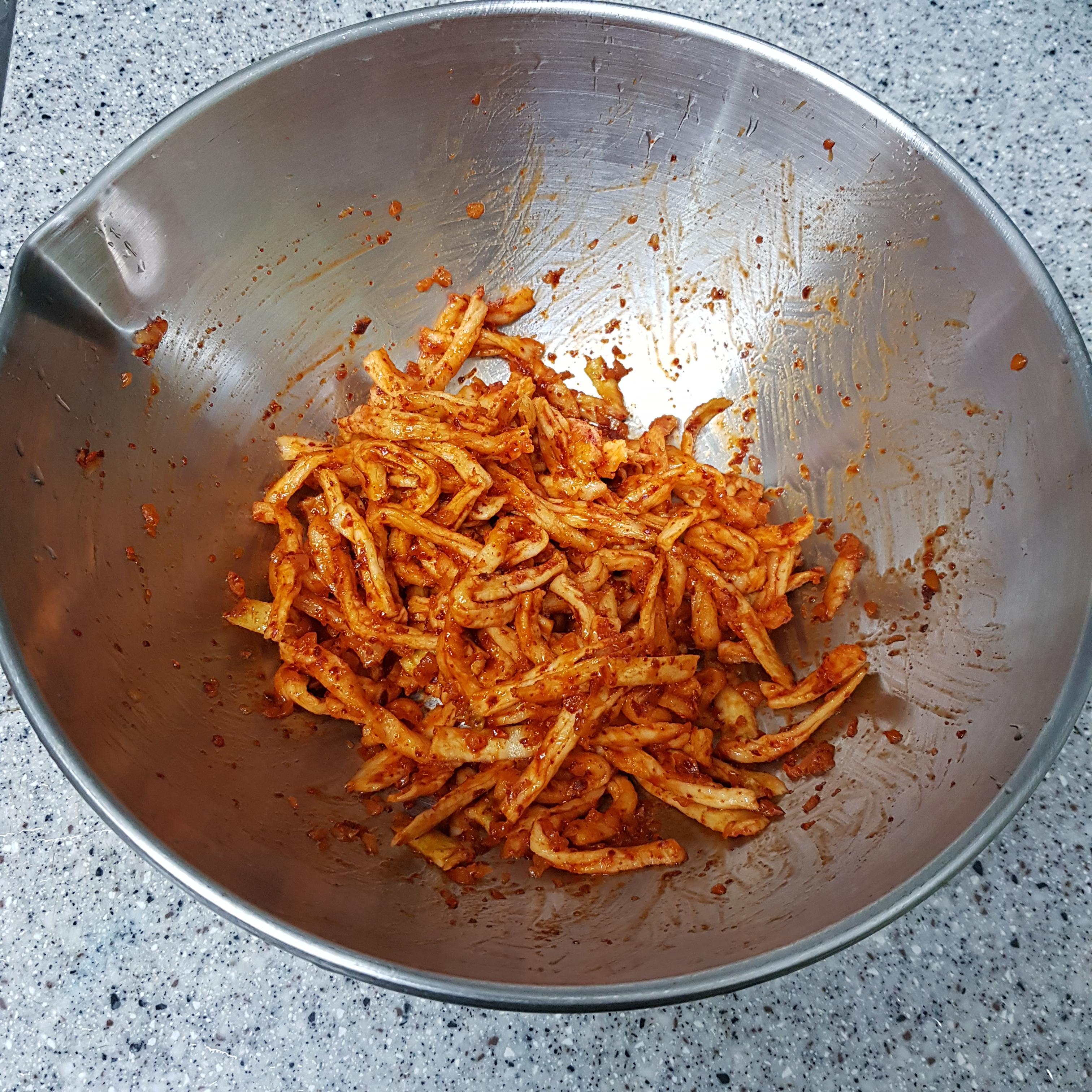 ▶ 불린 무말랭이는 고춧가루 1큰술, 매실액 1큰술, 다진 마늘 반큰술, 양조간장 1큰술, 멸치액젓 1큰술 넣어주세요