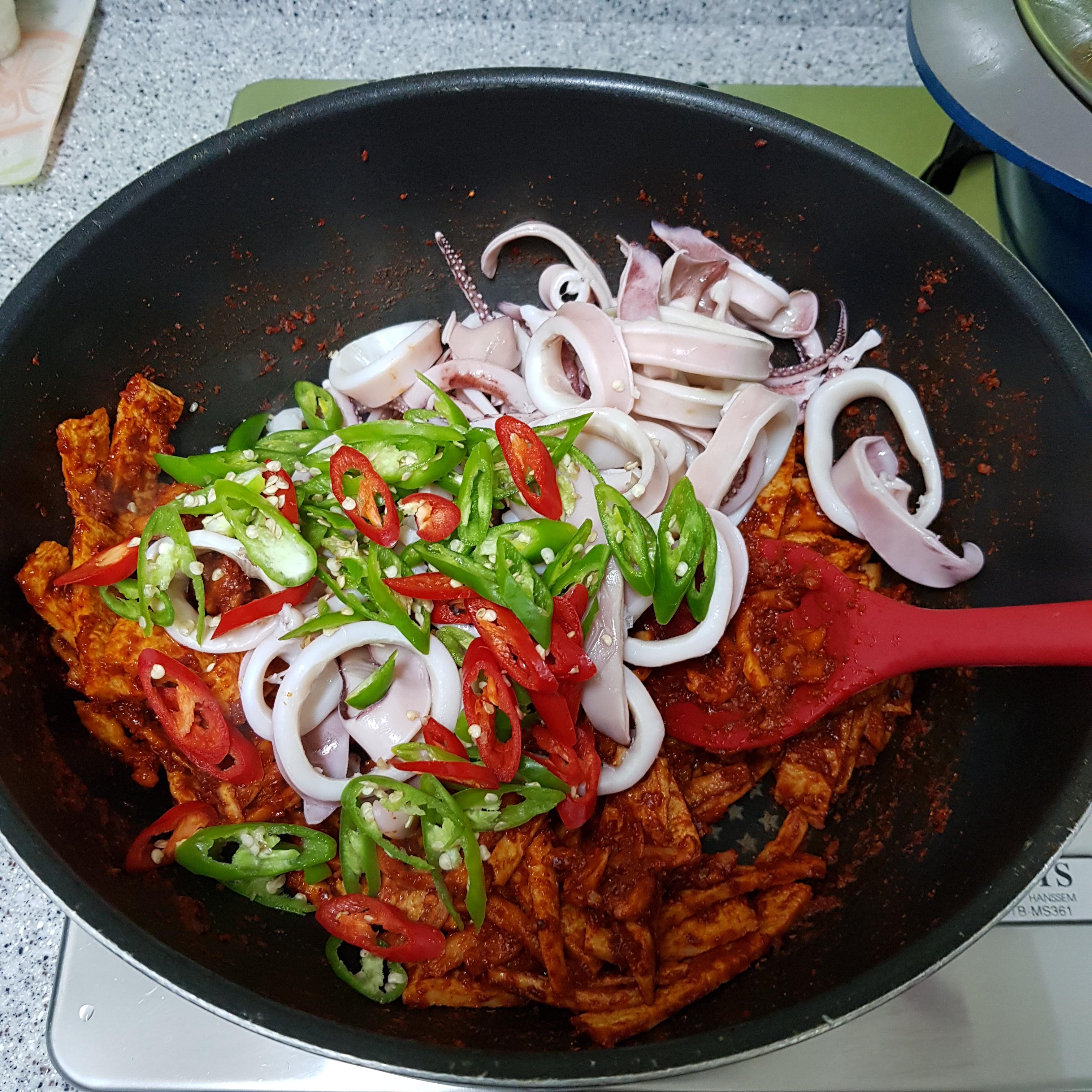 ▶ 준비한 오징어, 청양고추, 홍고추, 멸치액젓 2큰술, 양조간장 2큰술, 고춧가루 1큰술, 다진 마늘 반큰술, 설탕 반큰술 넣고 볶아주세요