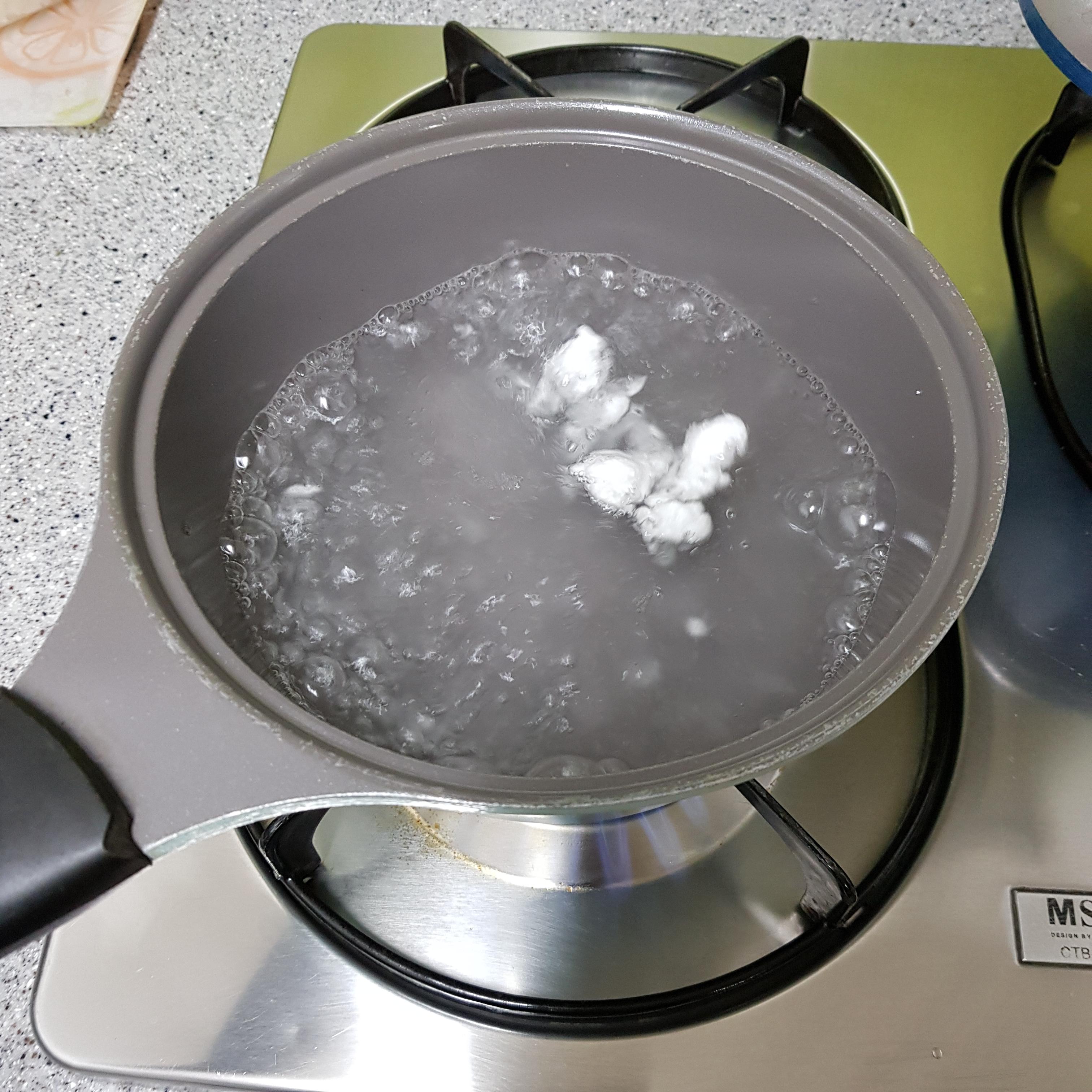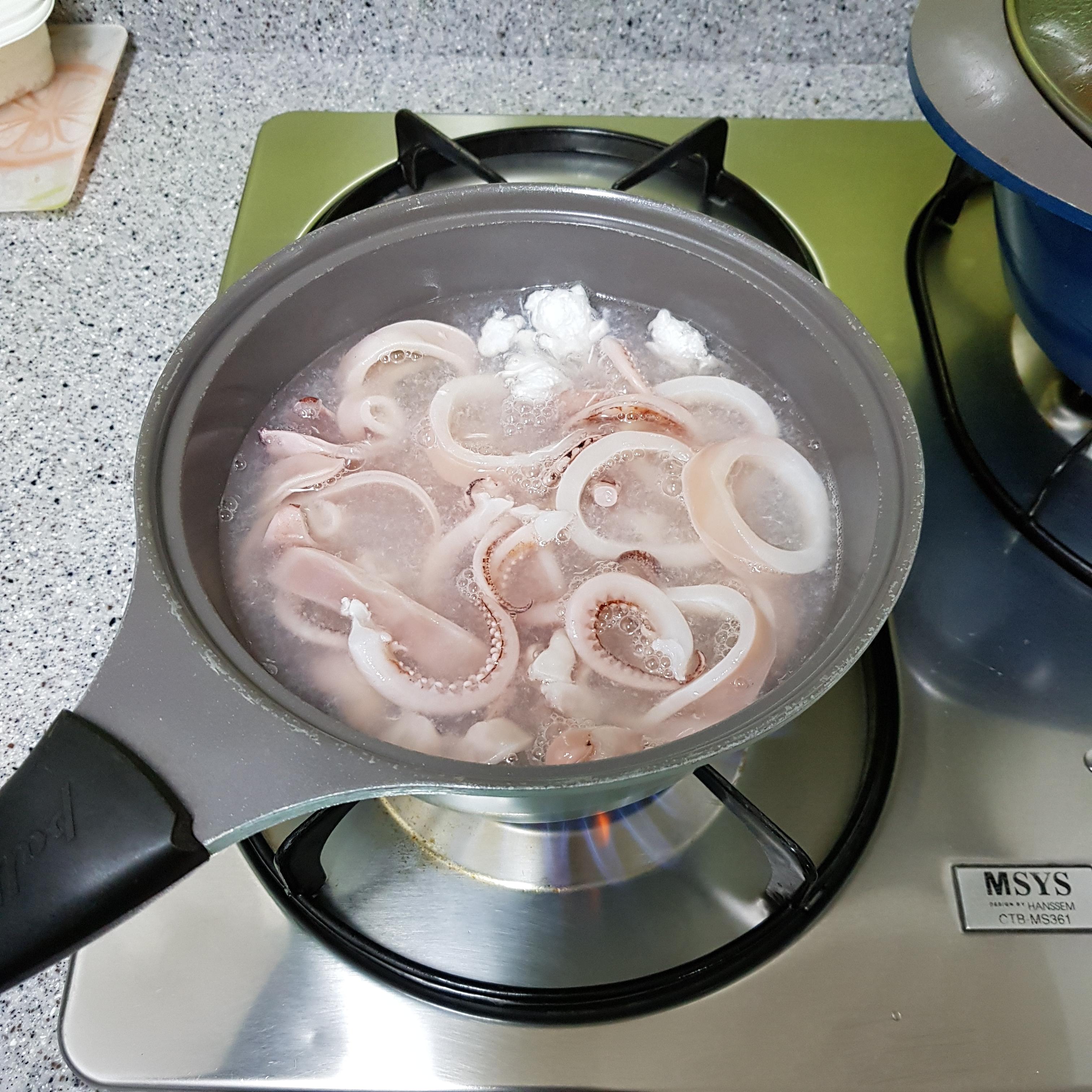 ▶ 썰인 오징어는 물이 끓어오르면 전분가루 1큰술 넣고 딱 10초만 데쳐주세요 참고로 끓는 물에 전분 1큰술을 넣고 데치면 오징어가 부드럽고 쫄깃해진다고 하네요 저도 이번에 처음 해봤답니다