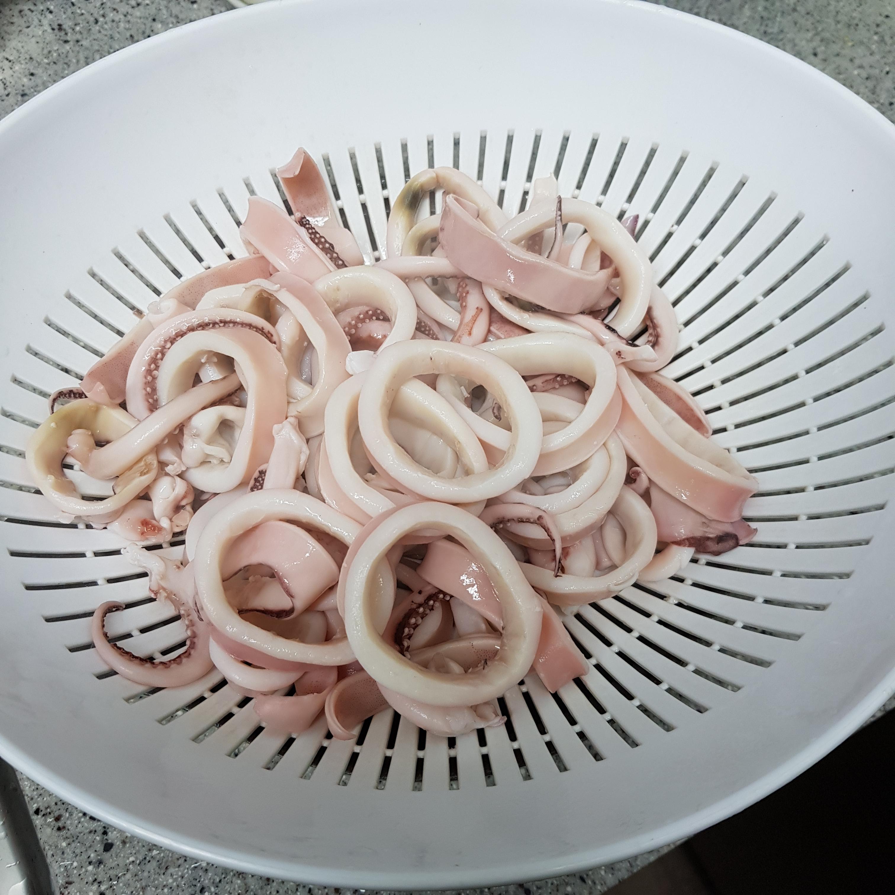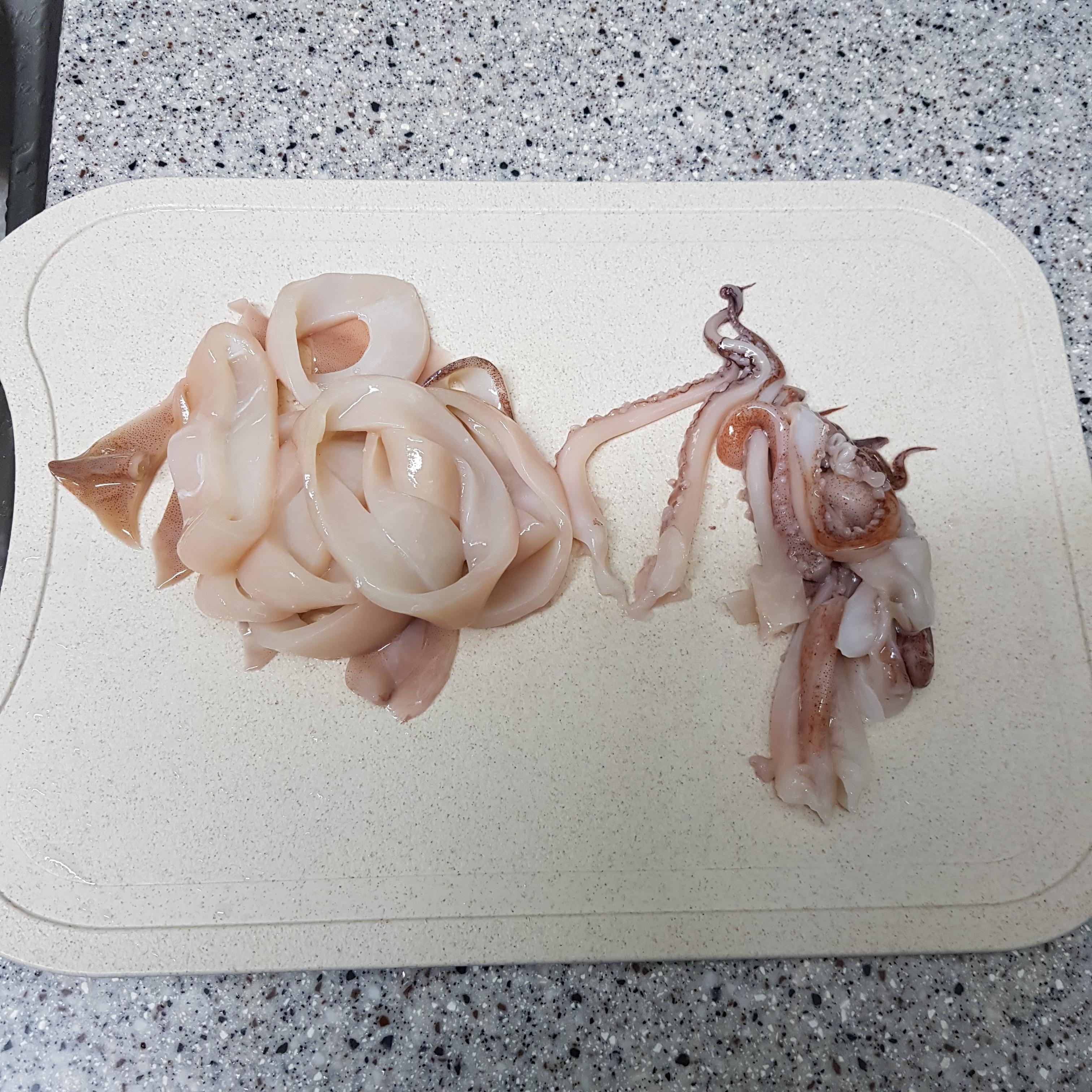 ▶ 껍질 제거한 오징어는 깨끗이 씻은 후 몸통은 링 모양으로 1cm 두께로 썰어주고 오징어 다리는 먹기 좋은 사이즈로 썰어주세요
