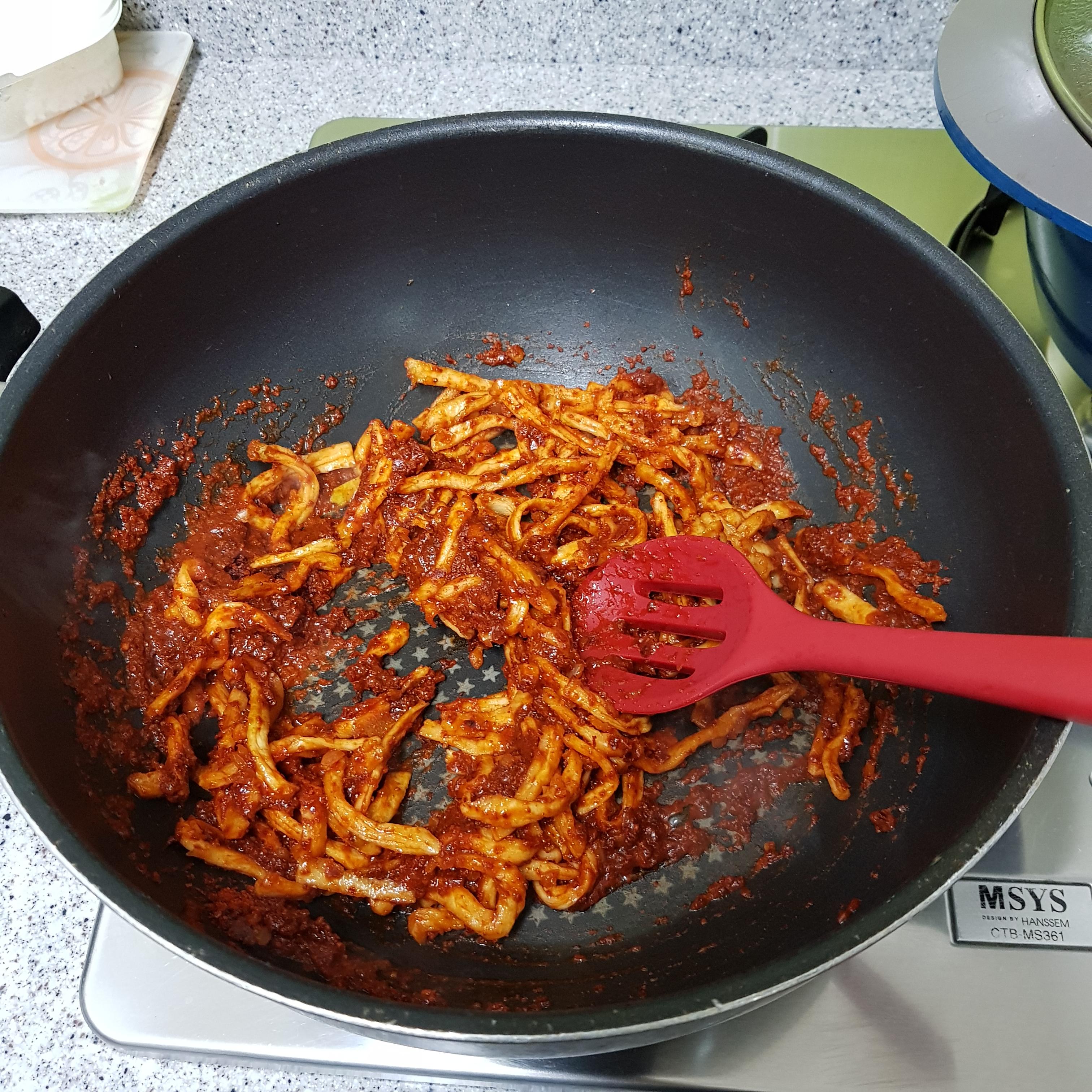 ▶ 볶음 할 때 양념이 타지 않게 물 반컵을 조금씩 부어주면서 볶아준 후 불을 끄고 참기름 1큰술, 통깨 2큰술 넣고 골고루 섞어주세요