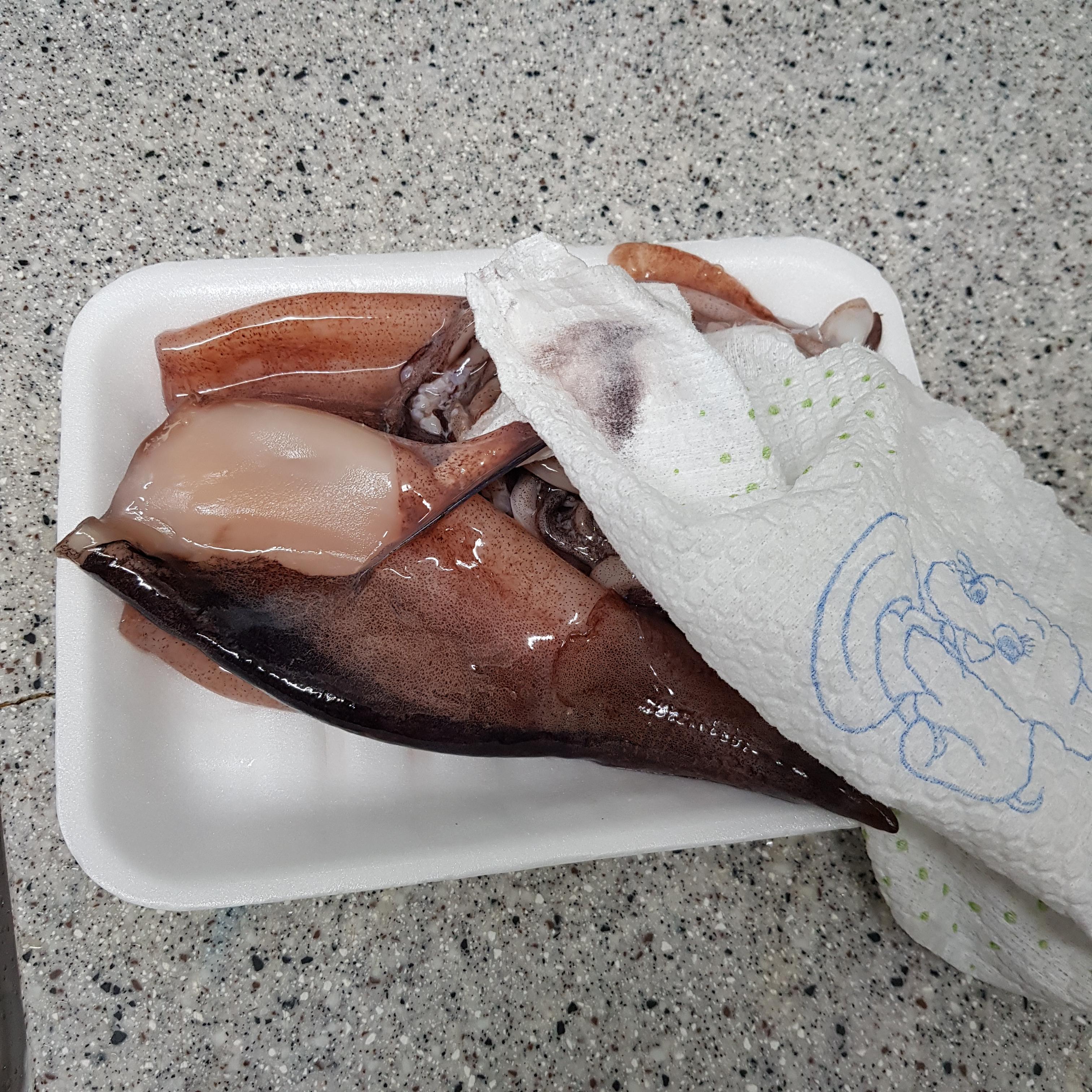▶ 내장 제거한 오징어를 구입해 소금 또는 키친타월을 이용해 껍질을 벗겨주세요