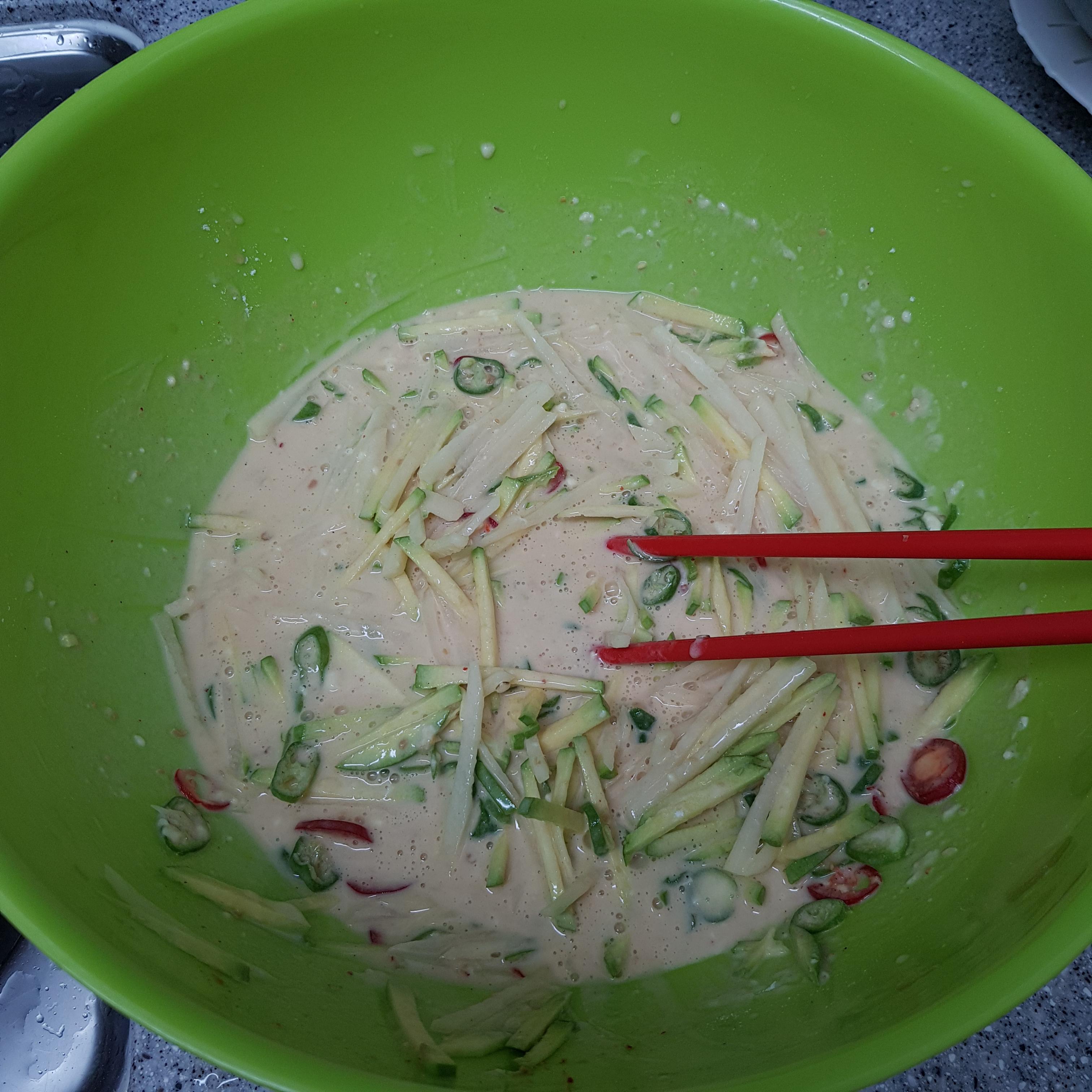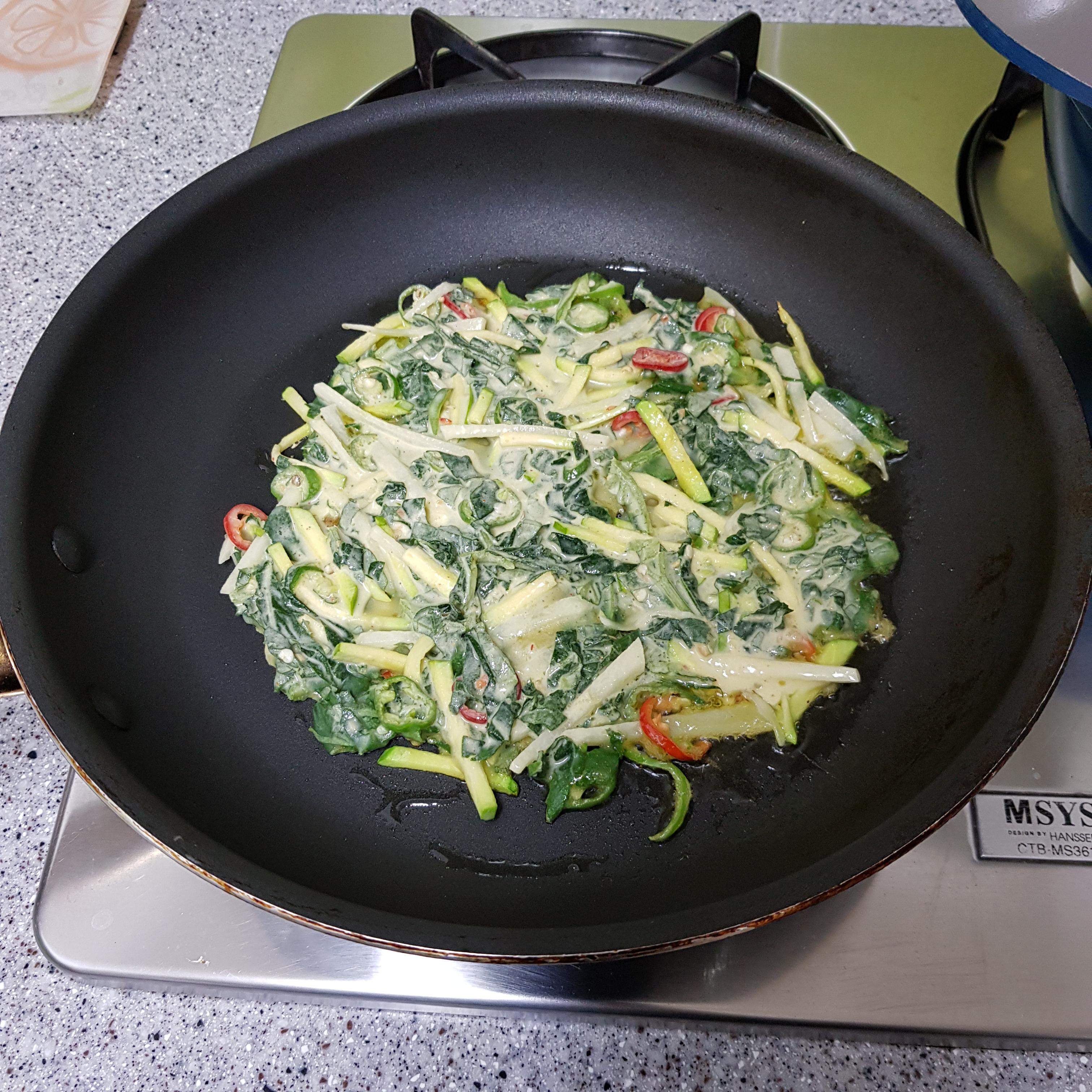 ▶ 마지막으로 가늘게 썬 호박잎 넣고 골고루 섞어주세요 반죽은 조금 무르게 해 주시는 게 좋아요