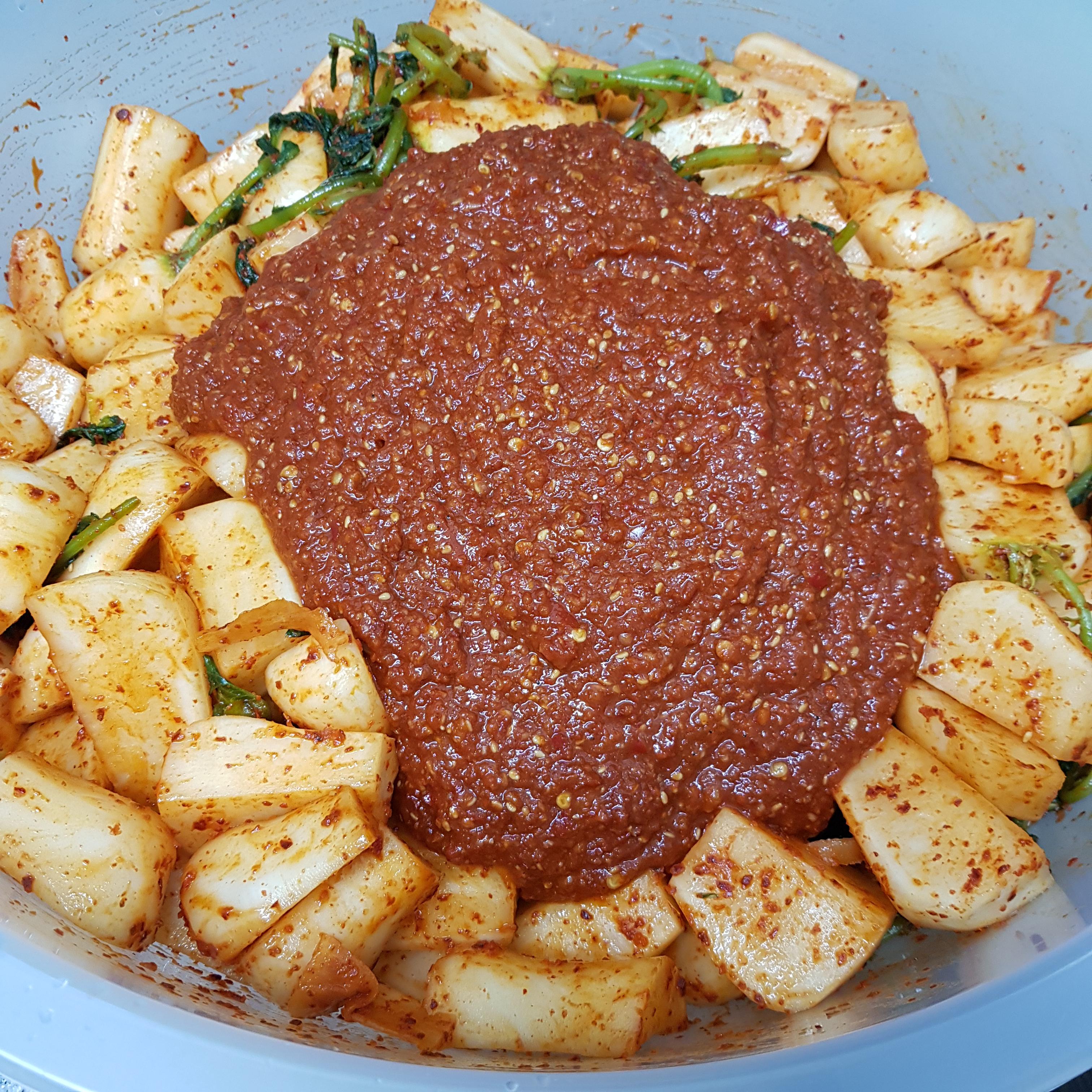 ▶ 섞어 준비한 양념에 매실액 3큰술, 멸치액젓 5큰술 넣고 골고루 섞어주면 봄 알타리김치 총각김치 만드는 법 양념장 완성입니다