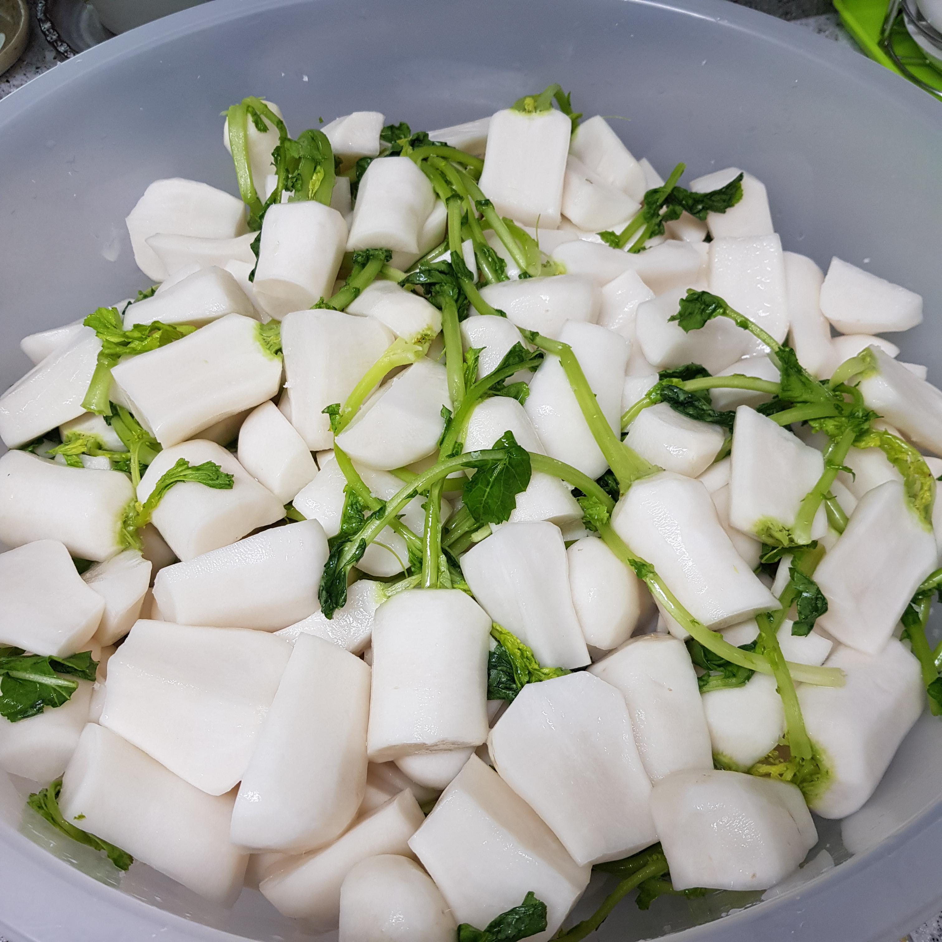 ▶ 알타리는 큰 것은 4등분으로 자른 후 다시 반으로 잘라주세요 이 과정은 취향껏 해주시면 되는데 저는 조금 잘게 잘라 바로 먹기 편하게 손질해주었어요 자른 무는 씻어준 후 천일염 1컵 반과 소주 2컵을 넣어 골고루 절여주세요