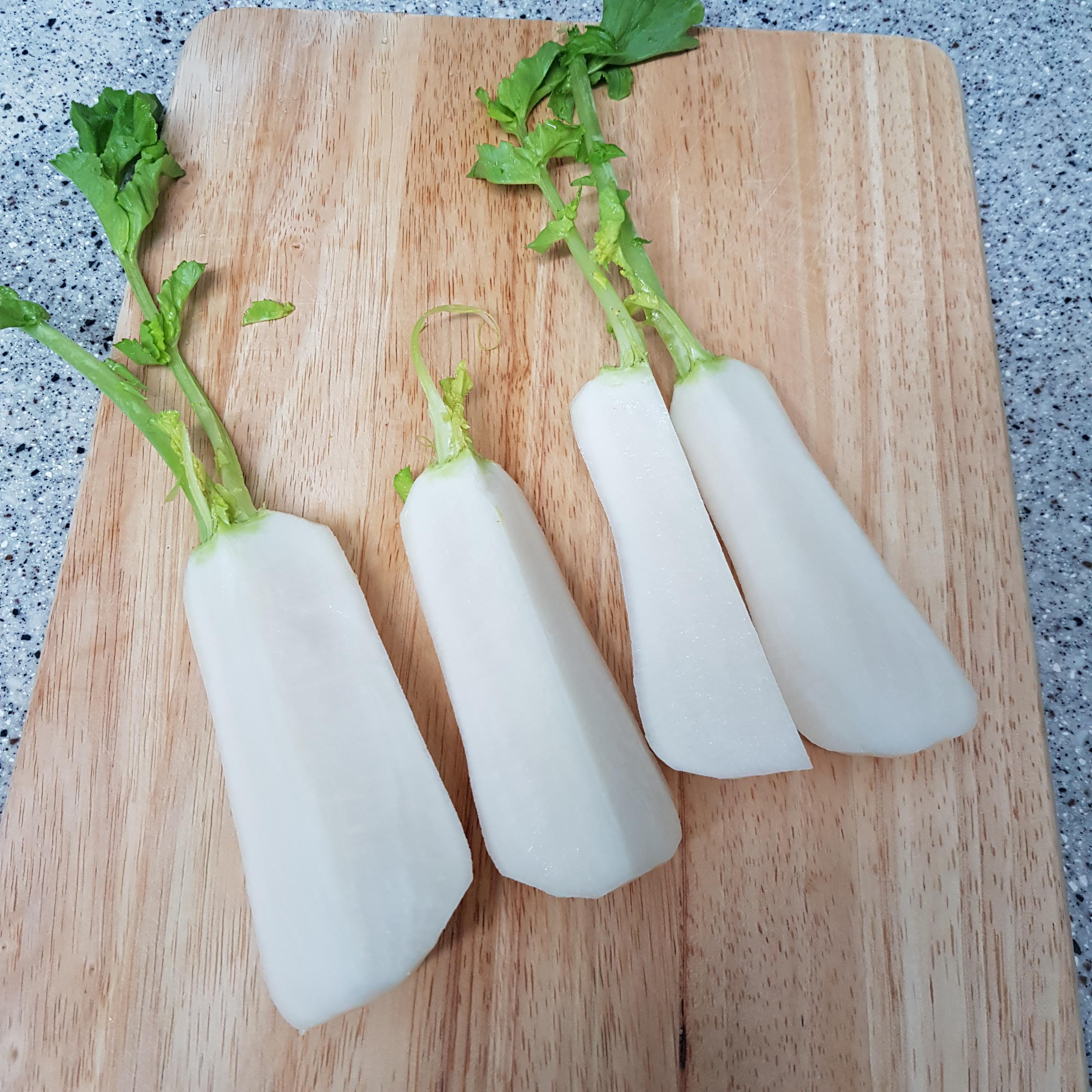 ▶ 씻은 알타리는 껍질을 벗겨주고 사진과 같이 무와 무청 경계의 검은 부분을 칼로 제거해주고 무청 끝 부분도 잘라서 준비해주세요