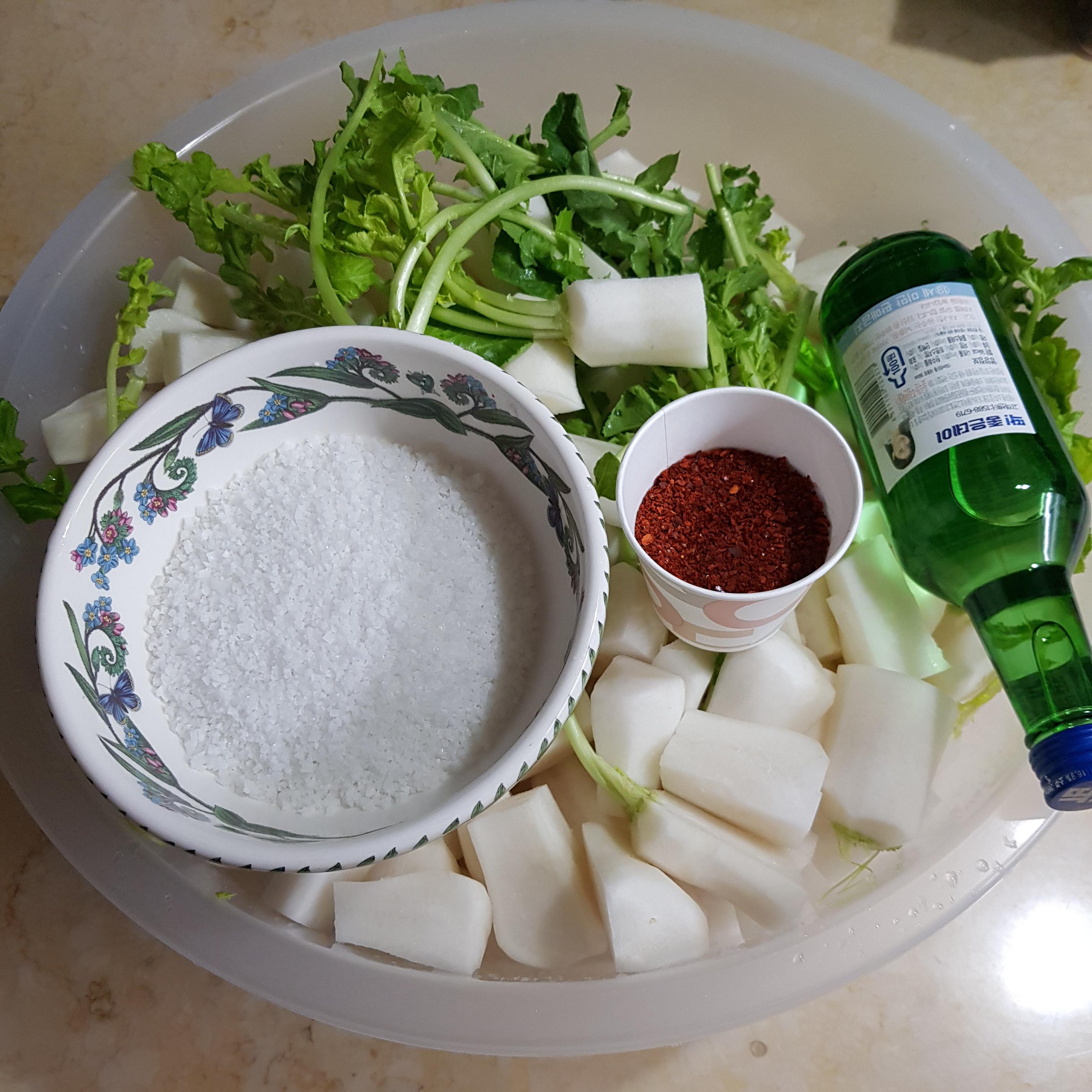 알타리 4단, 천일염 1컵 반(알타리 절임용), 소주 2컵(알타리 절임용), 고운 고춧가루 반컵(색 입힘용)